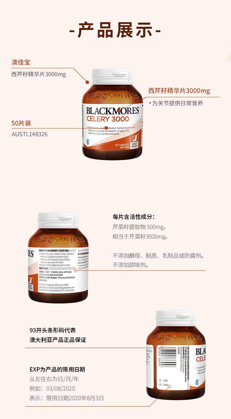 【保税仓】澳大利亚BLACKMORES澳佳宝芹菜籽精华3000mg 50片(有效期至24年7月)