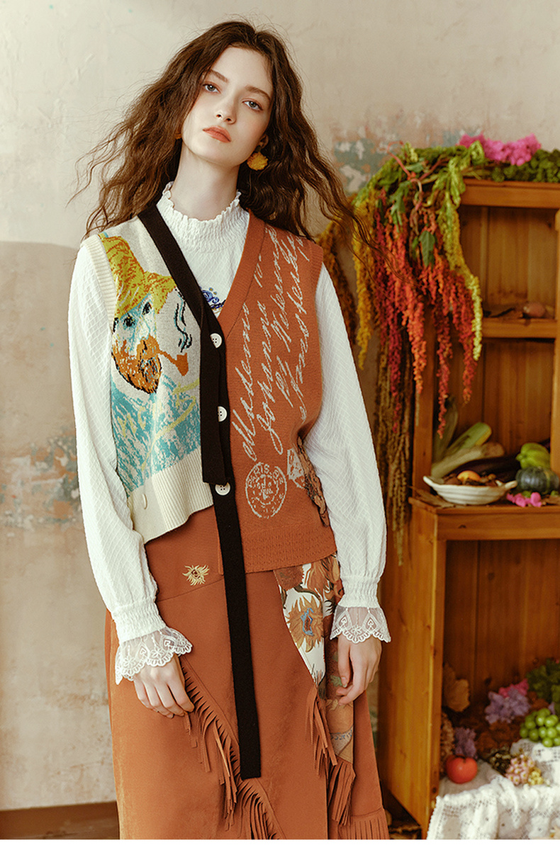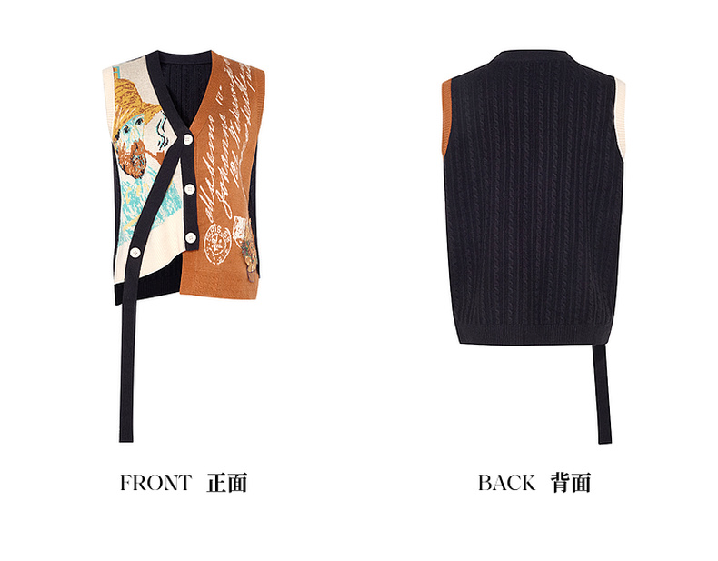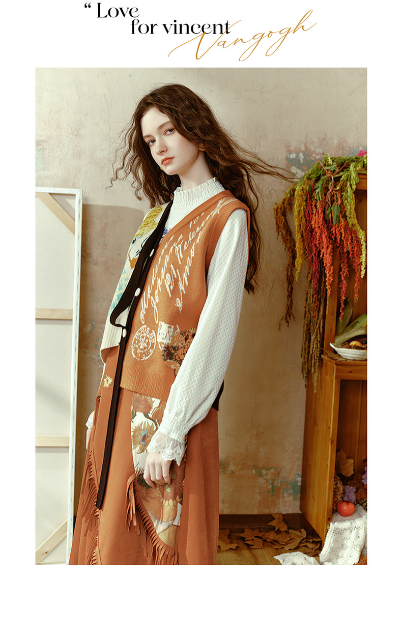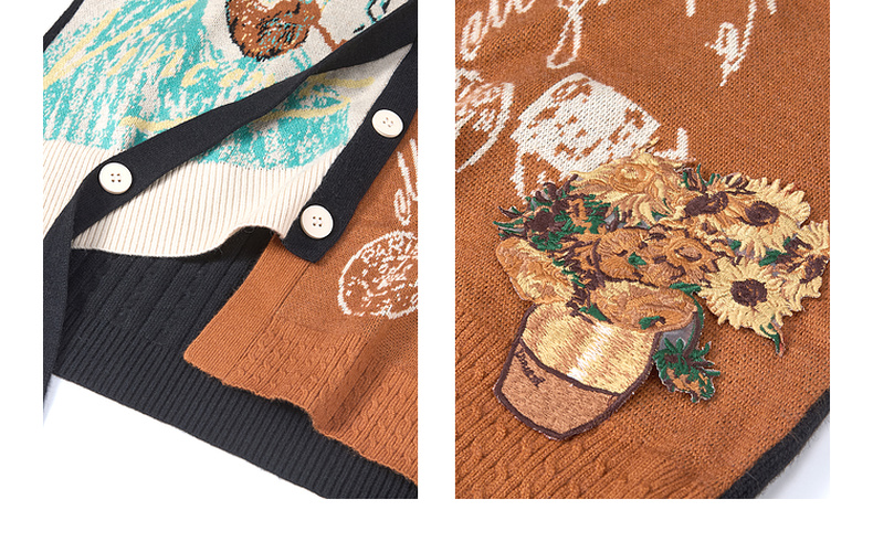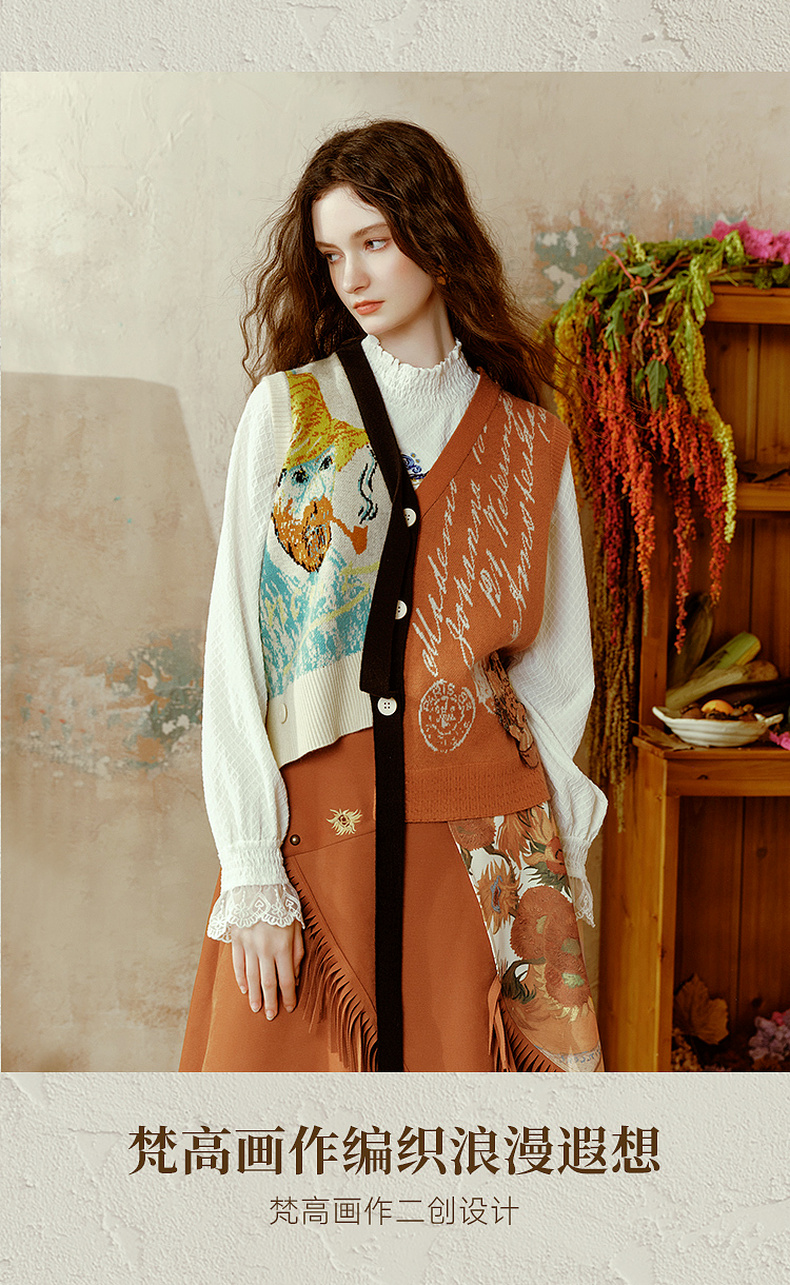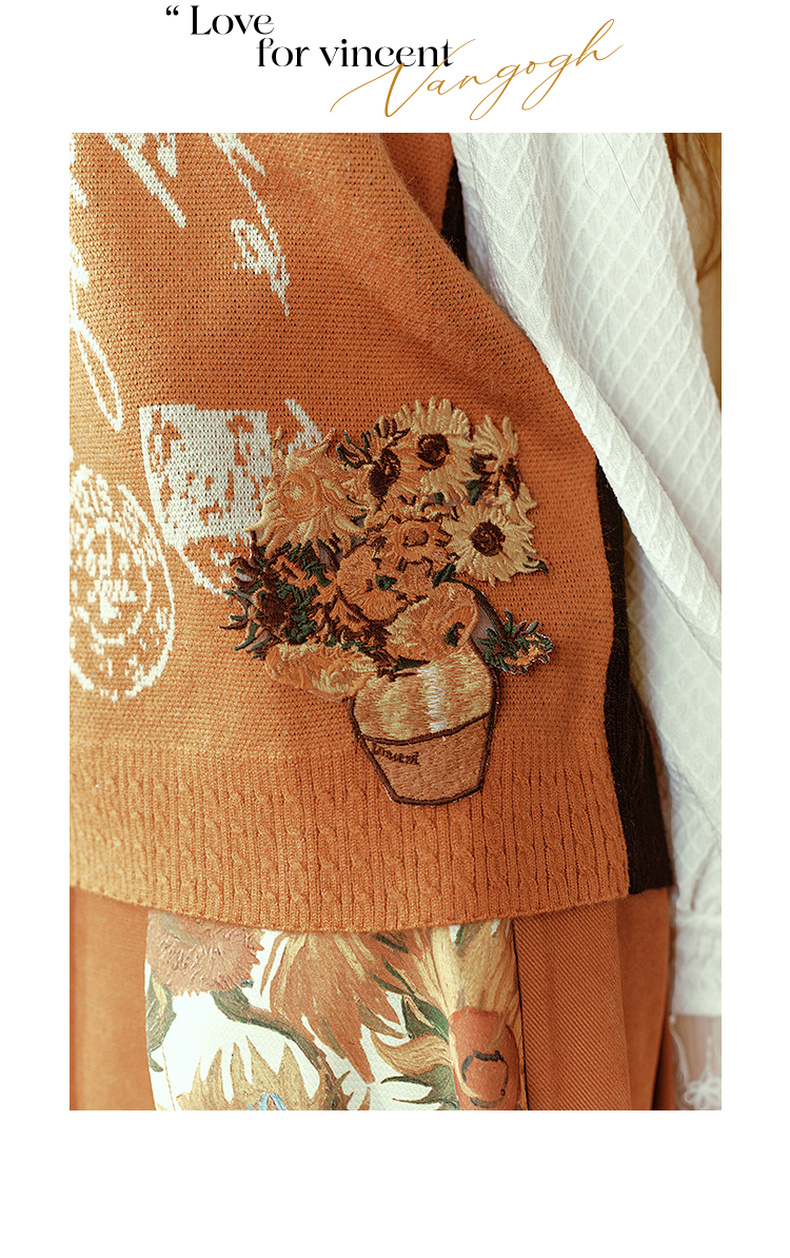 两三事梵高文艺 梵花拾忆 2024冬季新款绣花不对称无袖针织开衫女