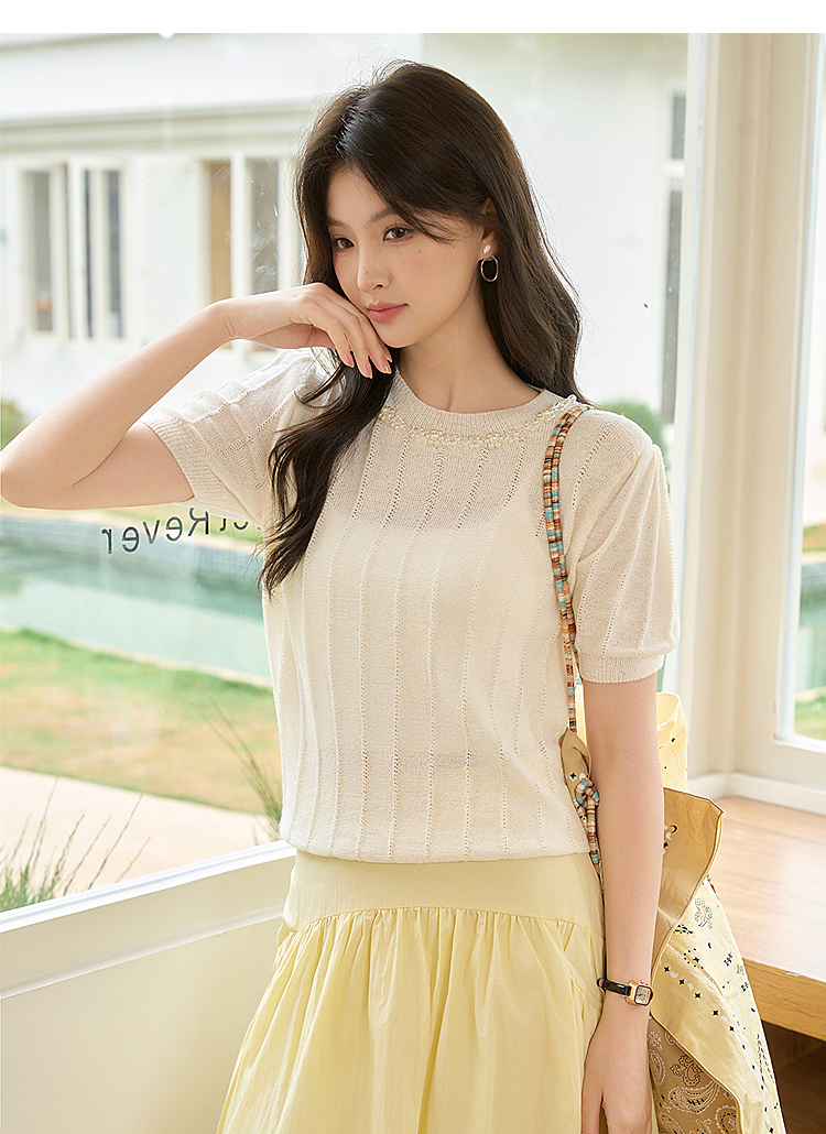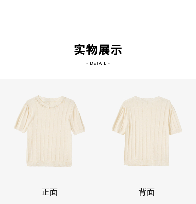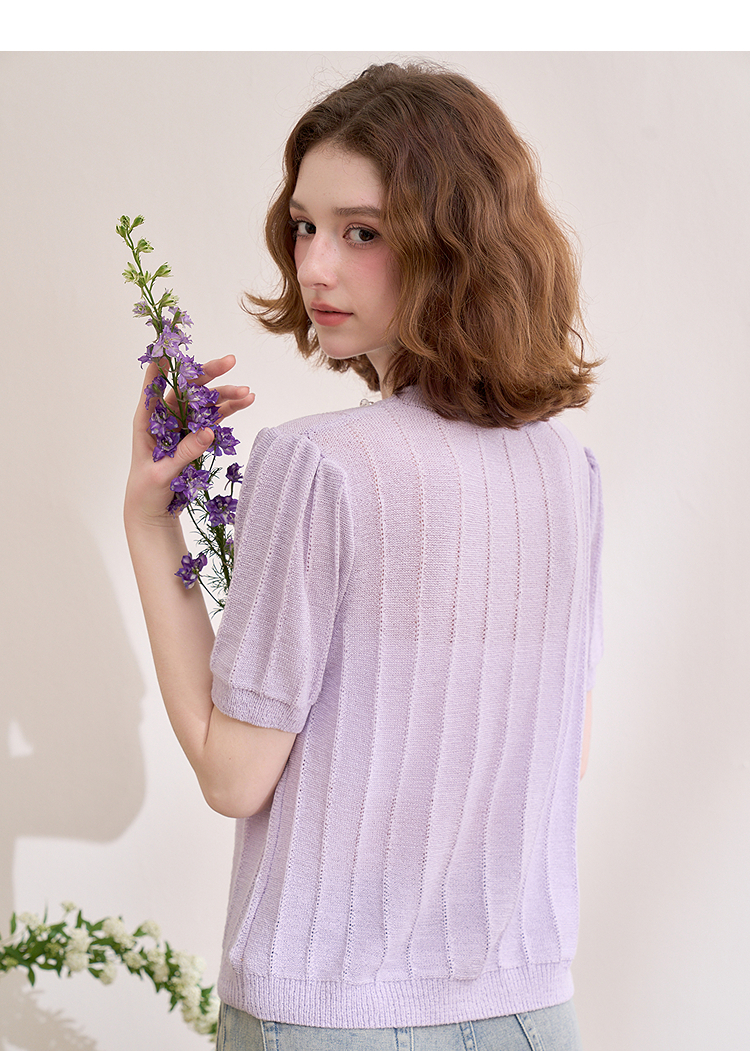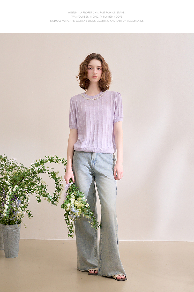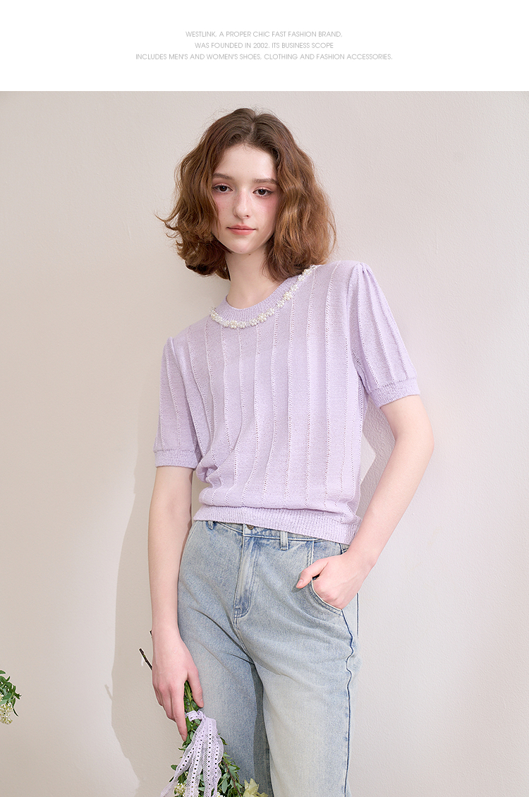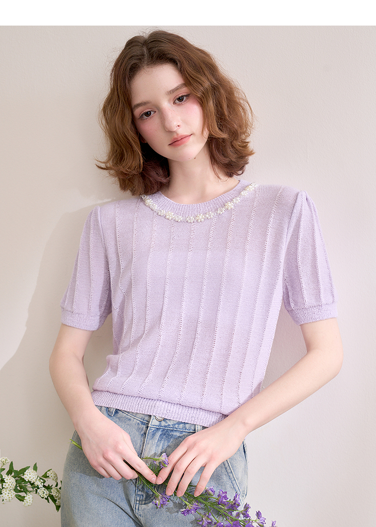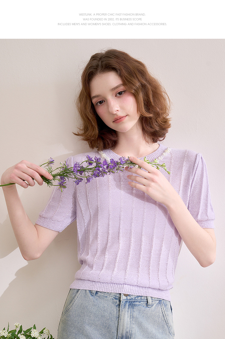 西遇薄款短袖毛衣女新款珍珠领坑条紫色圆领短款针织衫D0050385