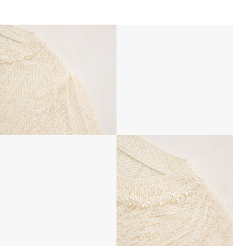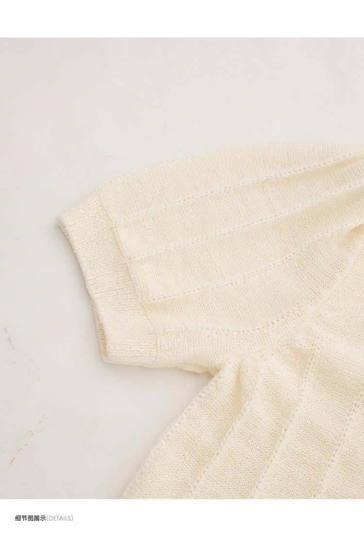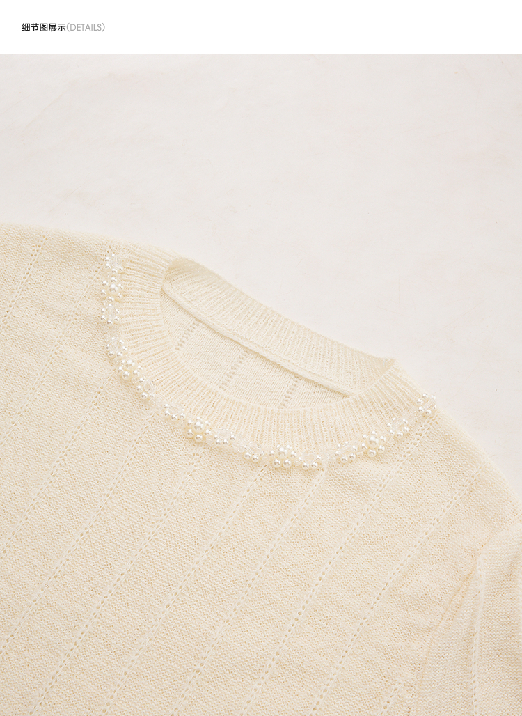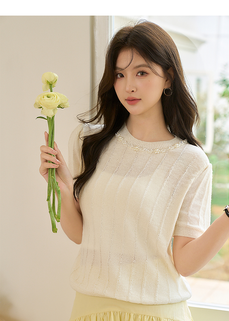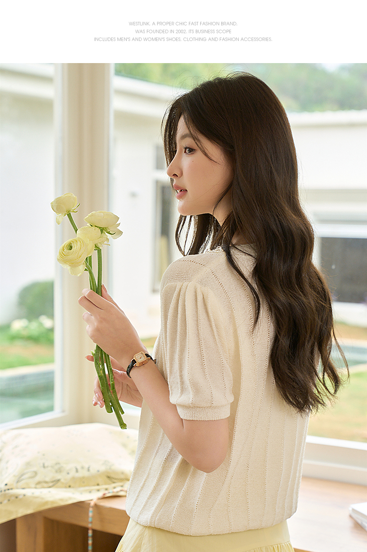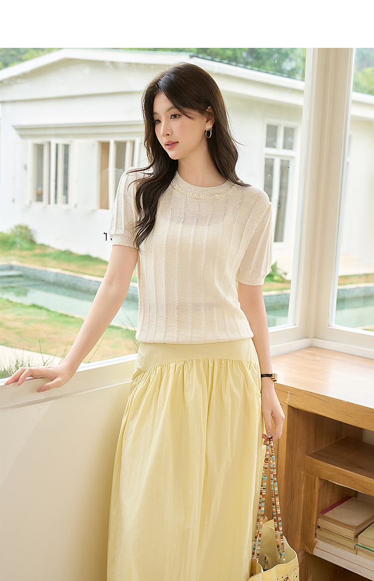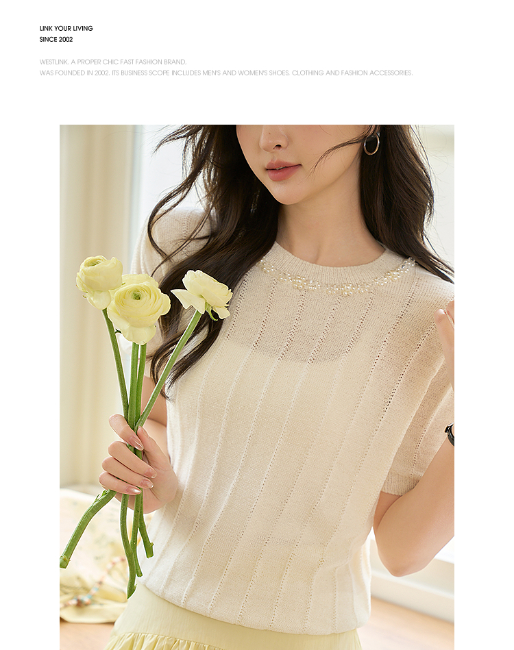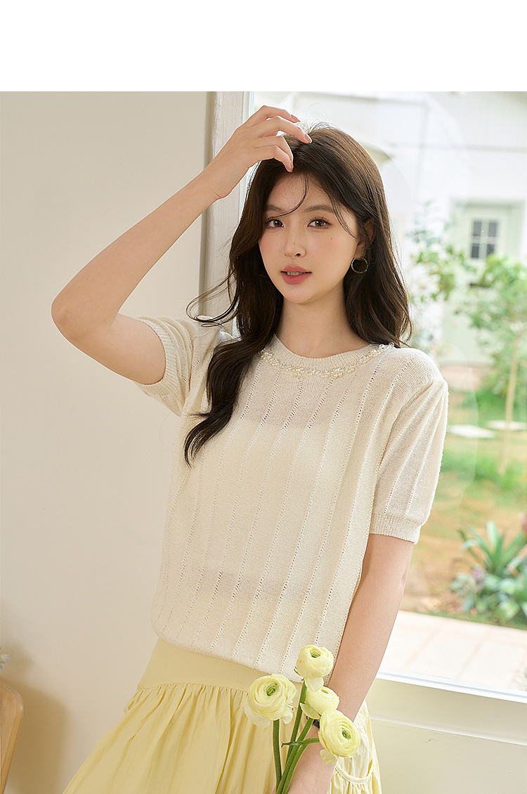西遇薄款短袖毛衣女新款珍珠领坑条紫色圆领短款针织衫D0050385