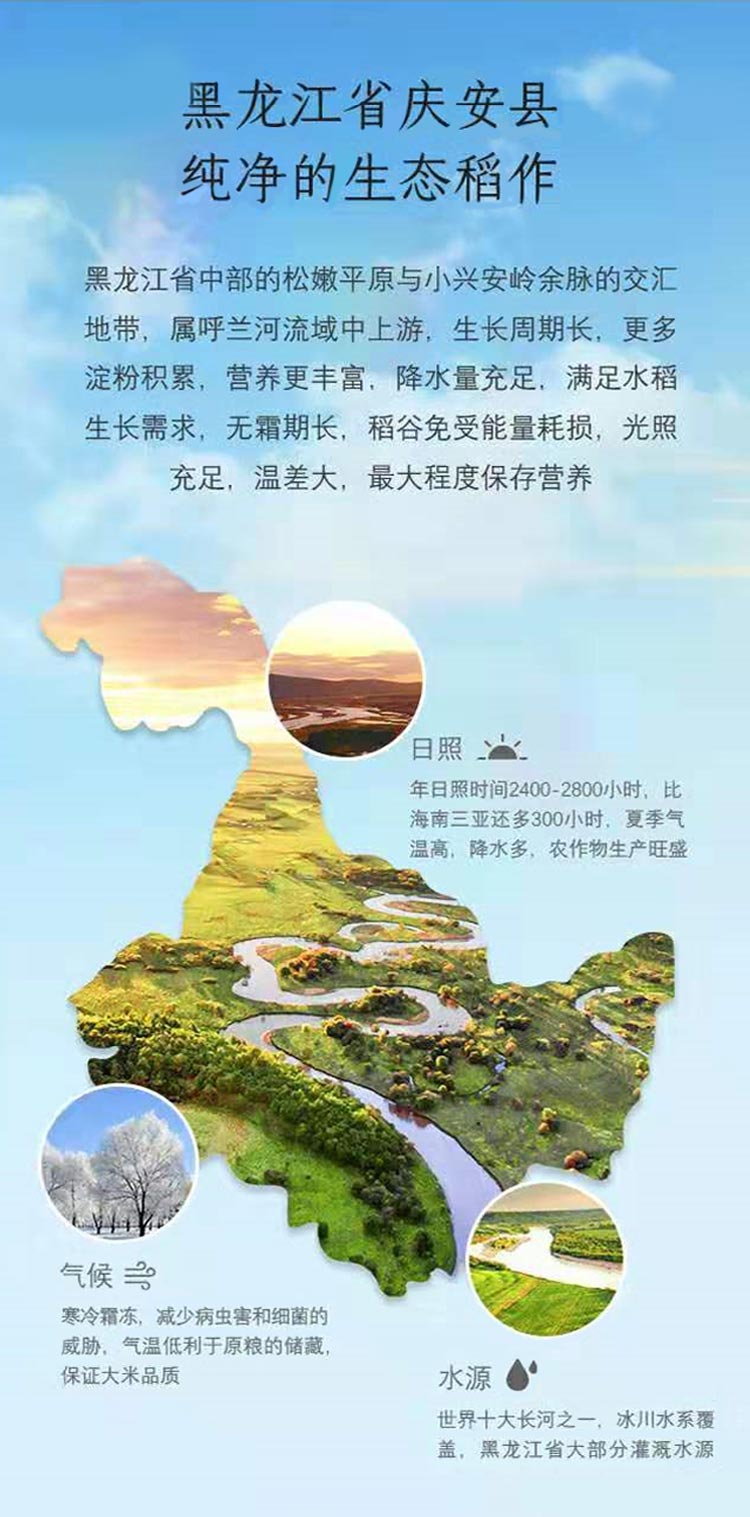 东北直供珍珠胚芽米:产于中国优质稻米之乡-黑龙江庆安县,黑龙江庆安县的寒地黑土拥有较高的天然肥力满足了水稻生长过程中的必要生长元素,黑龙江大地光照充足,昼夜温差大,最大程度保存了稻米的营养。
