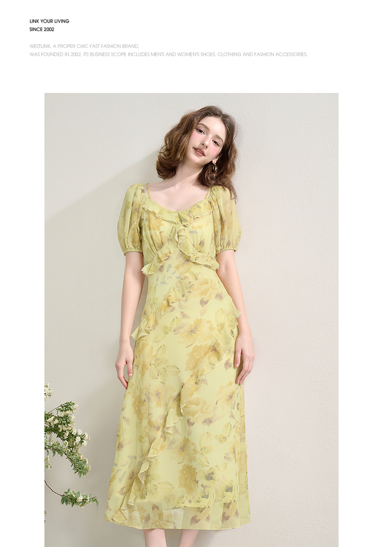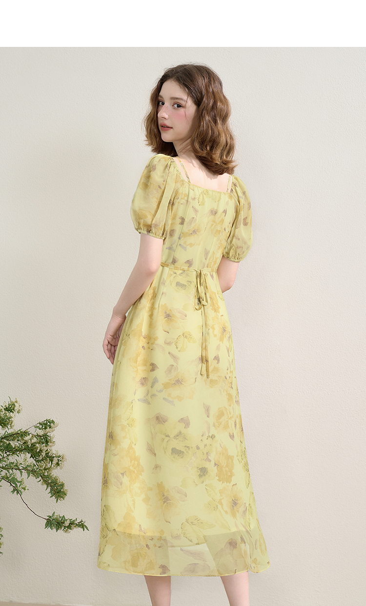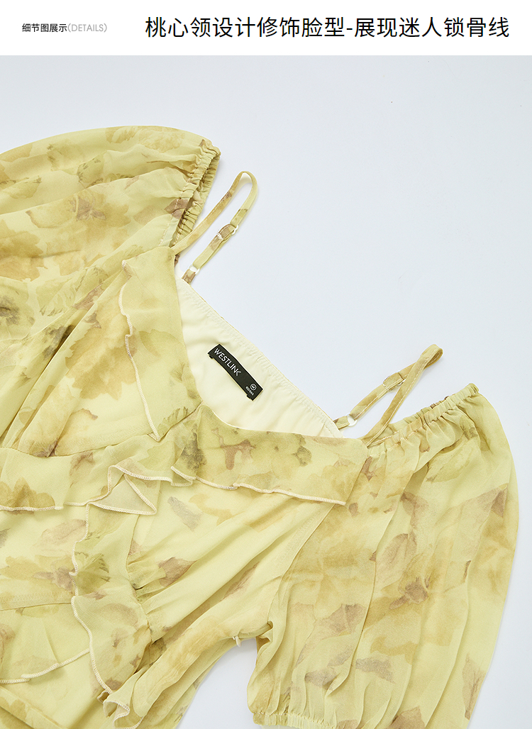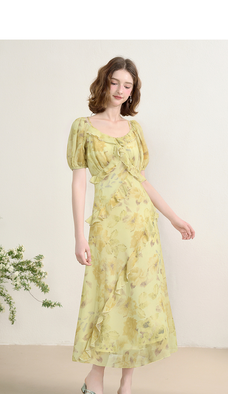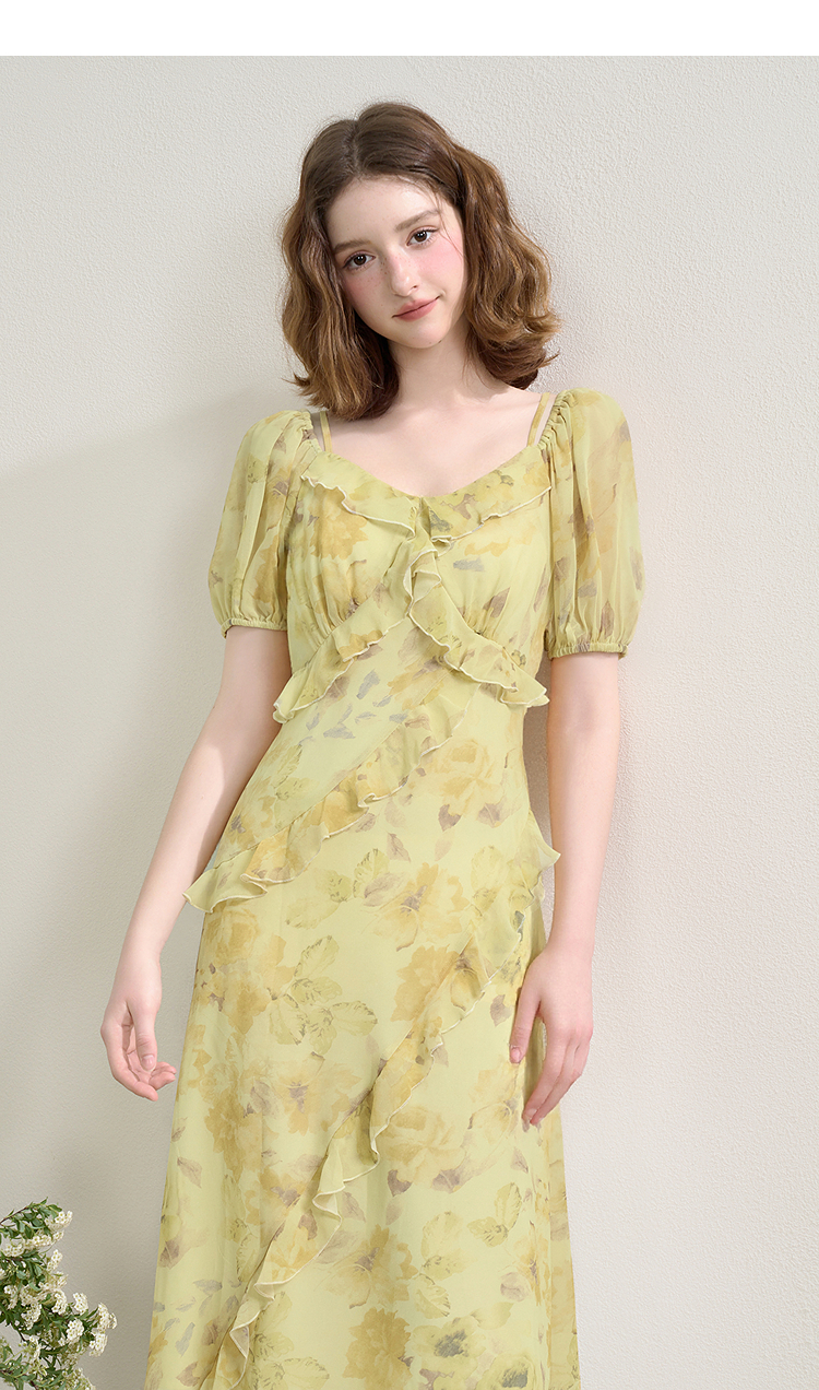 法式浪漫复古荷叶边泡泡袖碎花裙夏季桃心领收腰连衣裙V1350844