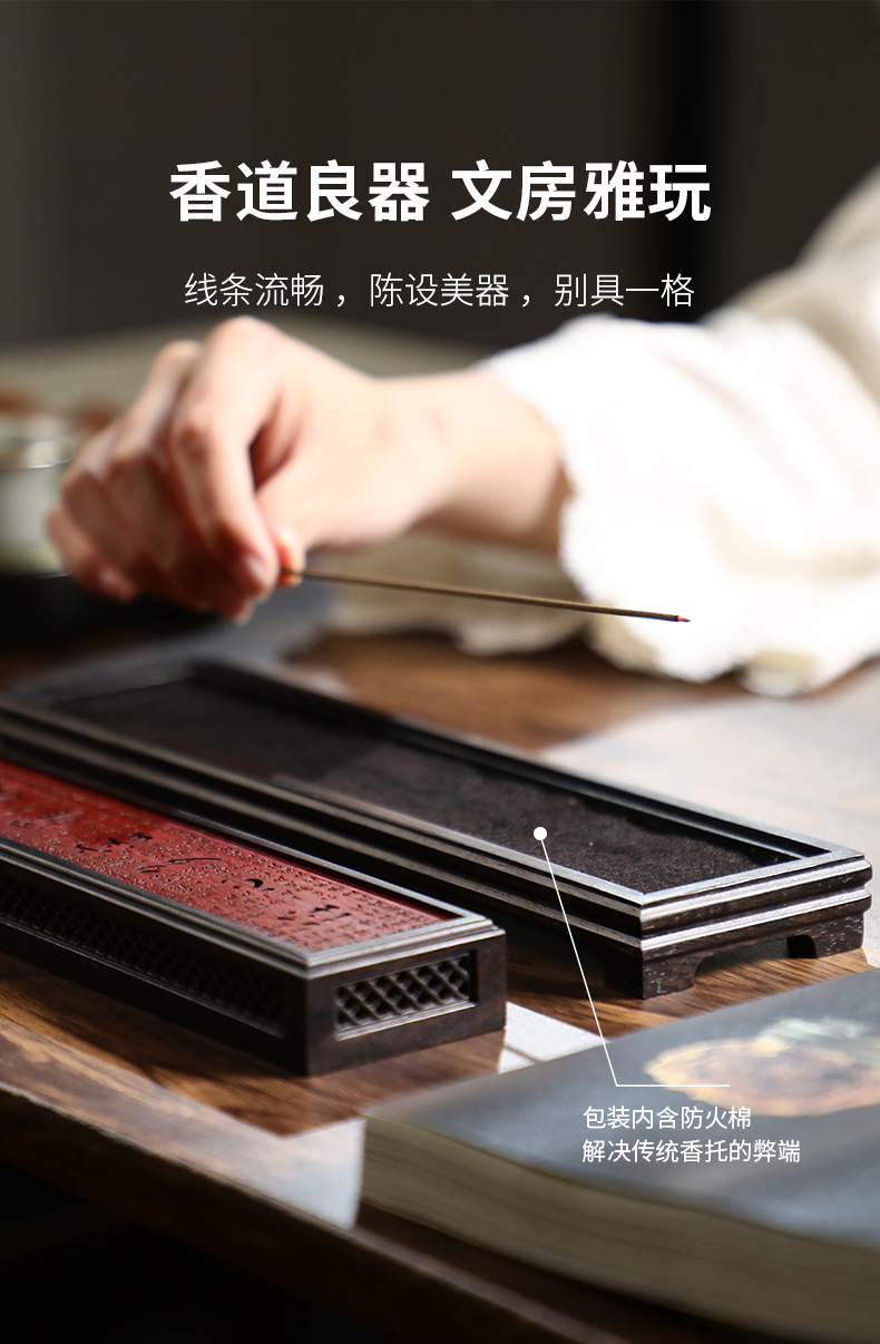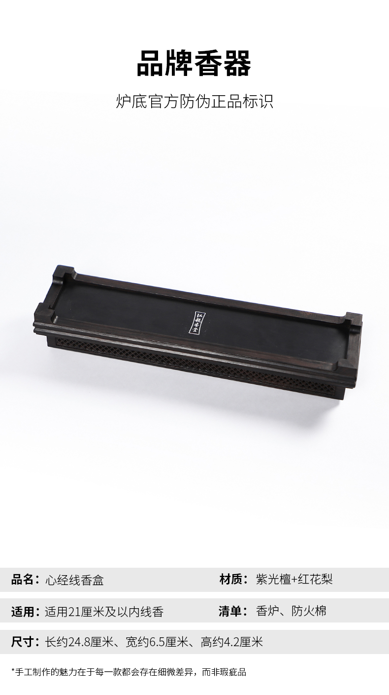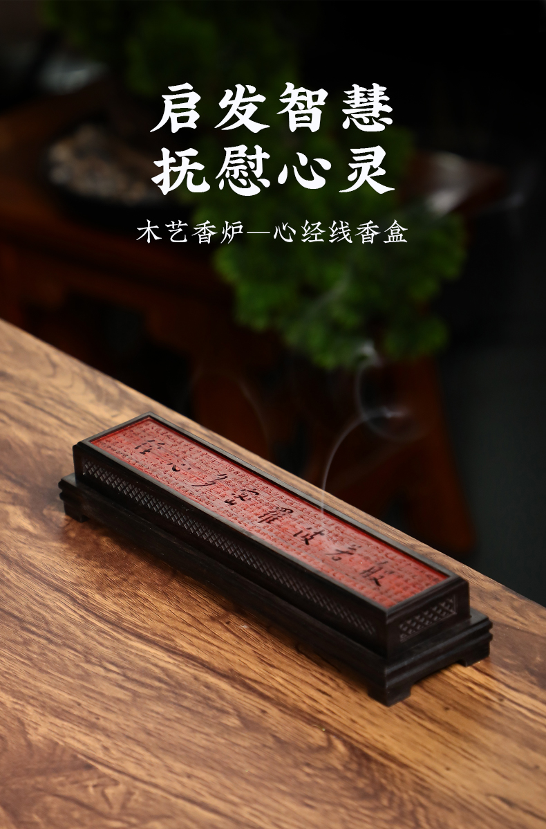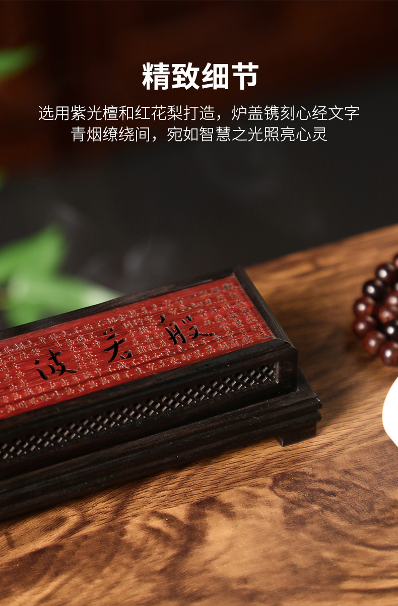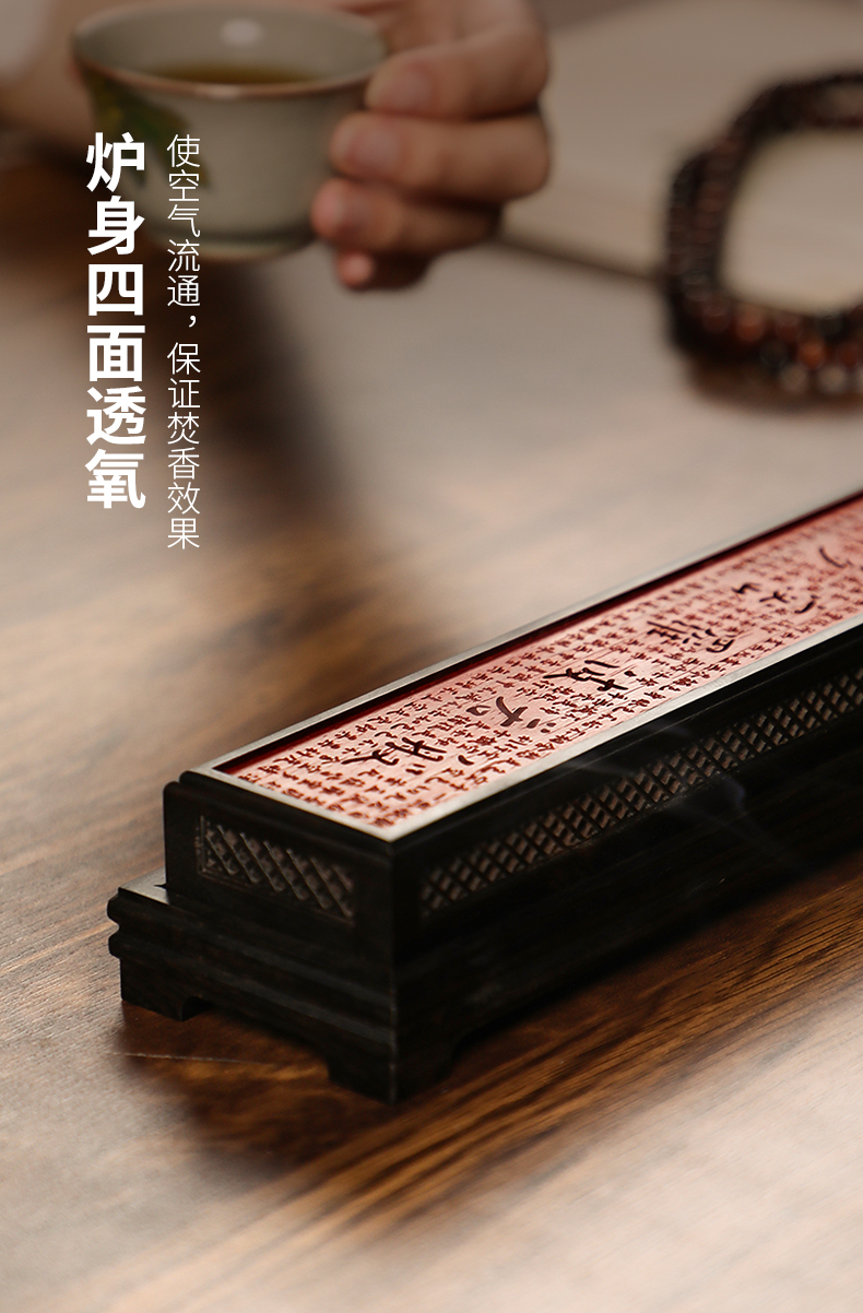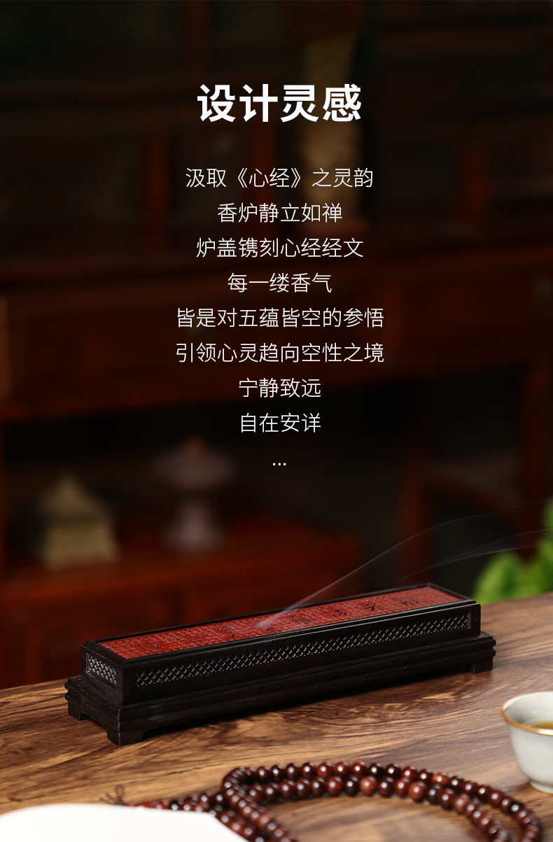 弘毅香堂原创且申请了专利。黑红经典撞色设计,下层结构抬高做了四足设计,侧面全镂空,提高了内部通气环境,使香品充分燃烧,味道更佳!炉盖为“弘一大师”的书法字体,为心经内容。