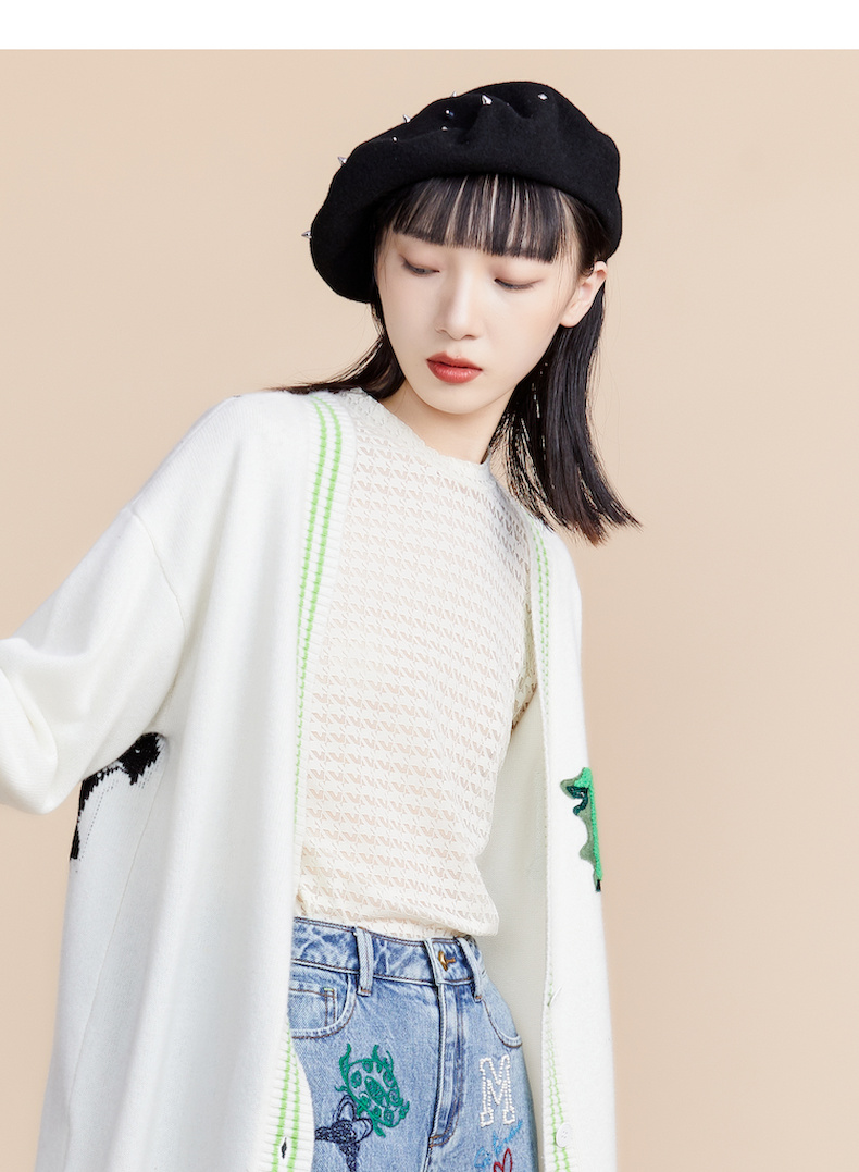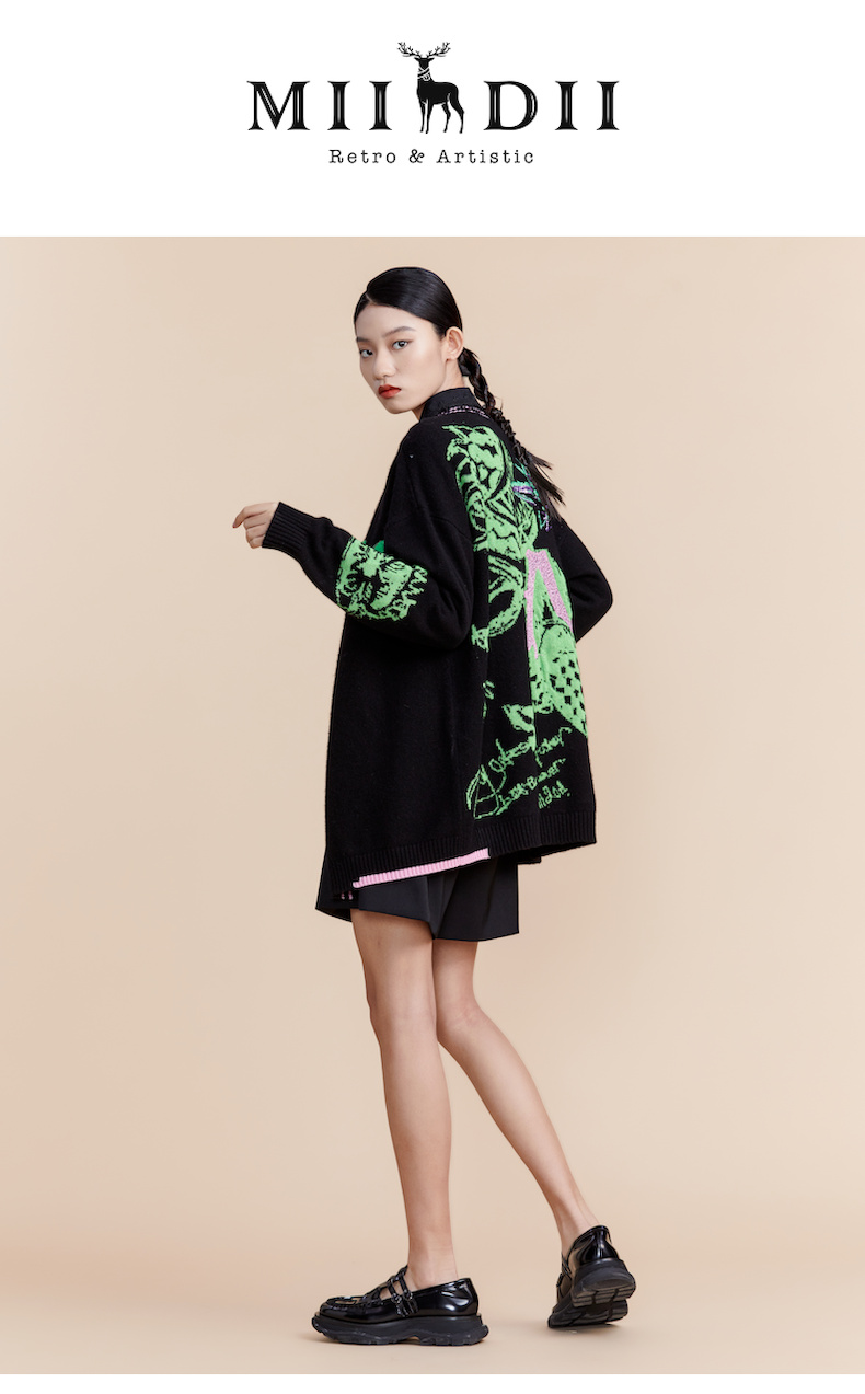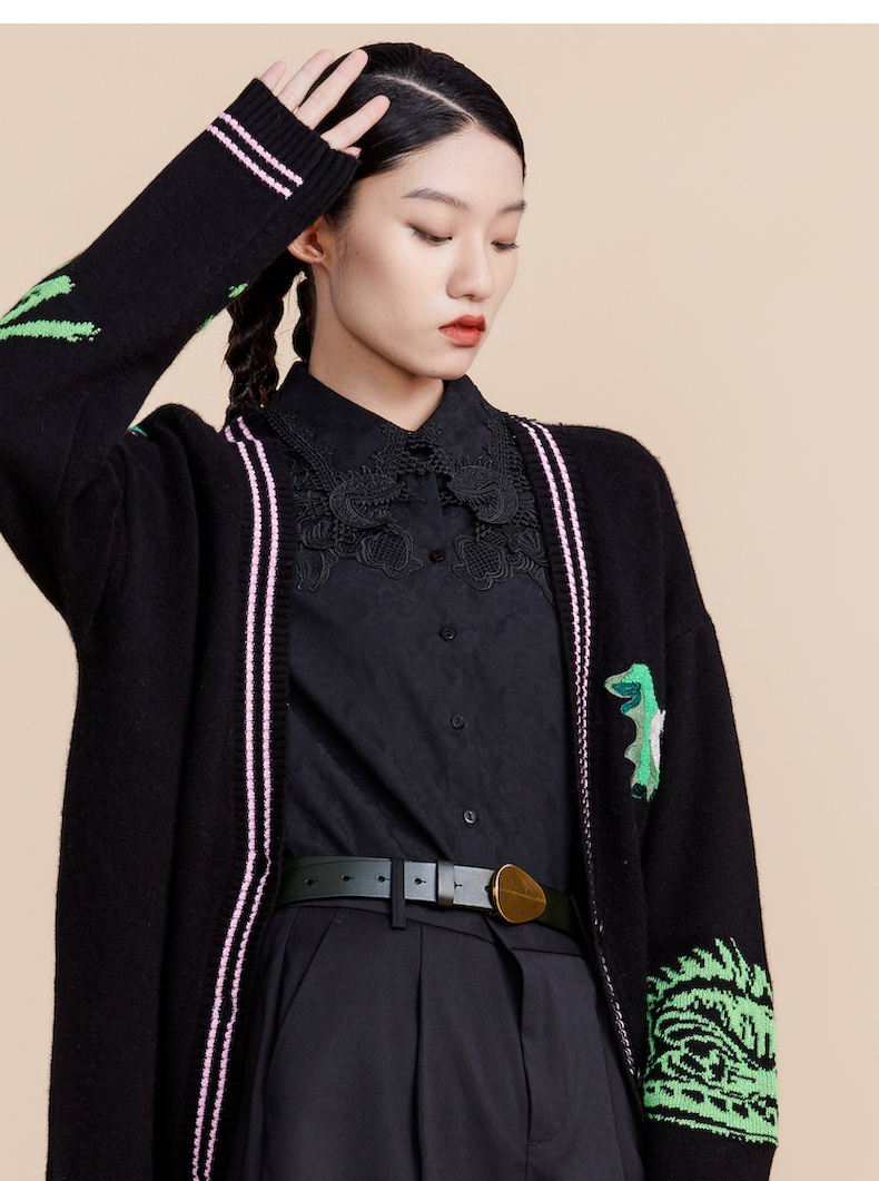 MIIDII谜底2022春新款食人花提花V领中长款针织开衫女221MZ0373