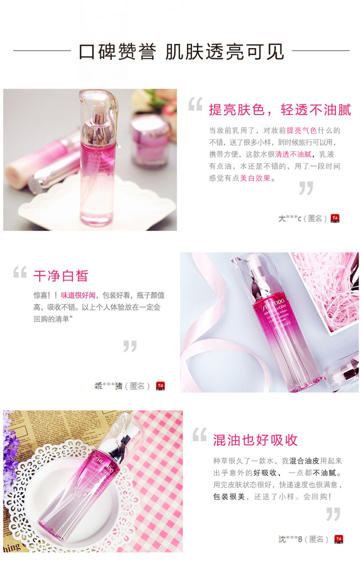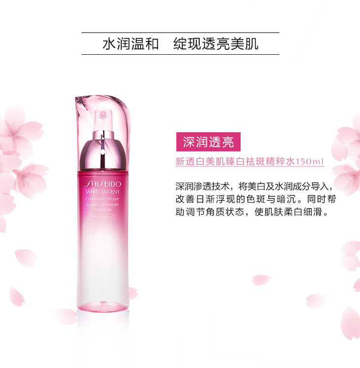 官方称这款新透白精华主要针对色斑及肤色不均的情况,采用樱花防御技术,减缓黑色素生成,令肌肤粉透如樱。