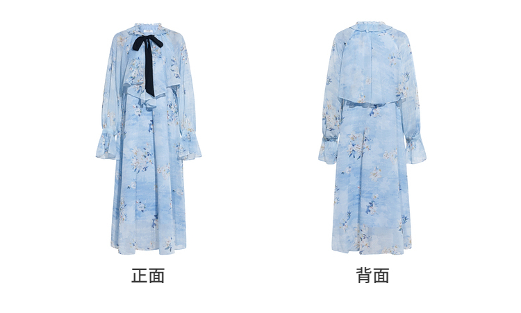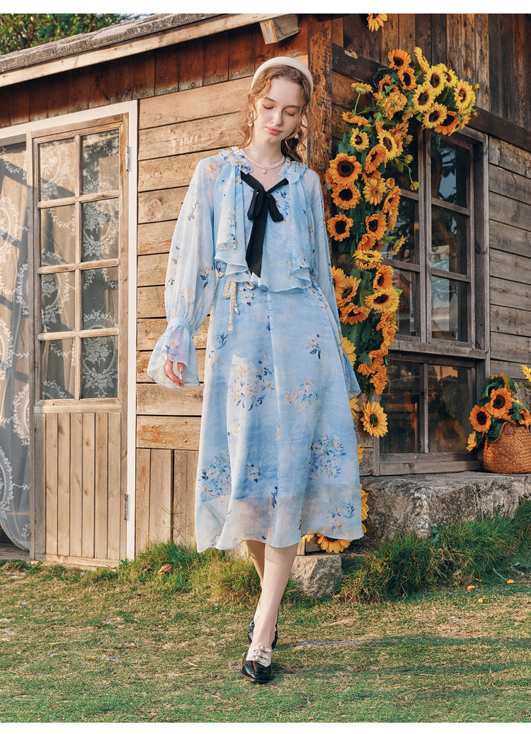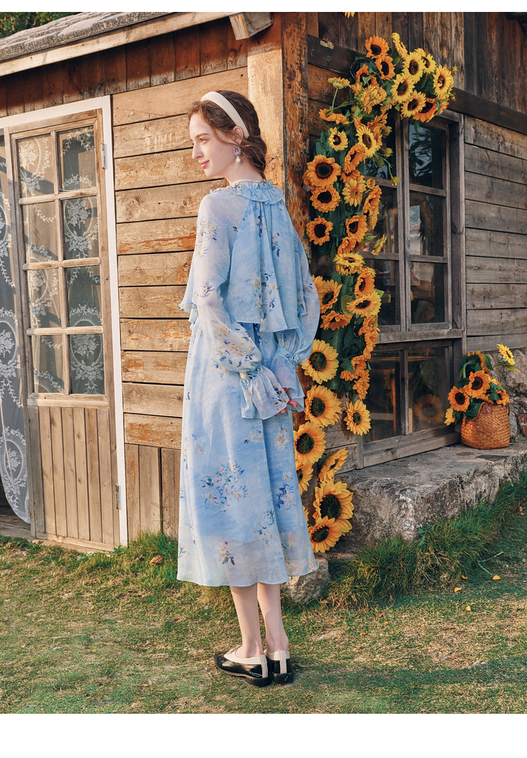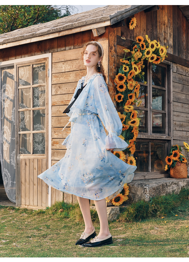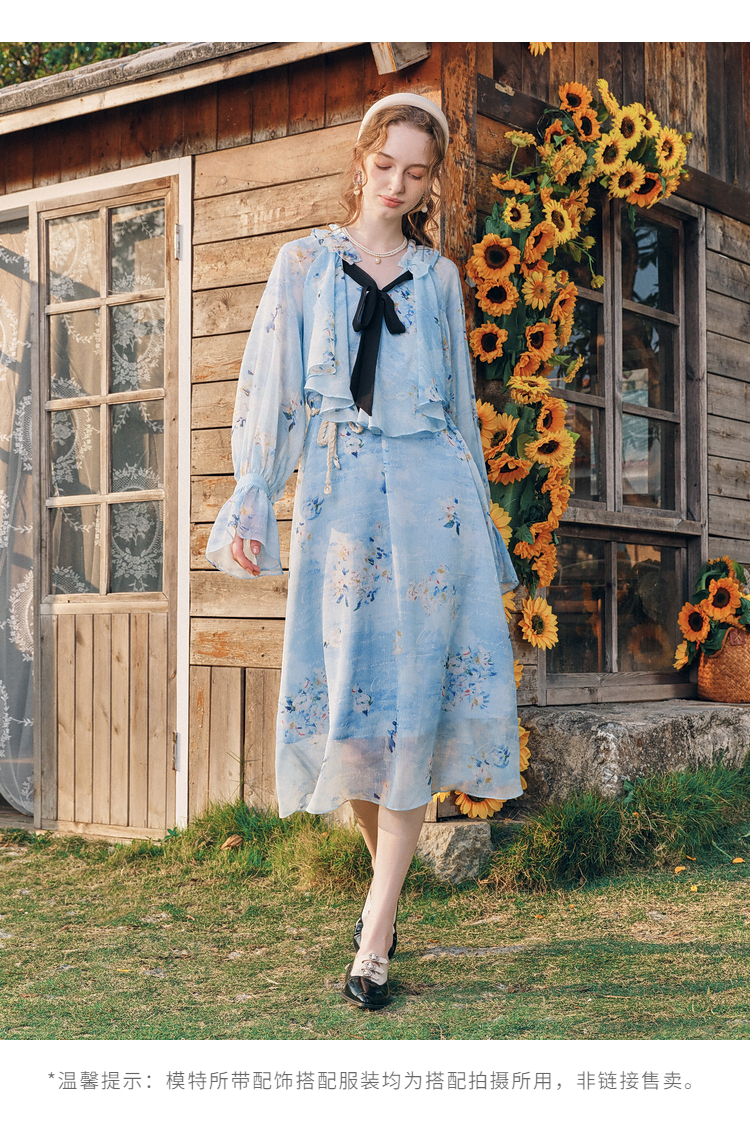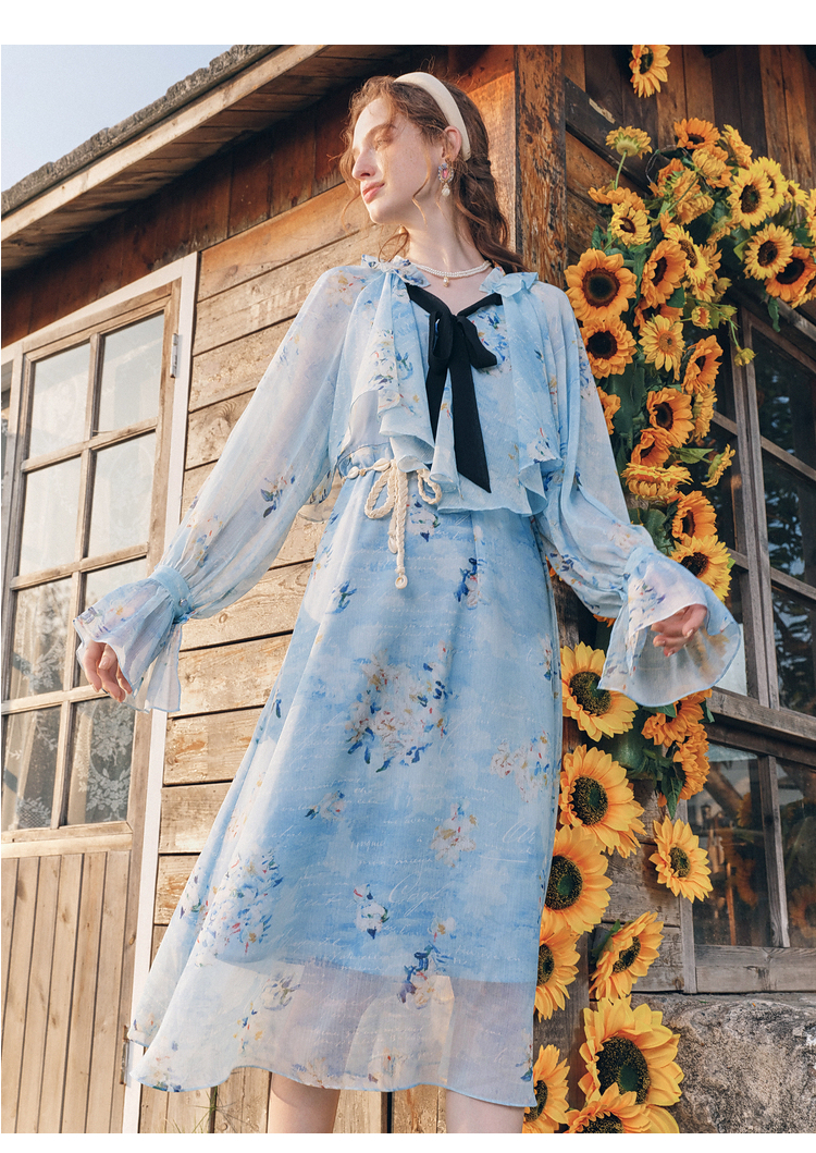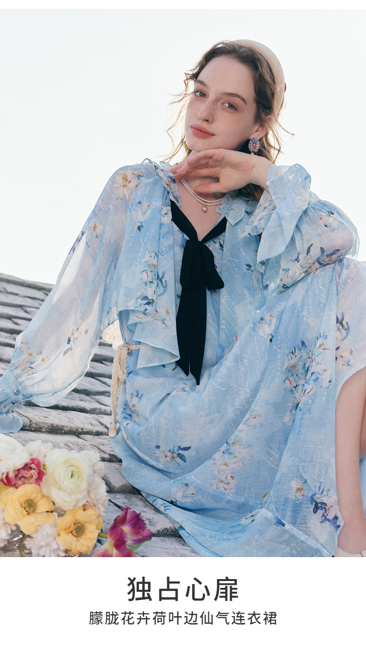两三事 独占心扉 2026春季新款温柔风荷叶边泡泡袖绑带印花连衣裙