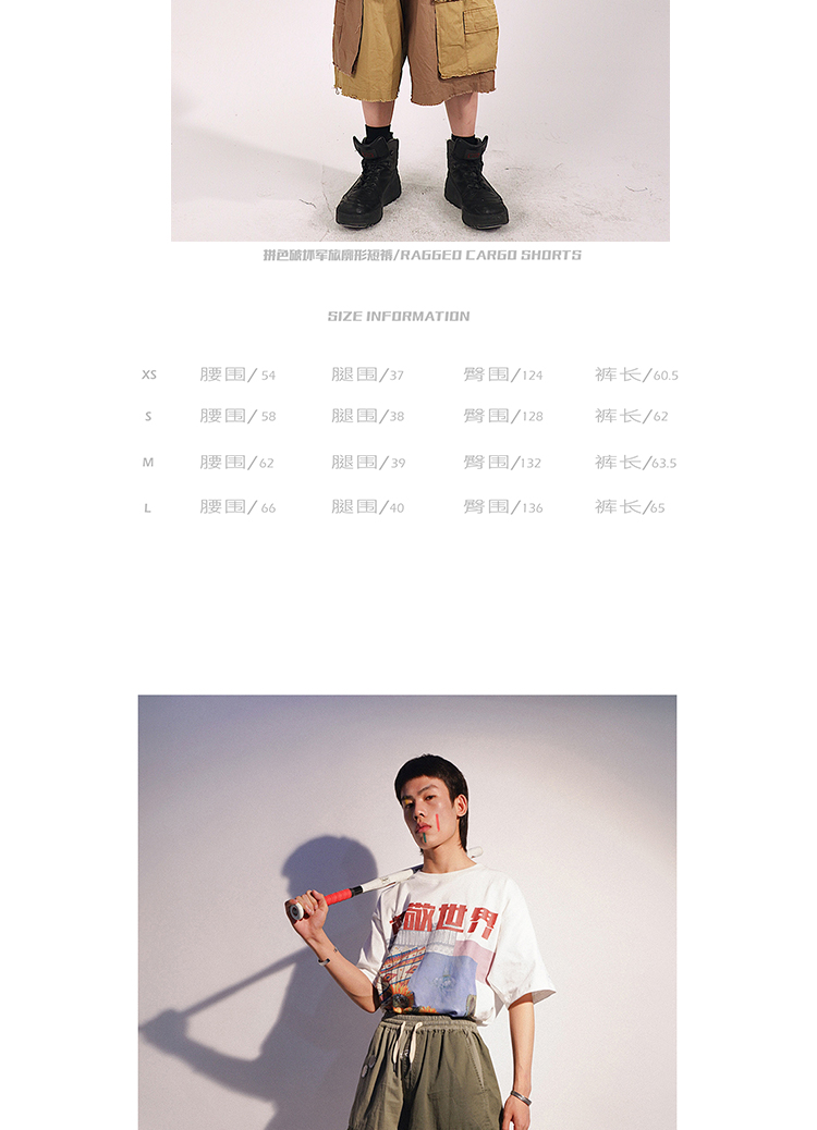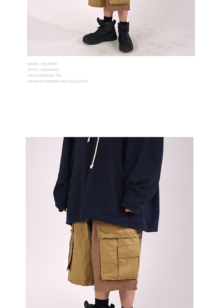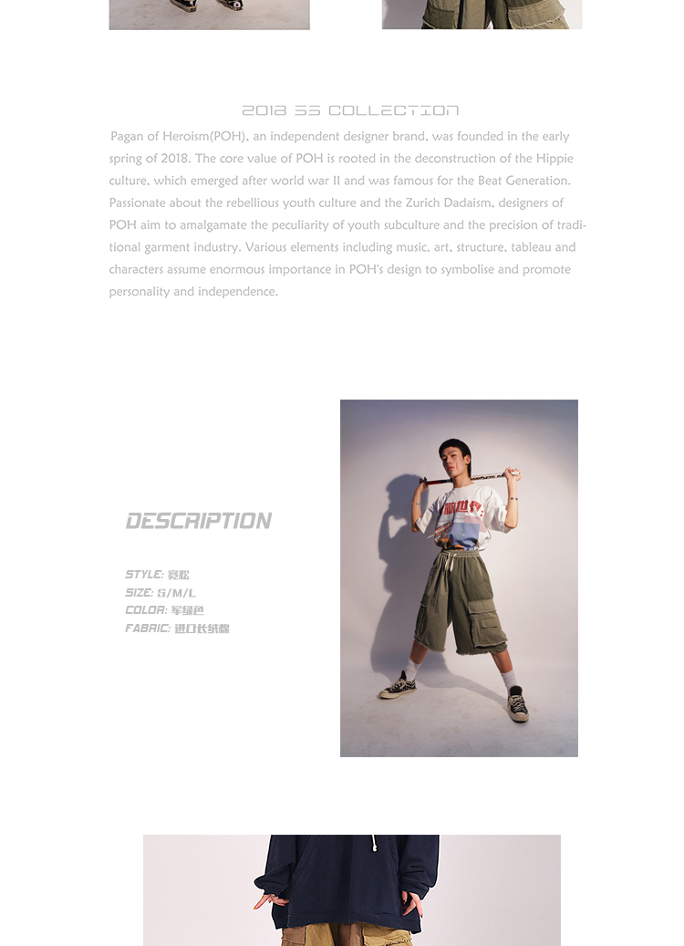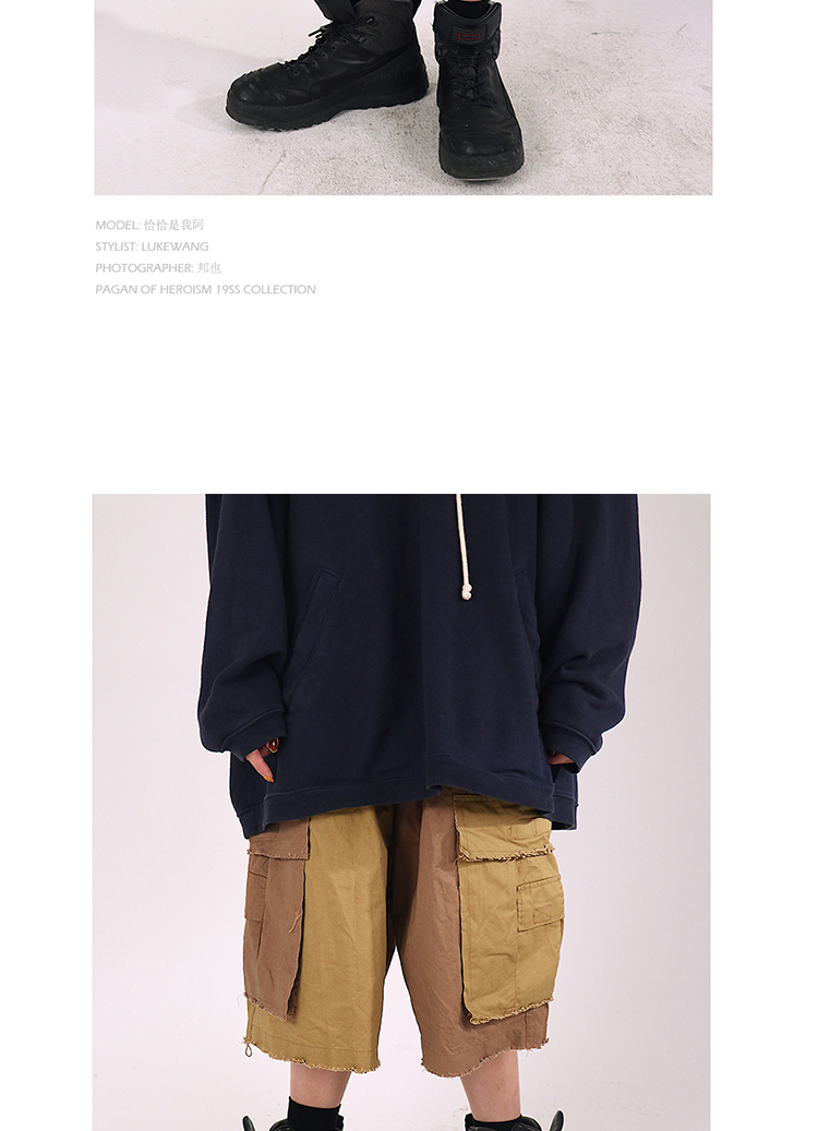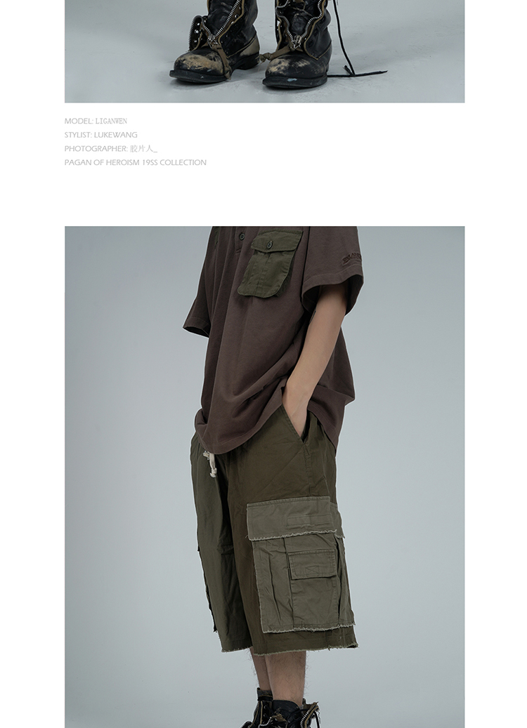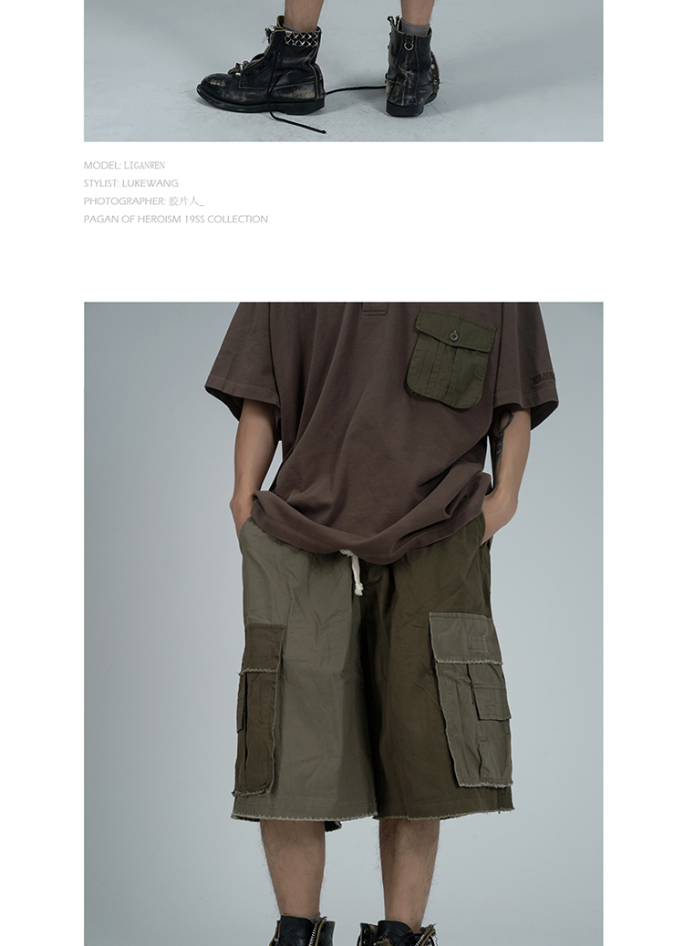 POH 军绿铁灰卡其拼色无边破坏廓形短裤男夏季潮牌多色入五分裤潮