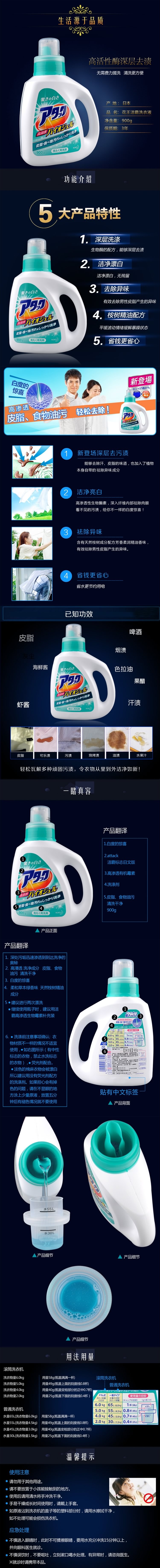 KAO花王 酵素除菌洗衣液900g 蓝色 日本
