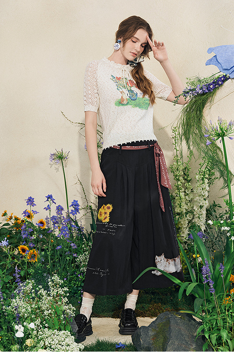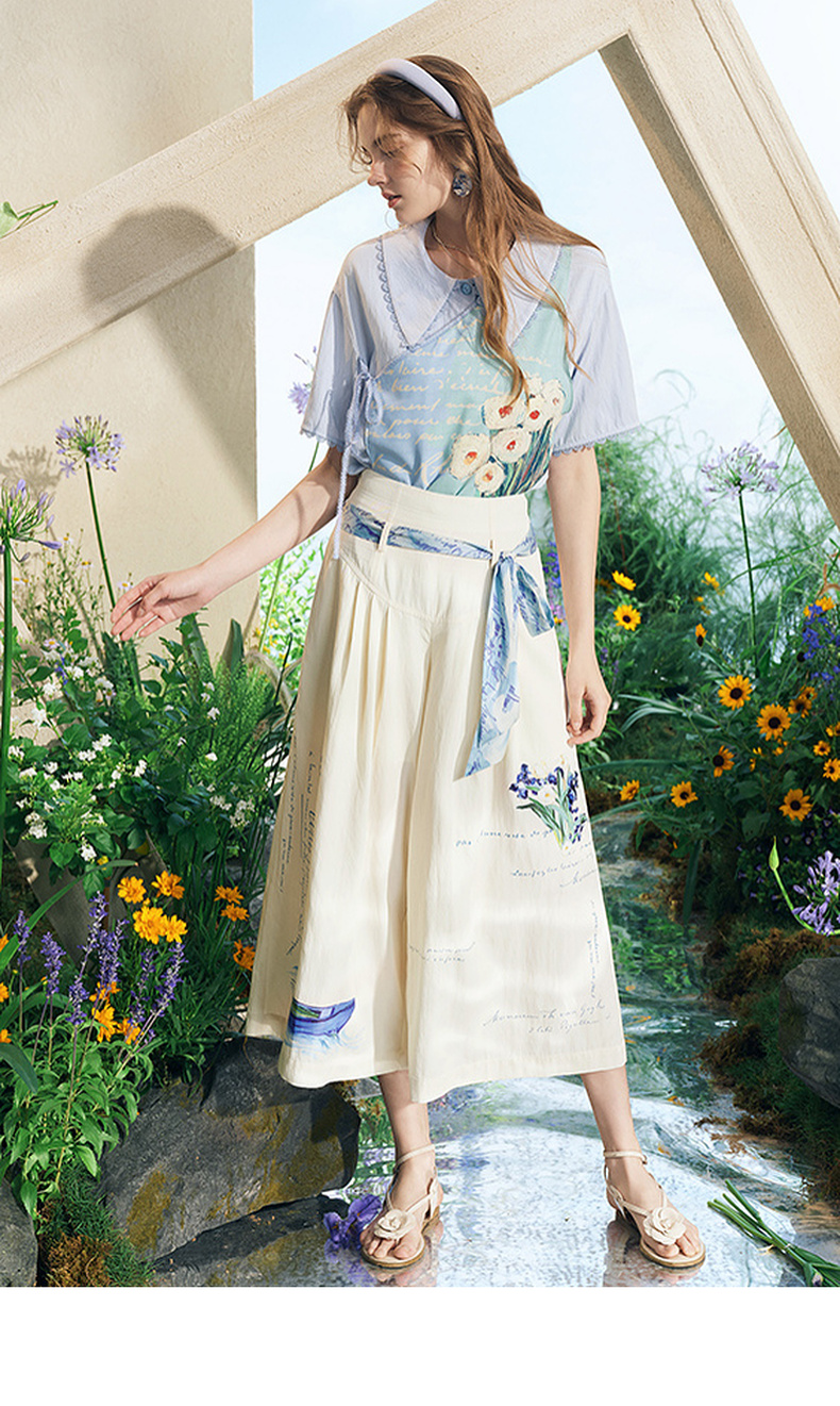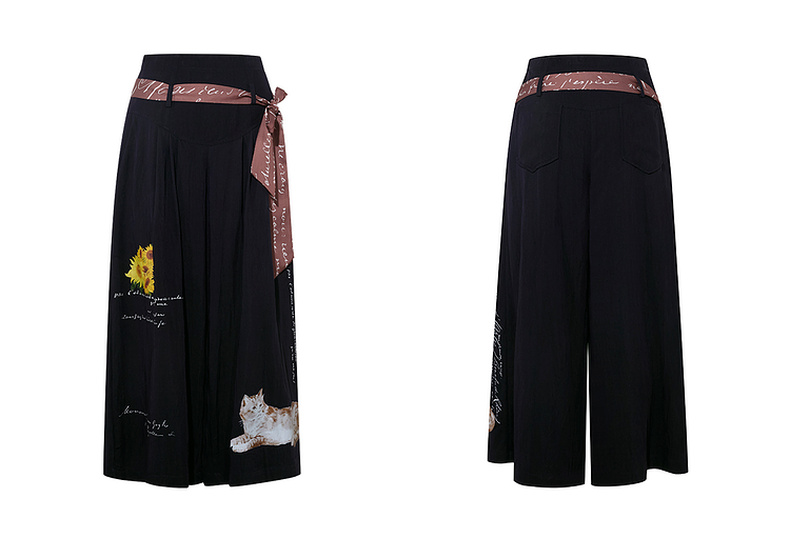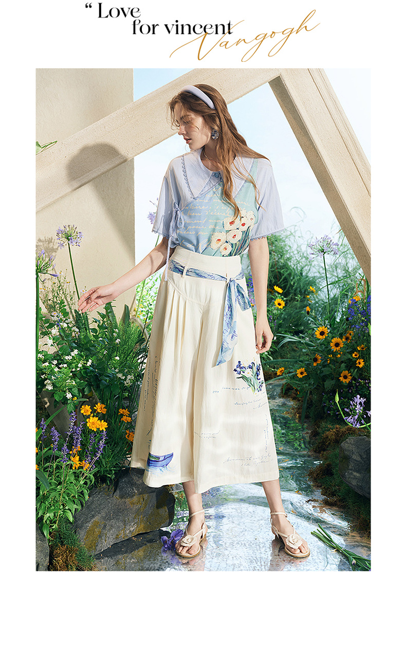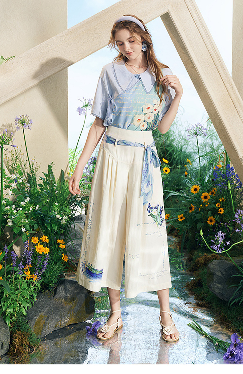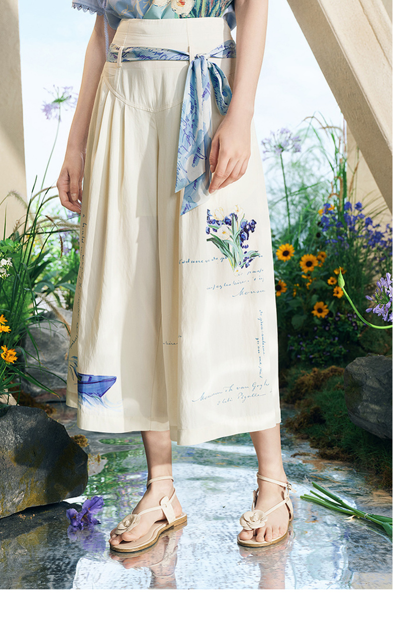 两三事梵高文艺 椰风眠昼 2025夏季新款复古印花绑带阔腿休闲裤女