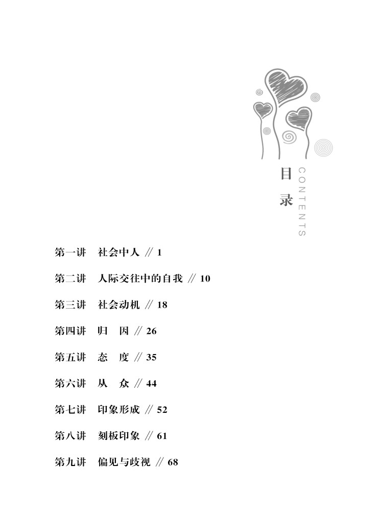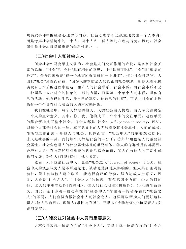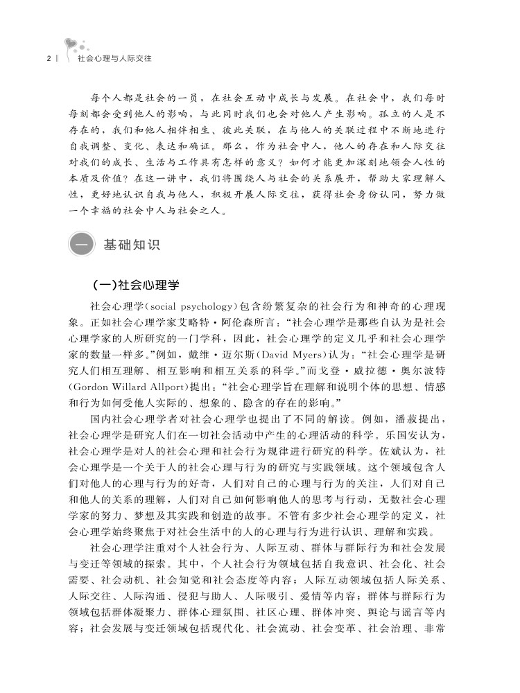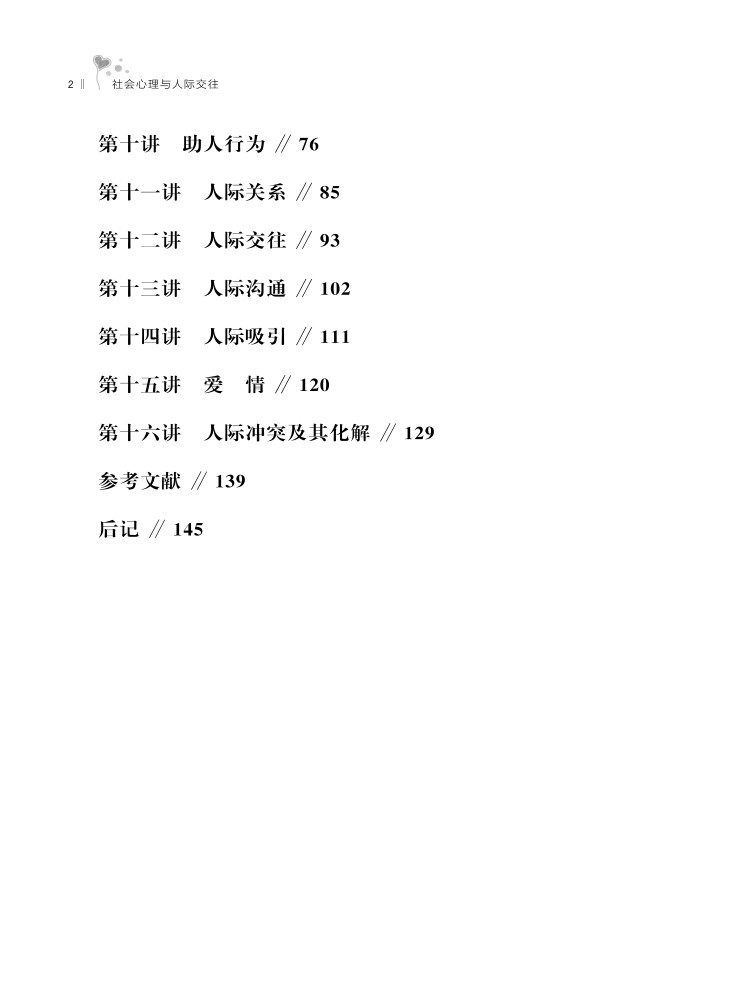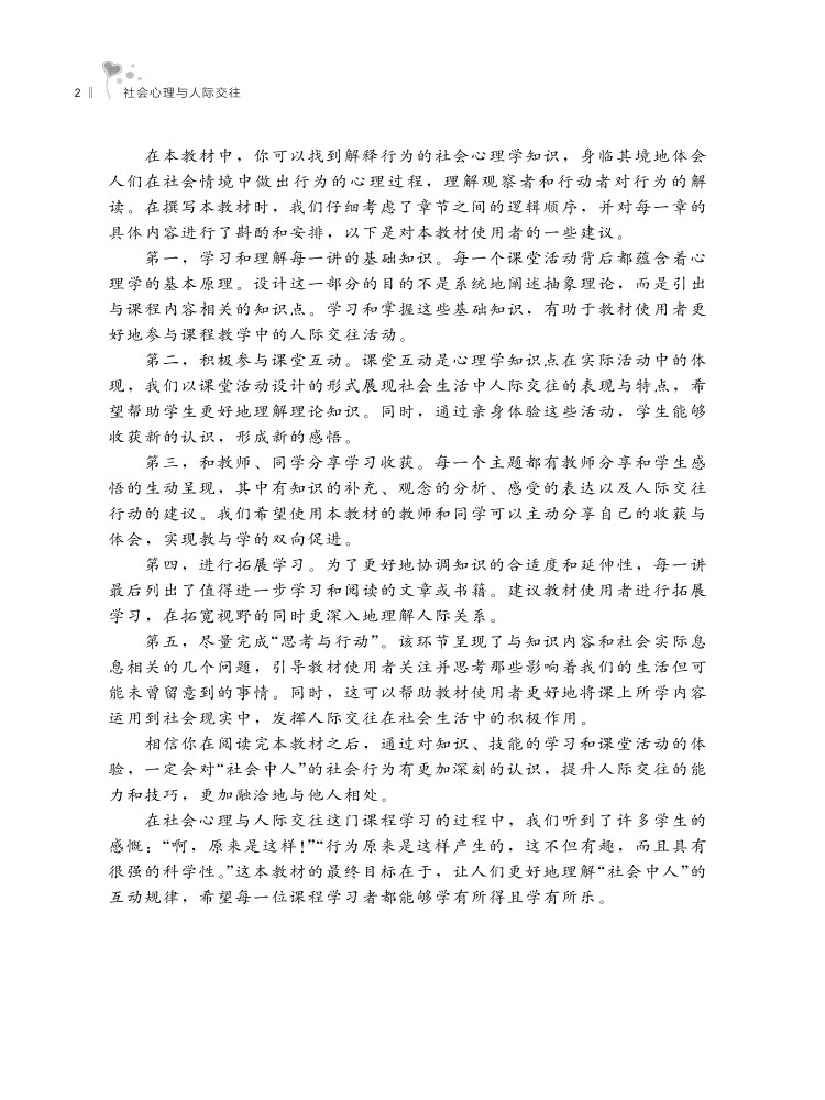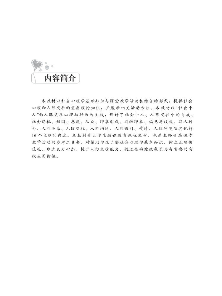 依据教育部《普通高等学校本科专业类教学质量国家标准》,将通识育与专业教育相结合,提高专业建设水平和人才培养能力。《社会心理与人际交往》是基于八年的课程教学实践所编写的大学生通识教育课程的创新教材,以课堂活动为鲜明特色,是学生在课堂上体验人际交往活动的实用指南,是教师组织实施有效课堂活动的重要工具书。本教材以习近平新时代中国特色社会主义思想为指导,以“社会中人”的人际交往为主线,设计了社会中人、人际交往中的自我、社会动机、归因、态度、从众、印象形成、刻板印象、偏见与歧视、助人行为、人际关系、人际交往、人际沟通、人际吸引、爱情、人际冲突及化解等十六讲内容,涵盖了大学生社会心理与人际交往的主要方面。本教材适用于面向非心理学专业的大学生开展的通识教育课程。以提升大学生交往素质为目标导向,教材内容具有科学性、系统性、生活性和可操作性。学习和使用本教材,有助于大学生理解社会心理学基本知识,通过交往活动提升人际交往素质,促进社会适应和全面发展。作为心理学通识教育教材,对于广大社会人士也具有重要应用参考价值。