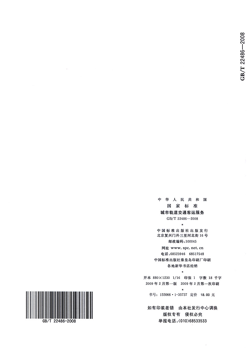 书名:速印不退 GB/T 22486-2008城市轨道交通客运服务