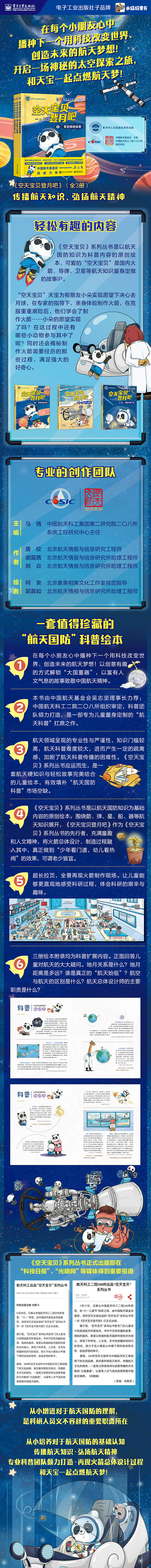 《空天宝贝》系列丛书是以简单的航天知识作为科普内容的原创绘本。《空天宝贝登月计划》作为《空天宝贝》系列丛书的第一部,结合充满童趣和人文精神的故事,真正做到了"少年看门道,幼儿看热闹”的效果,可谓"老少皆宜”。《空天宝贝登月计划》共分为三册,分别是:《空天宝贝登月计划1:金色桂树在哪?》《空天宝贝登月计划2:火箭怎么造呢?》《空天宝贝登月计划3:愿望实现了吗?》,在这个故事中,熊猫天宝为了给心爱的好朋友小朵找到传说中的金色桂树,历尽艰辛做成一枚火箭去了月球,成功将金桂树带回。