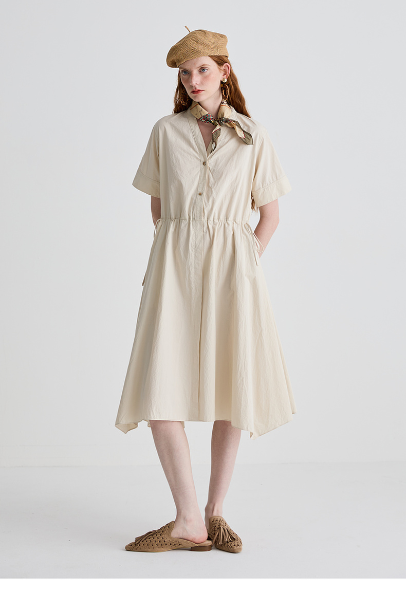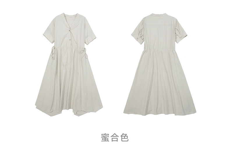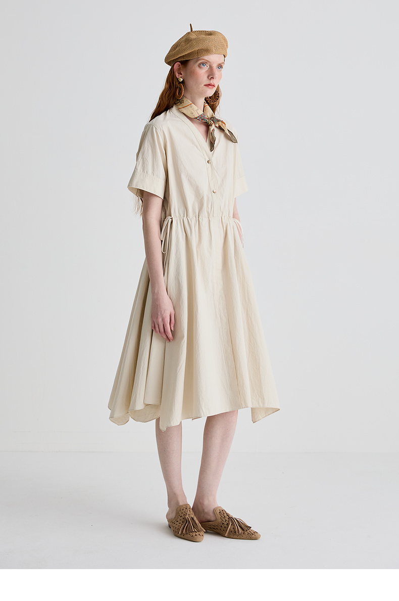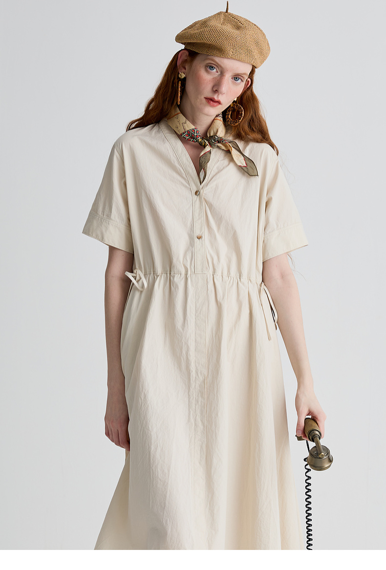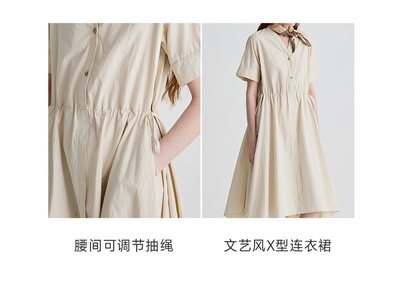 谜底连衣裙短袖2025夏季新品通勤V领抽绳收腰修身中长裙252ML0554