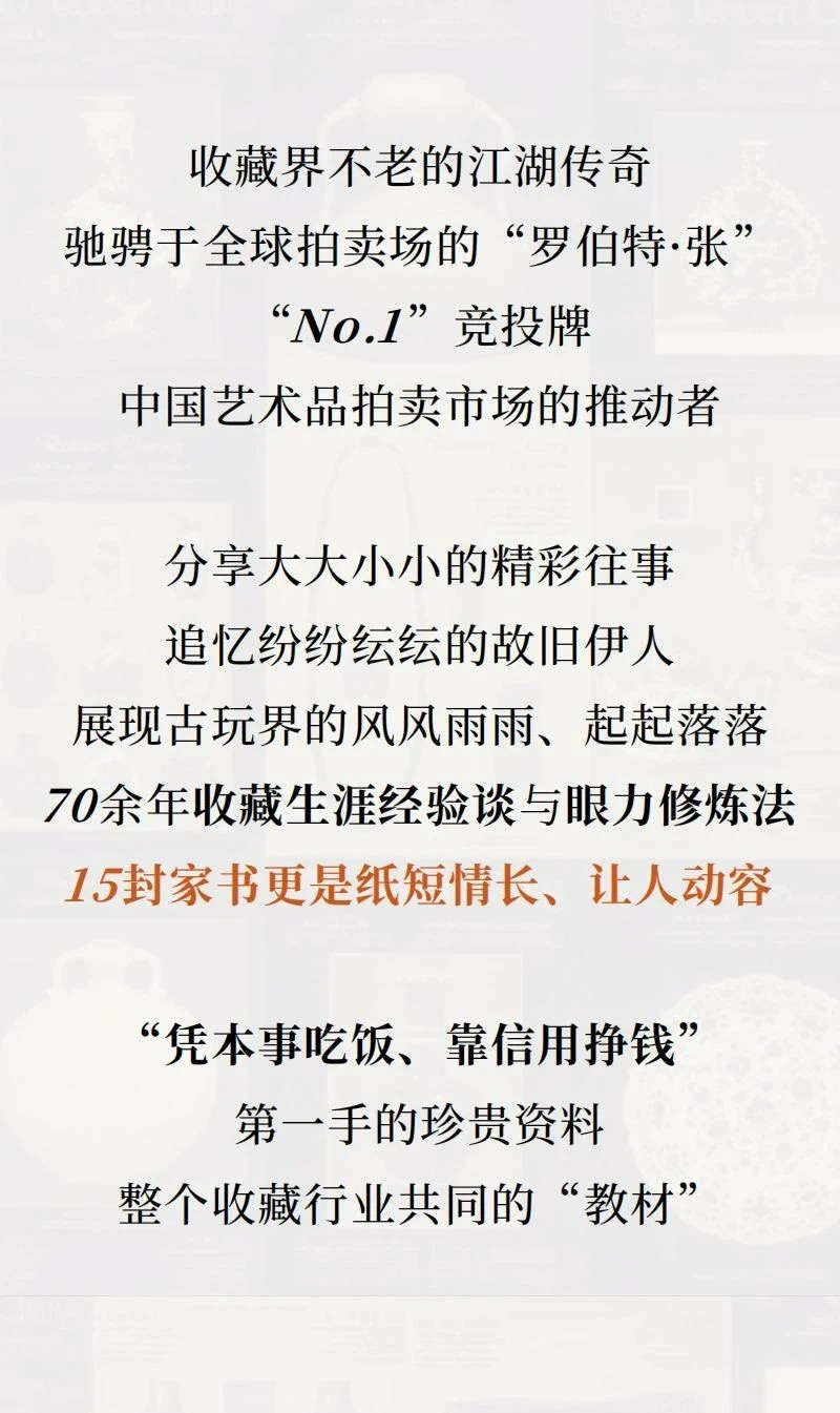 本书扉页印有张宗宪先生签名,内文包含大量老照片、高清器物图和手札图片。设计精美,极具收藏价值。为了保证内容的丰富性和真实性,张宗宪先生及其家人提供了宝贵的一手资料,我们还采访了与张宗宪先生密切交往的友人及业内专家。此外,苏州博物馆、上海博物馆、苏富比、佳士得等机构也为本书提供了珍贵的图片资料。此次再版,台湾《艺术新闻》社长刘太乃先生和田本芬女士亦为本书的增订内容提供了诸多有益的图文资料。希望这本书既平实可信,又能生动地再现张宗宪先生跌宕起伏的精彩人生。同样希望这本书能成为一扇窗,让读者朋友们走进张宗宪先生的收藏江湖,从中汲取到关于文物艺术品收藏、艺术品拍卖领域的有益养分。
