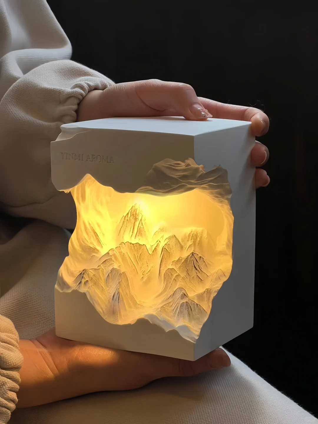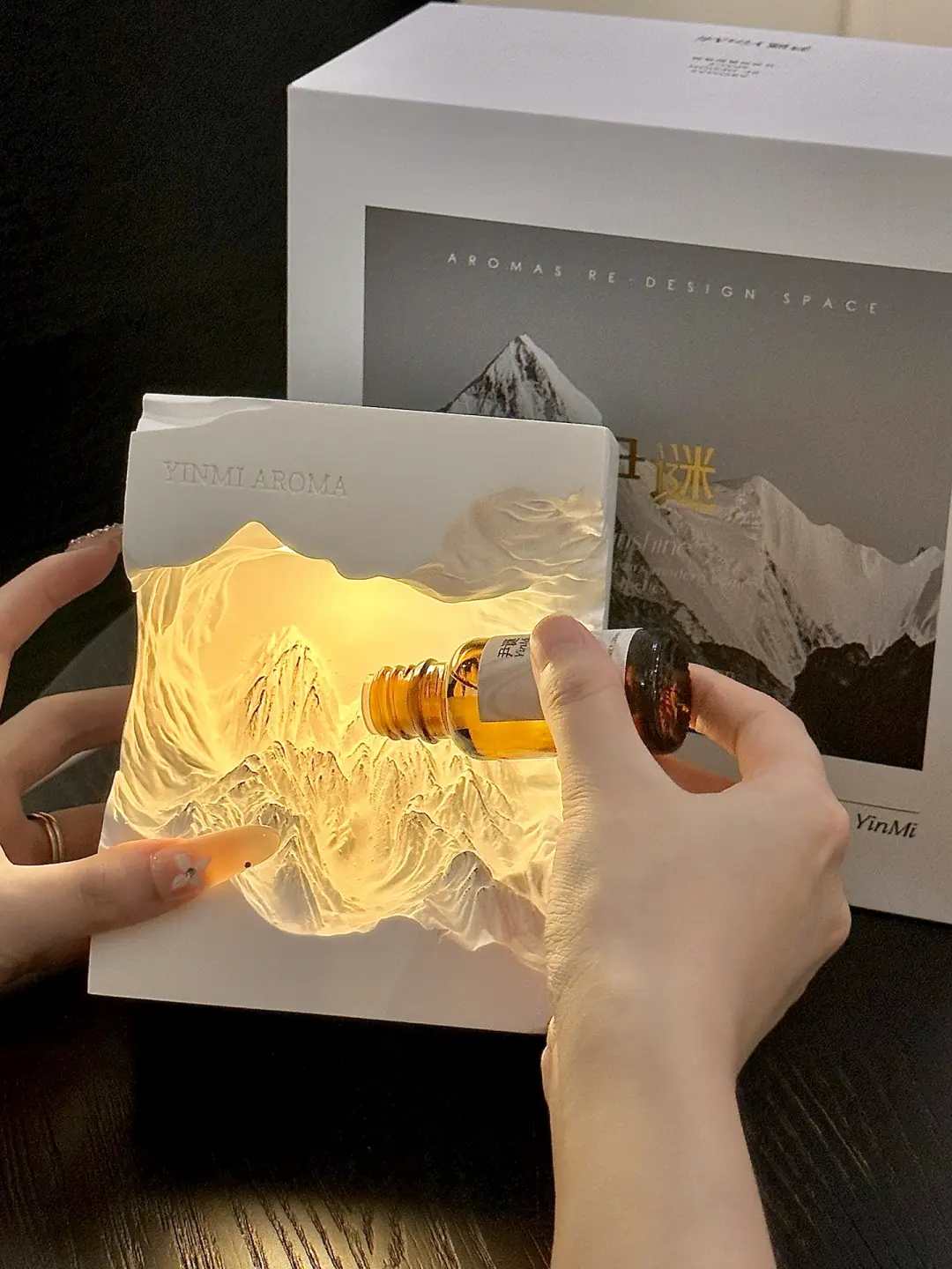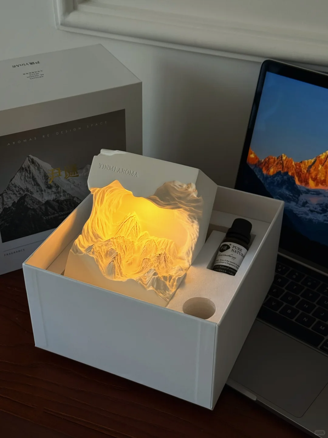 搭配灯光精油随着雕刻的雪山山脉向下流动的样子很治愈