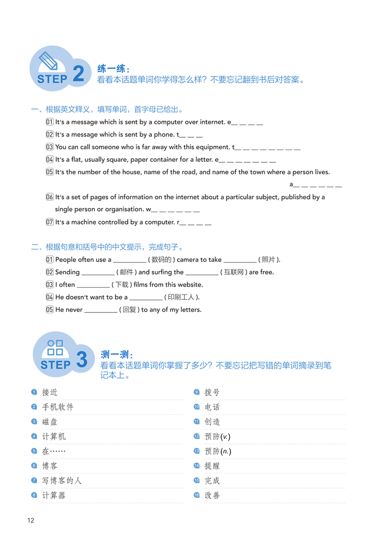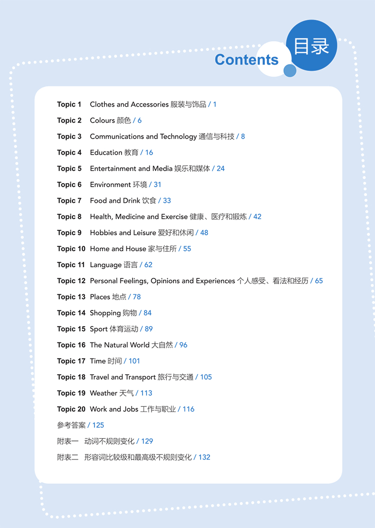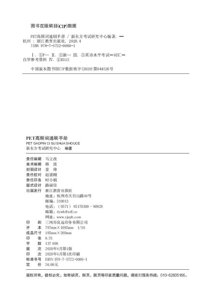 本书以剑桥官方发布的新版考试词汇表为基础,补充了历年真题中出现的常考词汇,同时从剑桥官方发布的各类新版考试备考资料中选取新词、难词,共计收录PET考试必刷词2,200个左右。全书按照剑桥新版PET官方词汇表的话题分类,将单词梳理成20个话题,方便考生学习记忆。希望能帮助考生夯实词汇基础,提高备考效率!