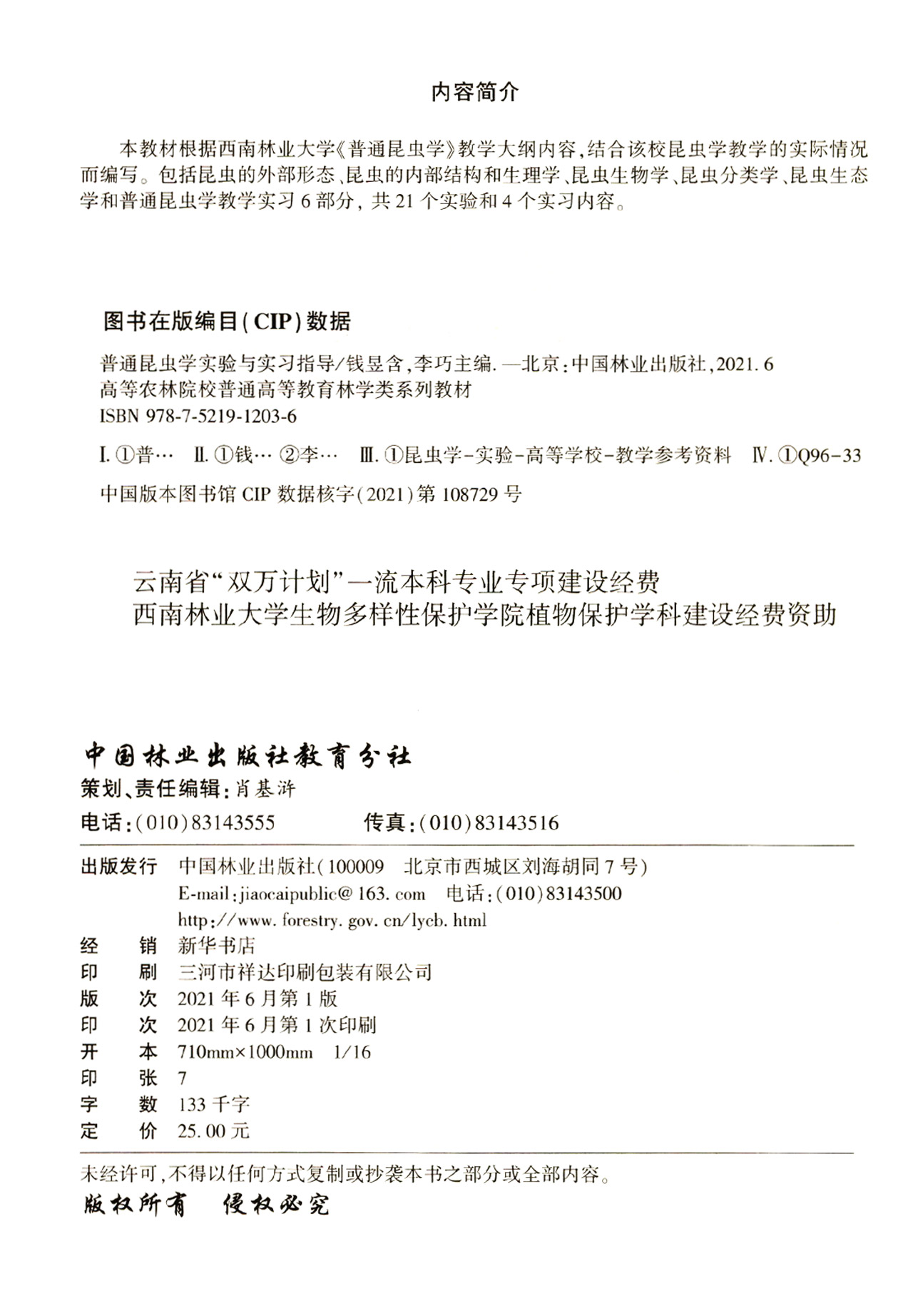 普通昆虫学实验与实习指导(高等农林院校普通高等教育林学类系列教材) 钱昱含//李巧 1203 中国林业出版社