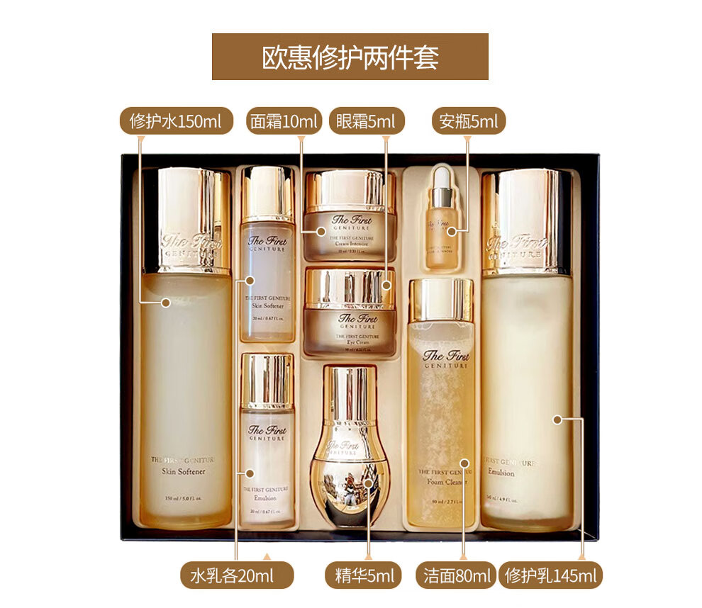 【保税仓】OHUI欧蕙极致两件套(免税版)水150ml+水中样20ml+乳145ml+乳中样20ml+精华中样5ml+面霜中样10ml+眼霜中样5ml+安瓶精华中样5ml+洁面中样80ml/套