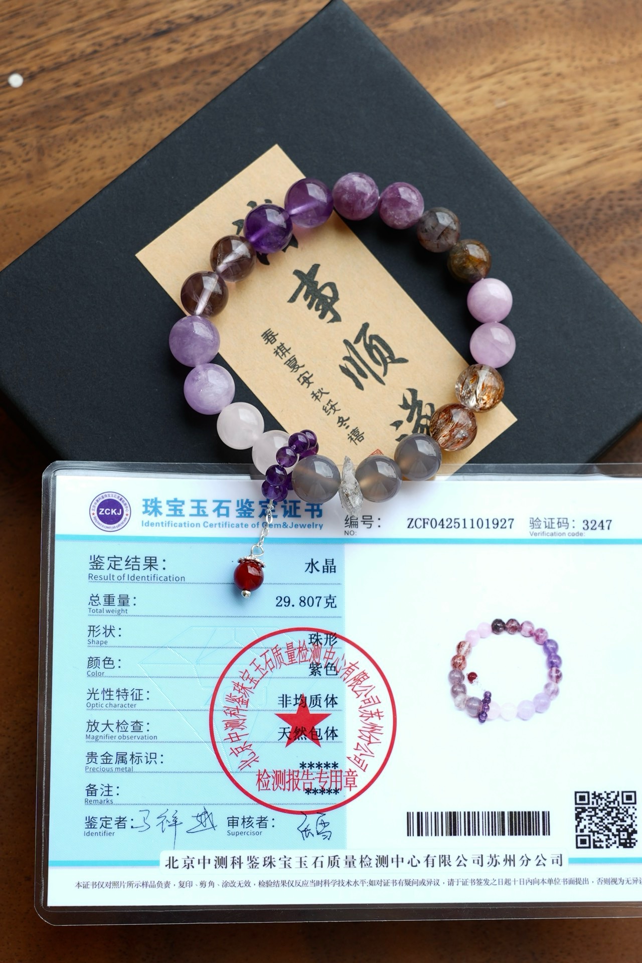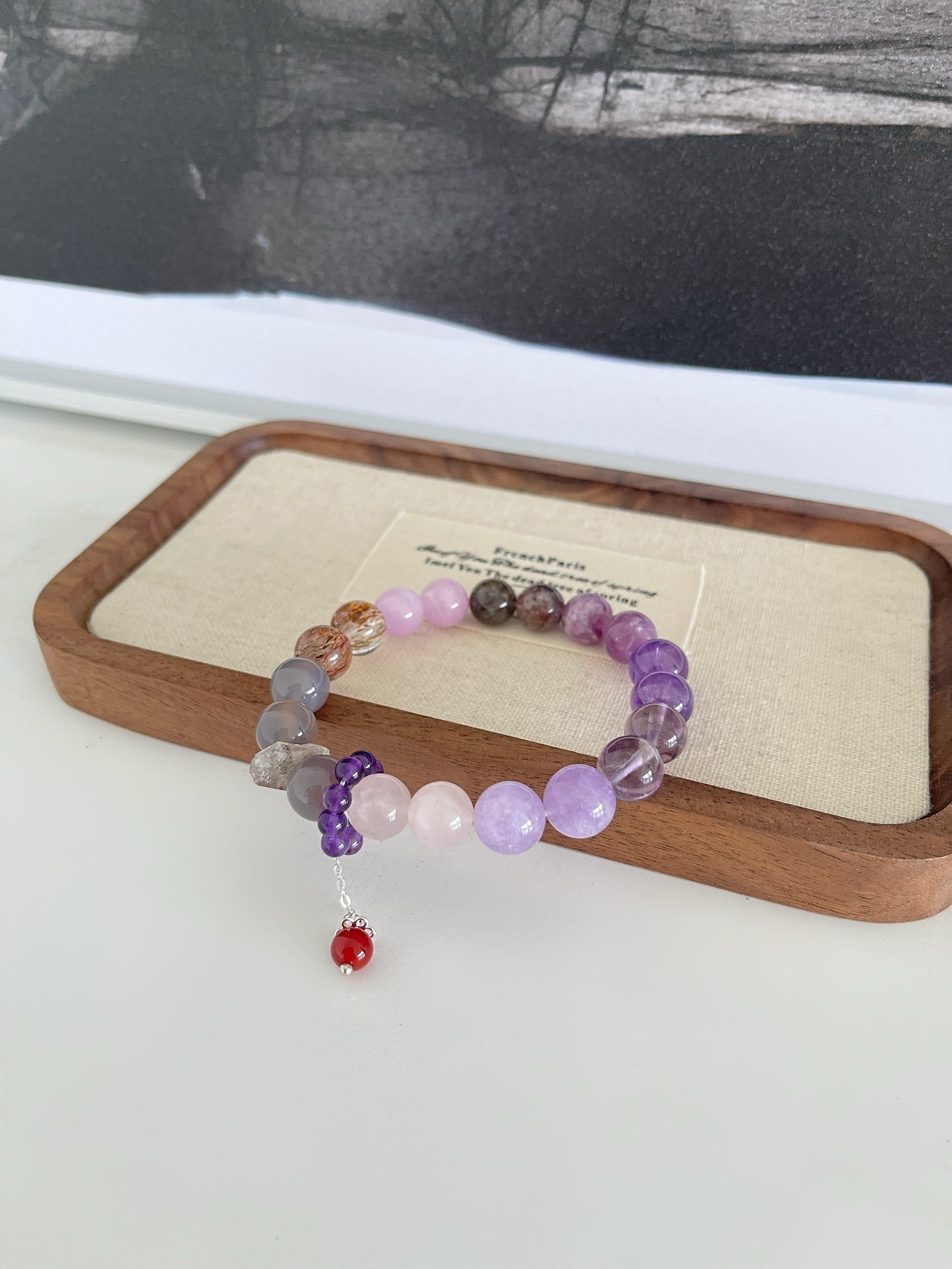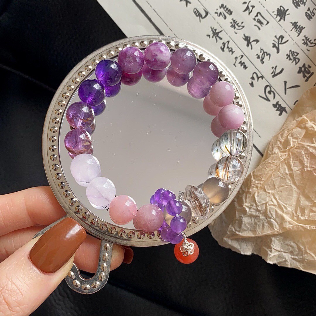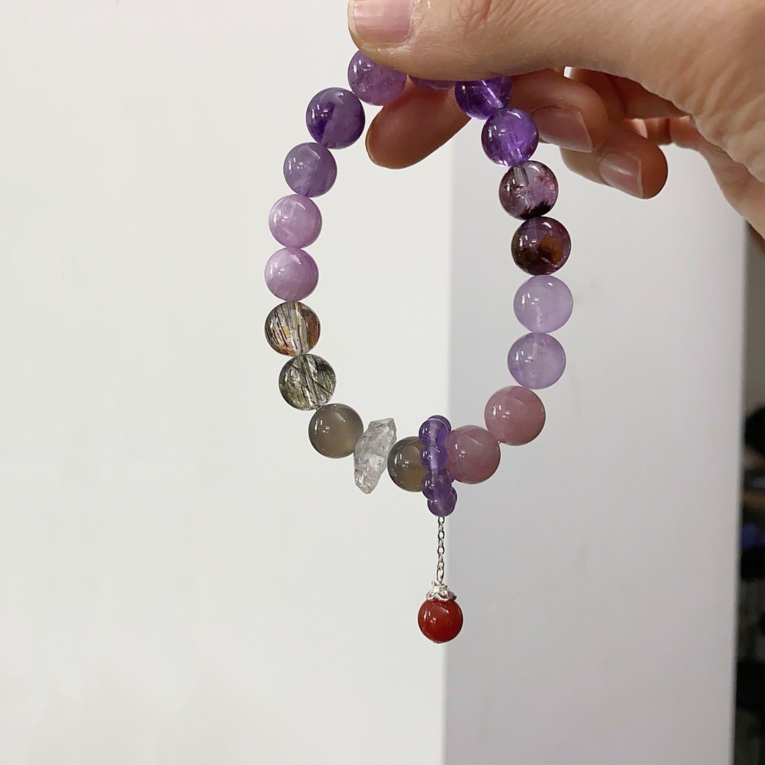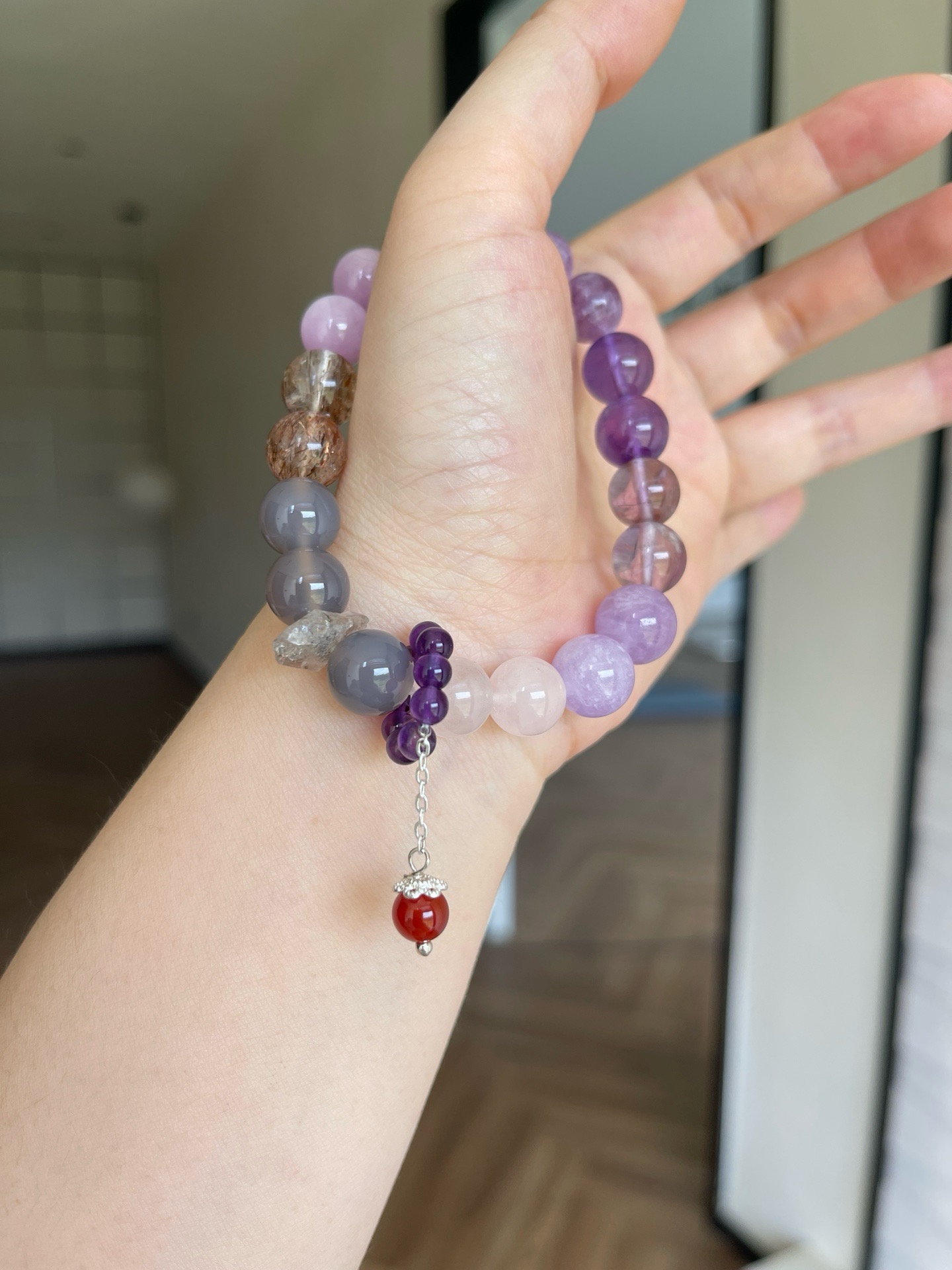 珠子种类:紫祖母晶+紫极光+紫锂辉+超七+紫玛瑙+闪灵钻+紫水晶跑环+紫马粉+薰衣草紫+紫幽灵+乌拉圭紫晶