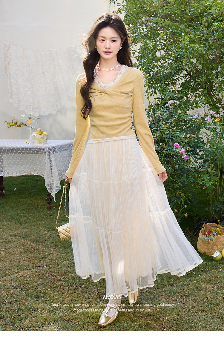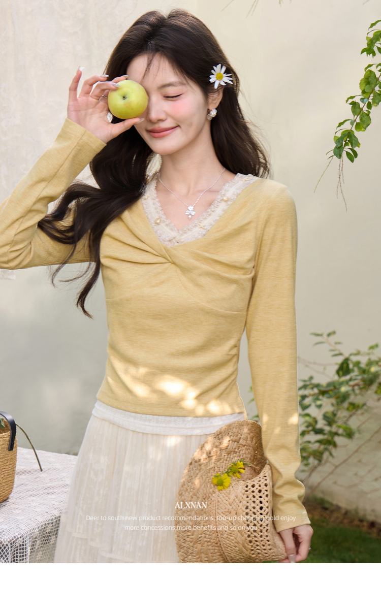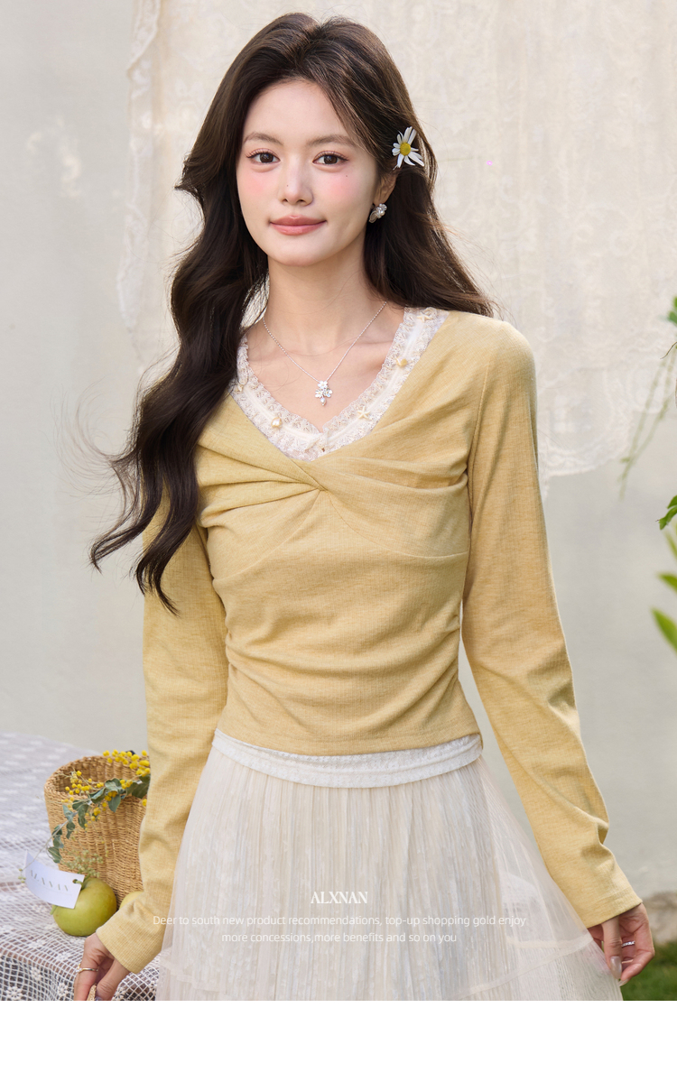 鹿向南「仙境之森」黄色假两件长袖t恤女春掐腰显瘦修身短款上衣