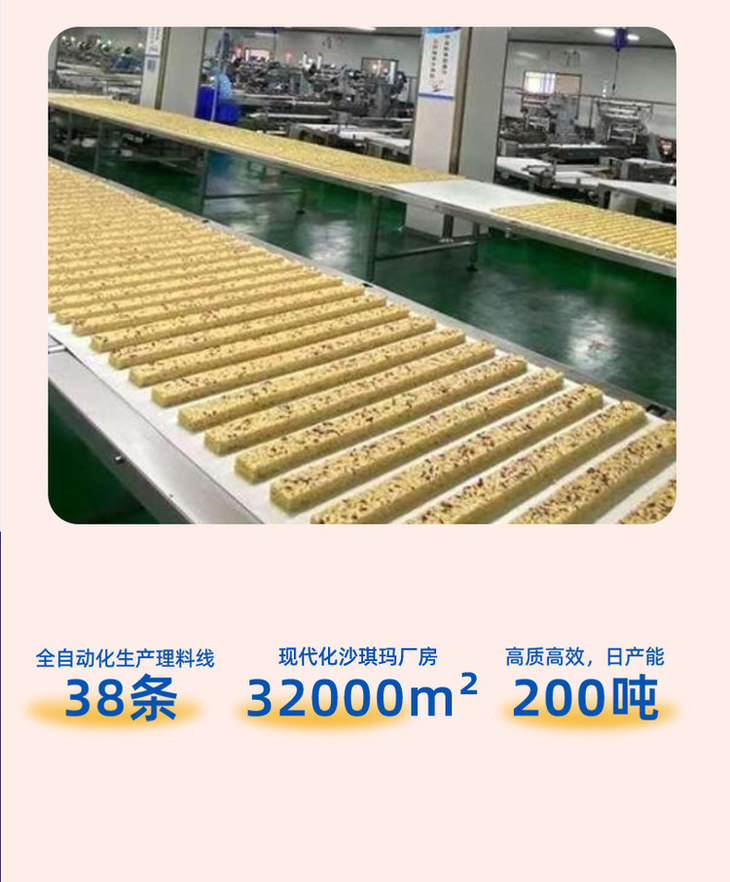 全蛋液和面,恒温醒发,十道揉压,制粒传输,二次醒发,多段控温油炸,精准制糖,卧式搅拌,成型切块,定量分装