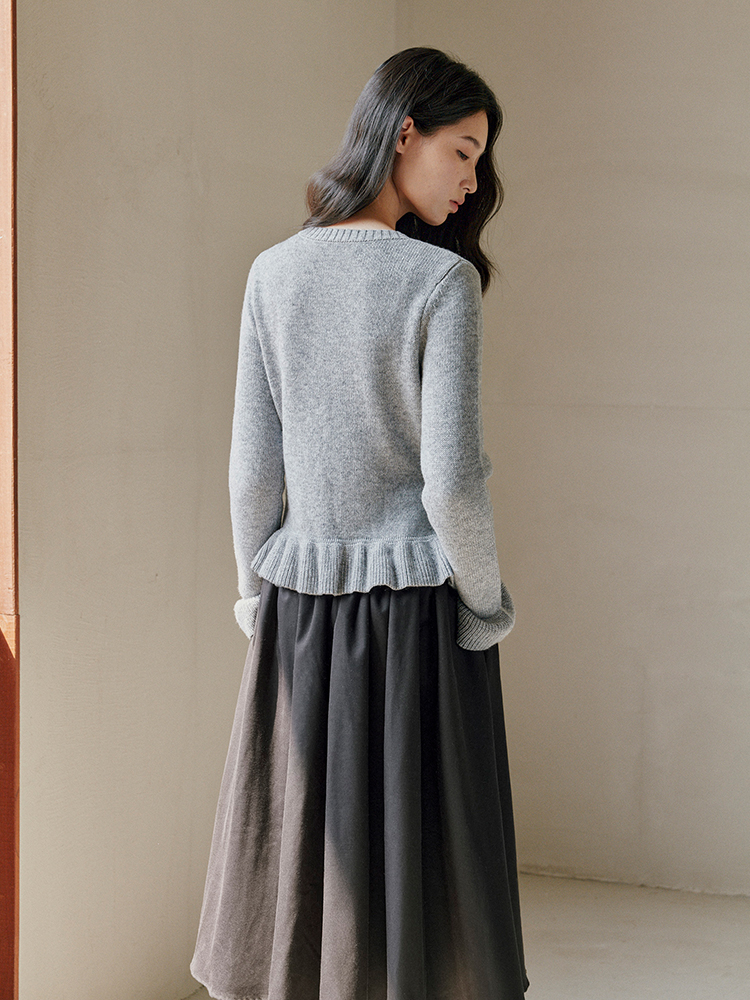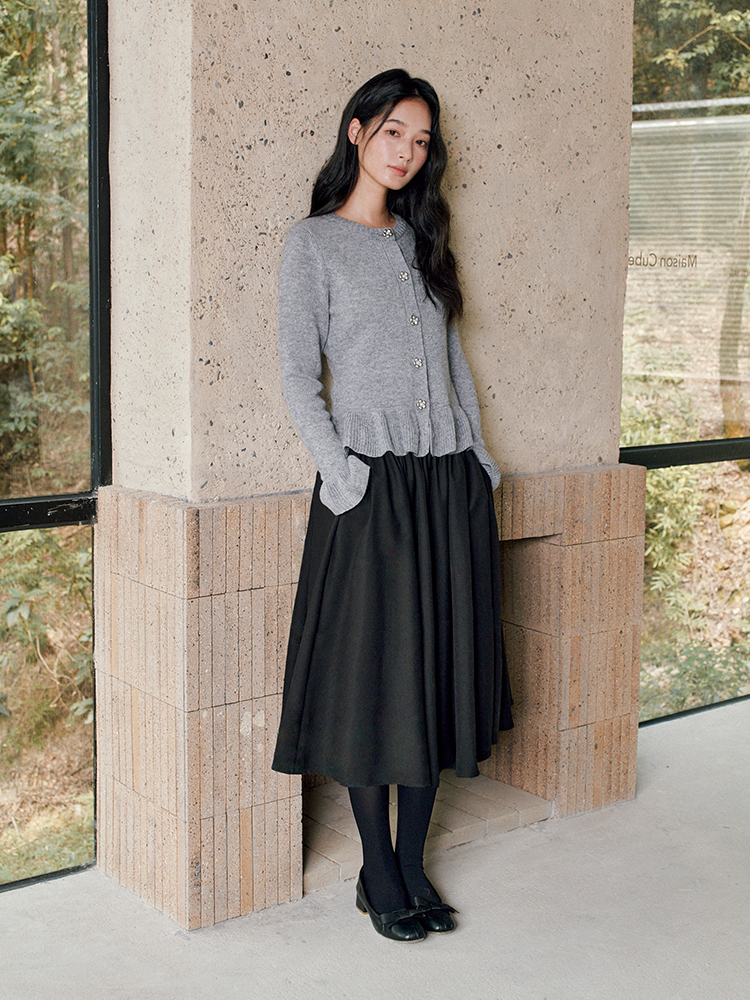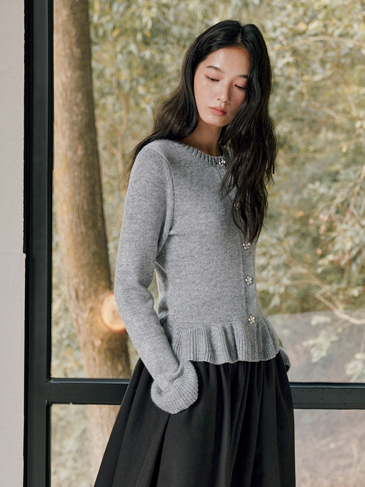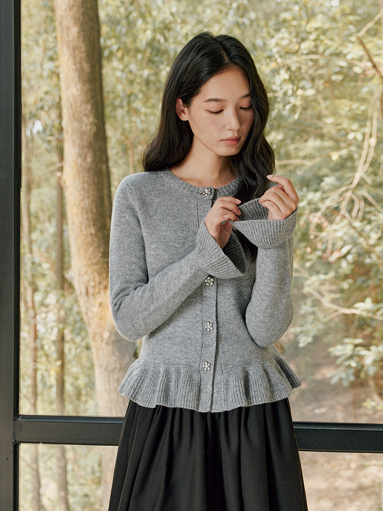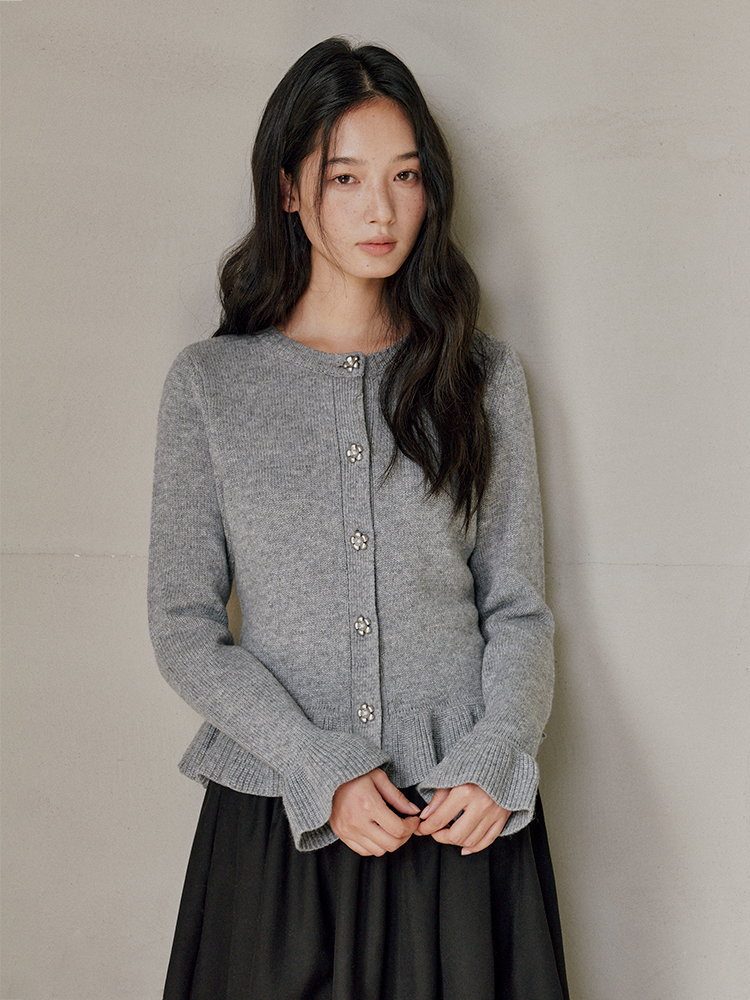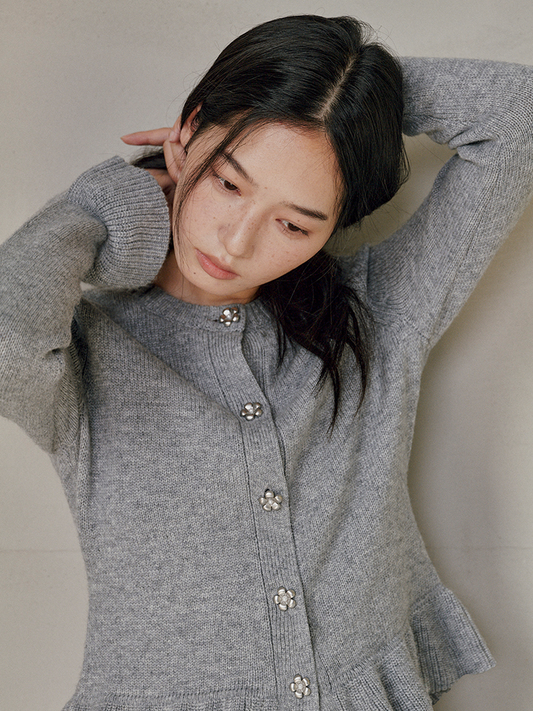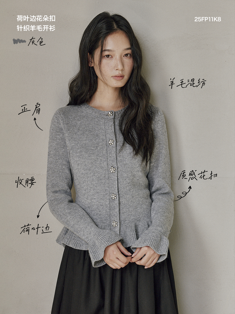 ForPoem 25/FW 原创设计荷叶边花朵扣灰色气质针织羊毛开衫外套