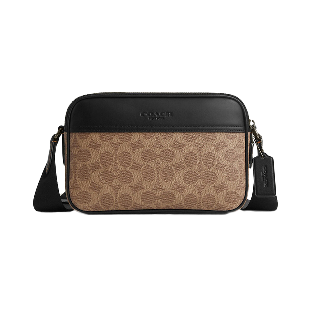 COACH蔻驰 Graham 23 品牌徽标可调节肩带 人造革拼牛皮革 单肩斜挎包 中号 男款 棕黄色拼黑色