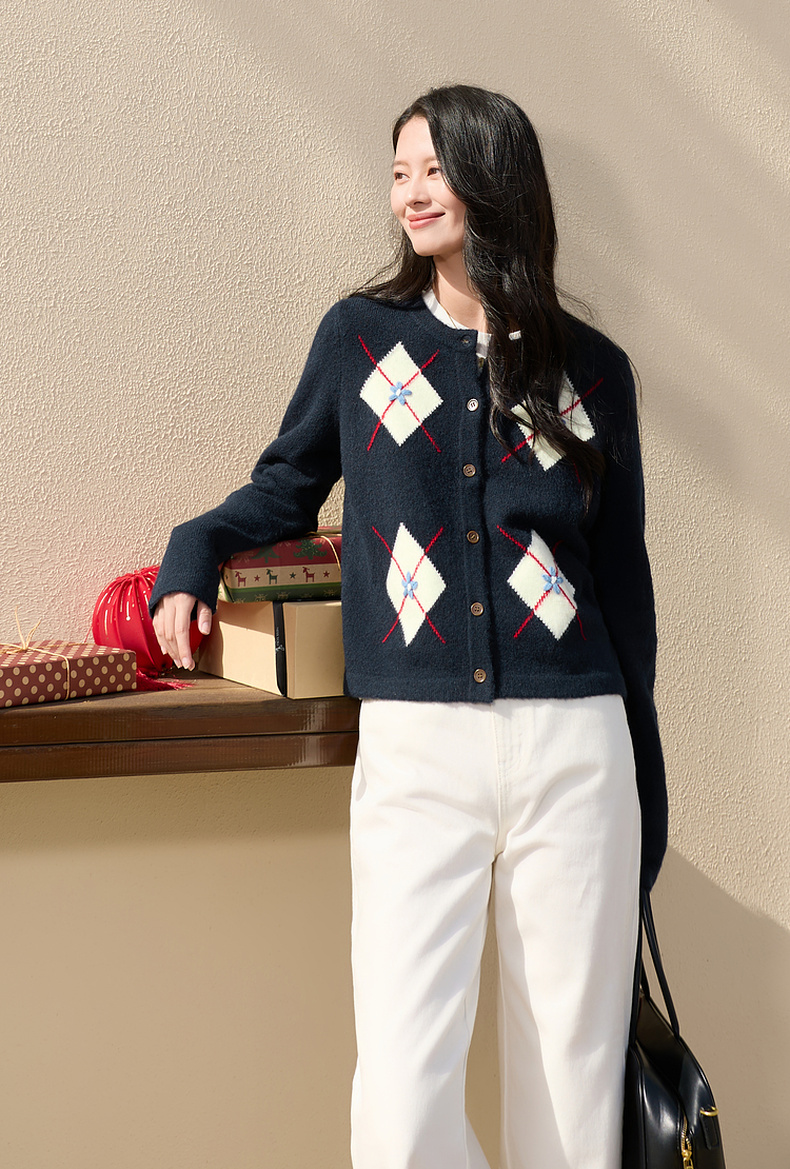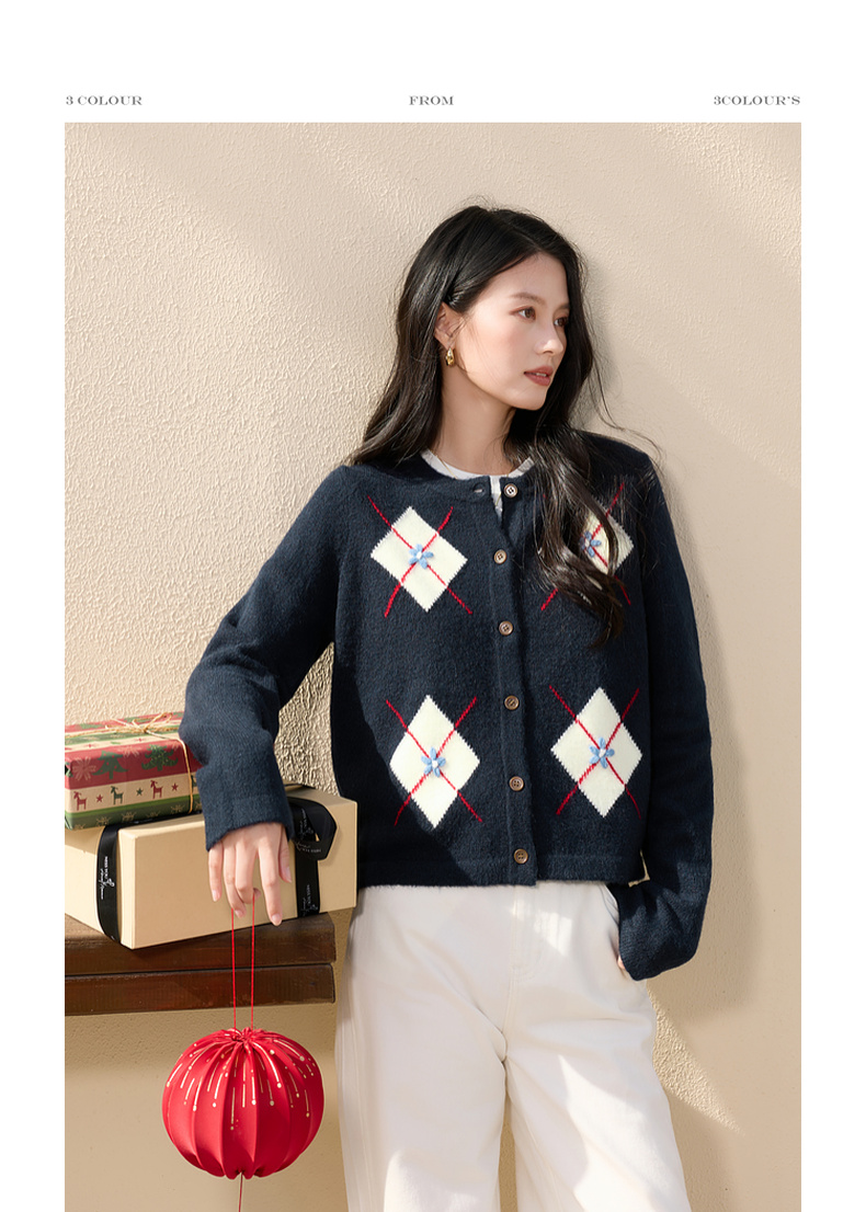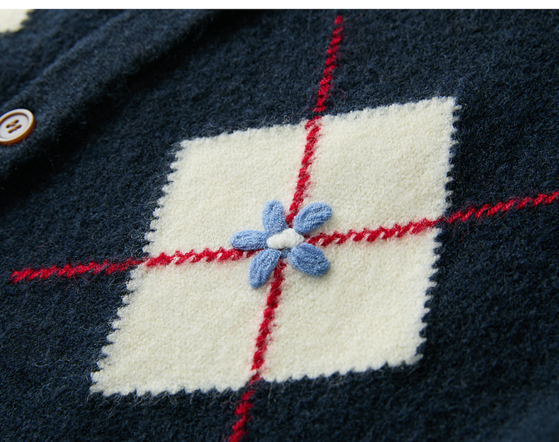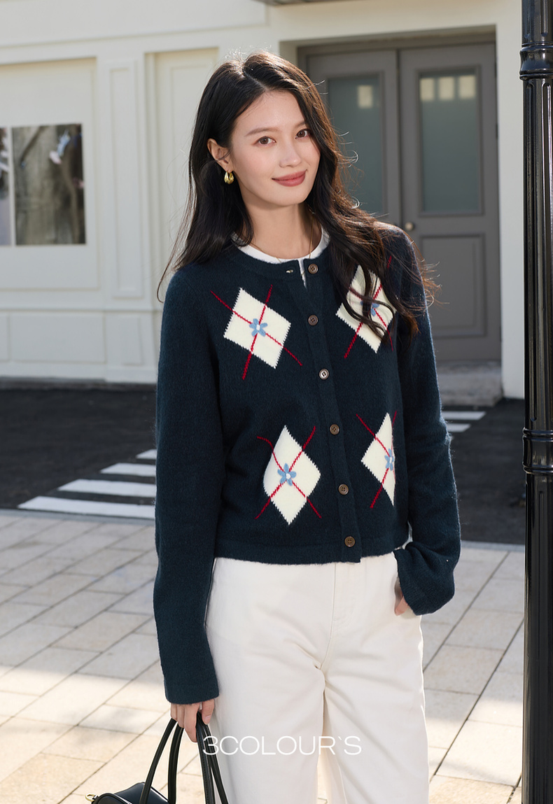 三彩2026春季新款花朵撞色菱格纹针织衫长袖圆领开衫外套上衣S