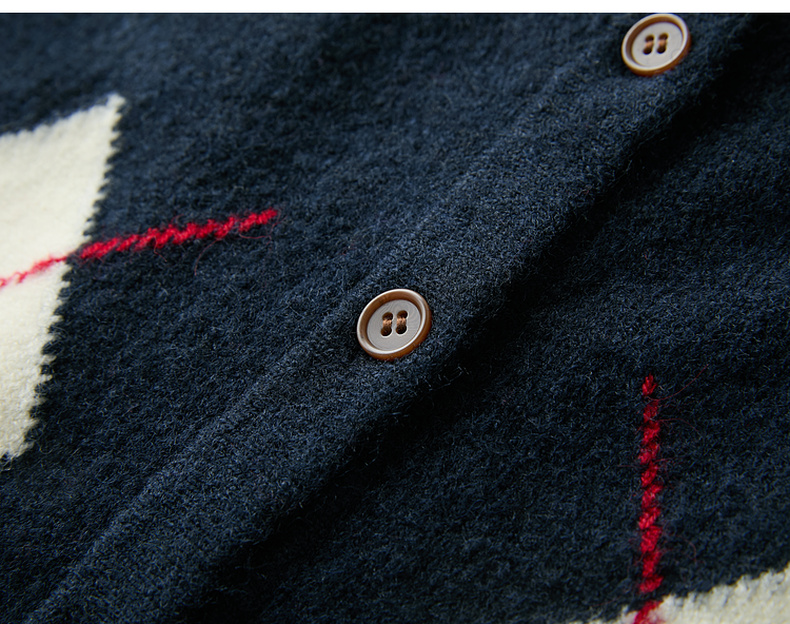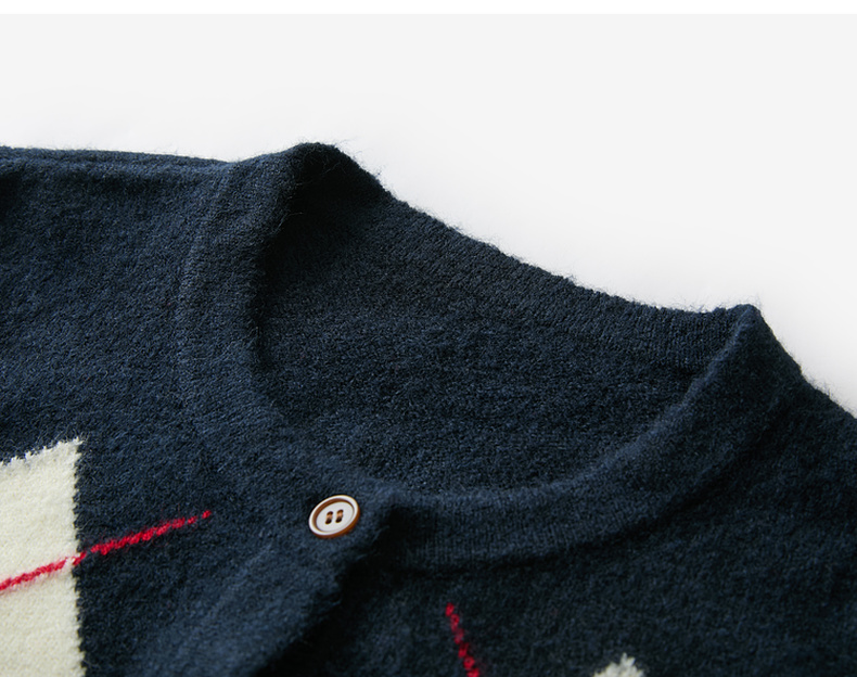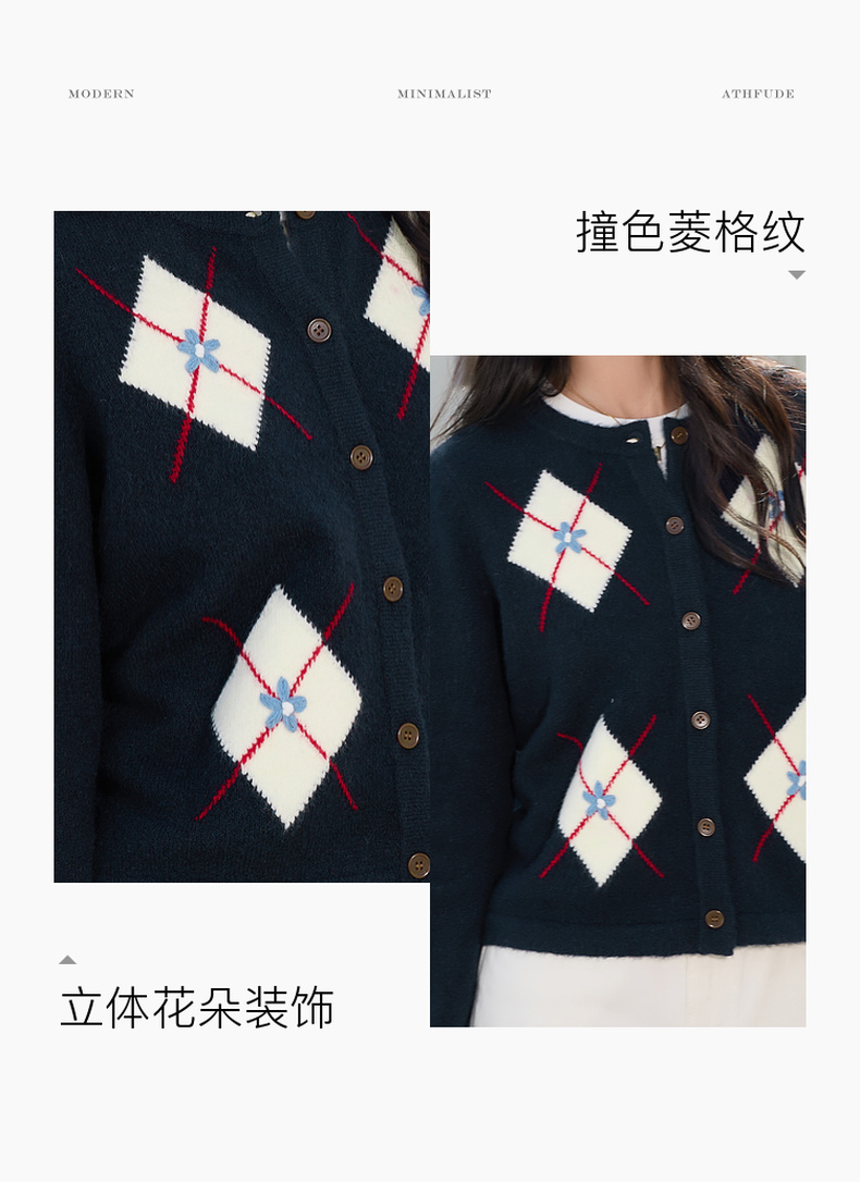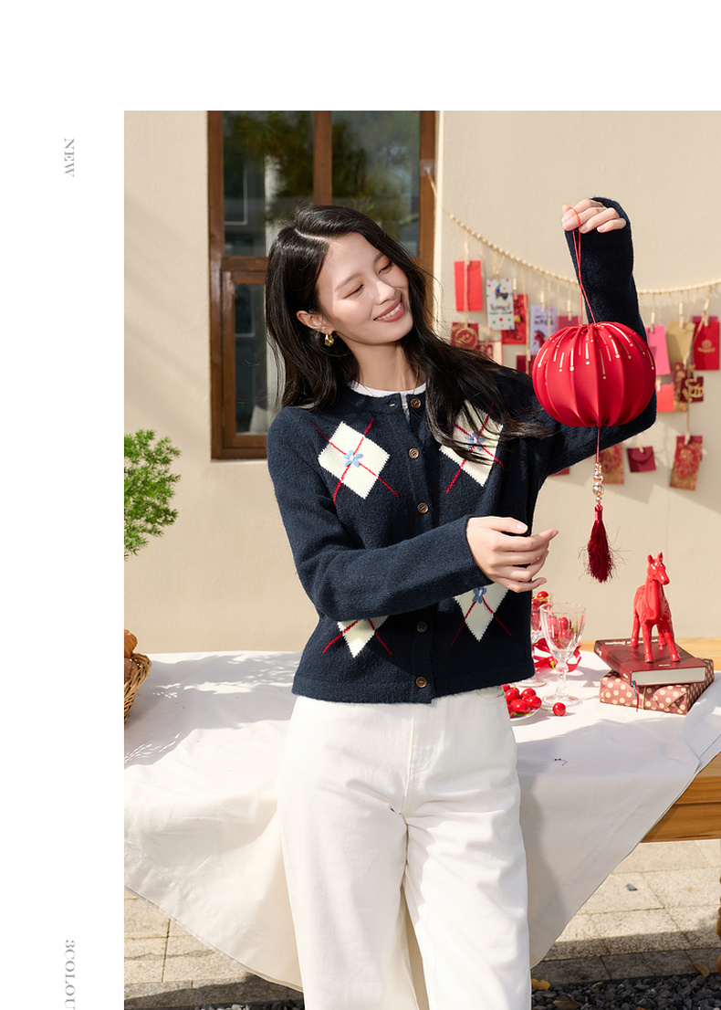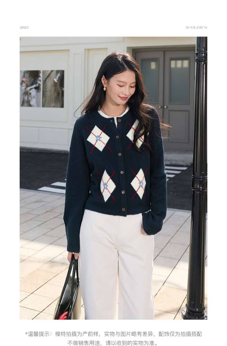 三彩2026春季新款花朵撞色菱格纹针织衫长袖圆领开衫外套上衣S
