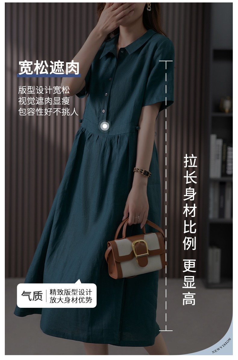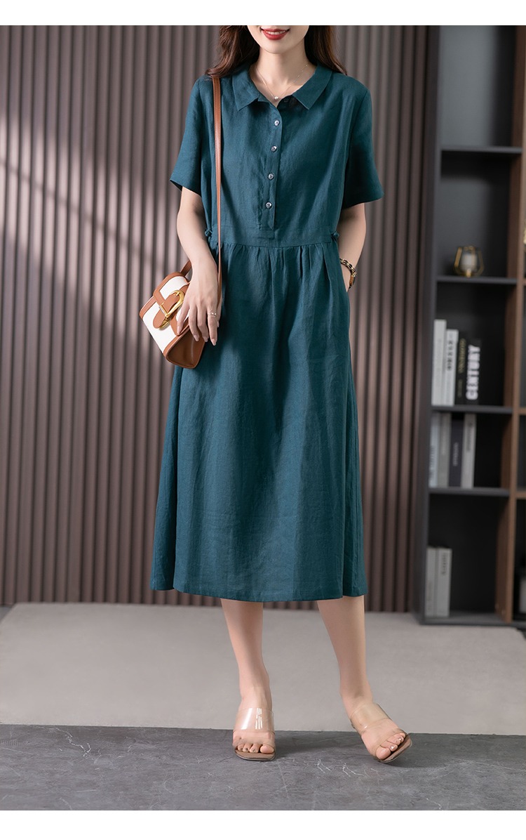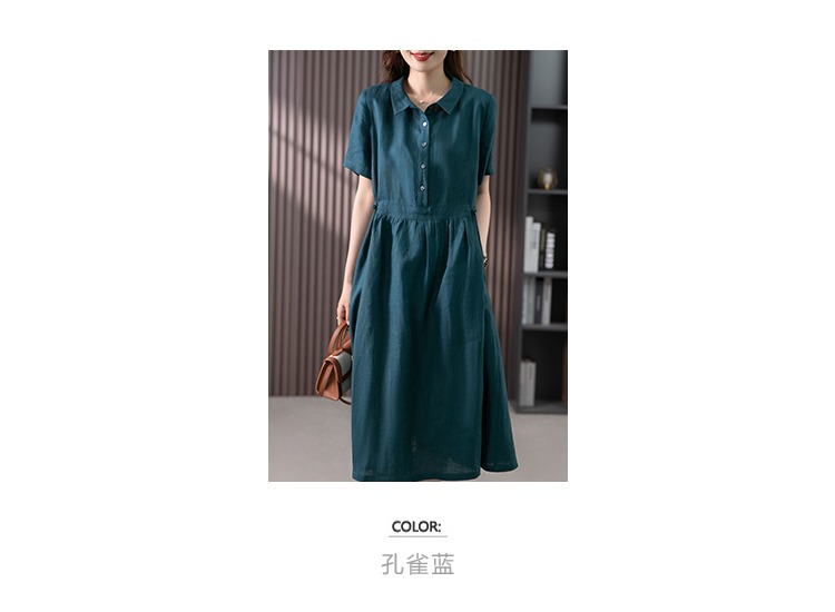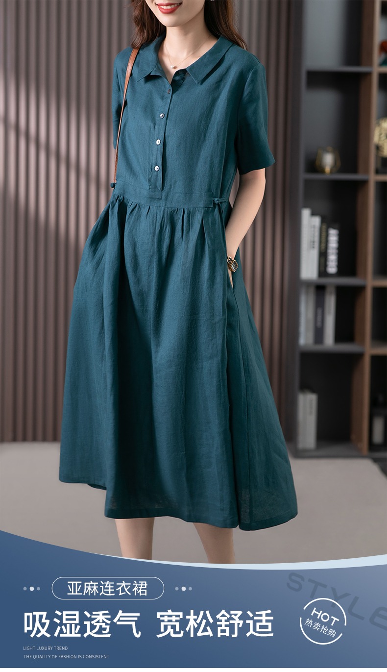 85835原形高级感亚麻连衣裙女夏季2024新款韩版短袖衬衫领文艺大摆长裙