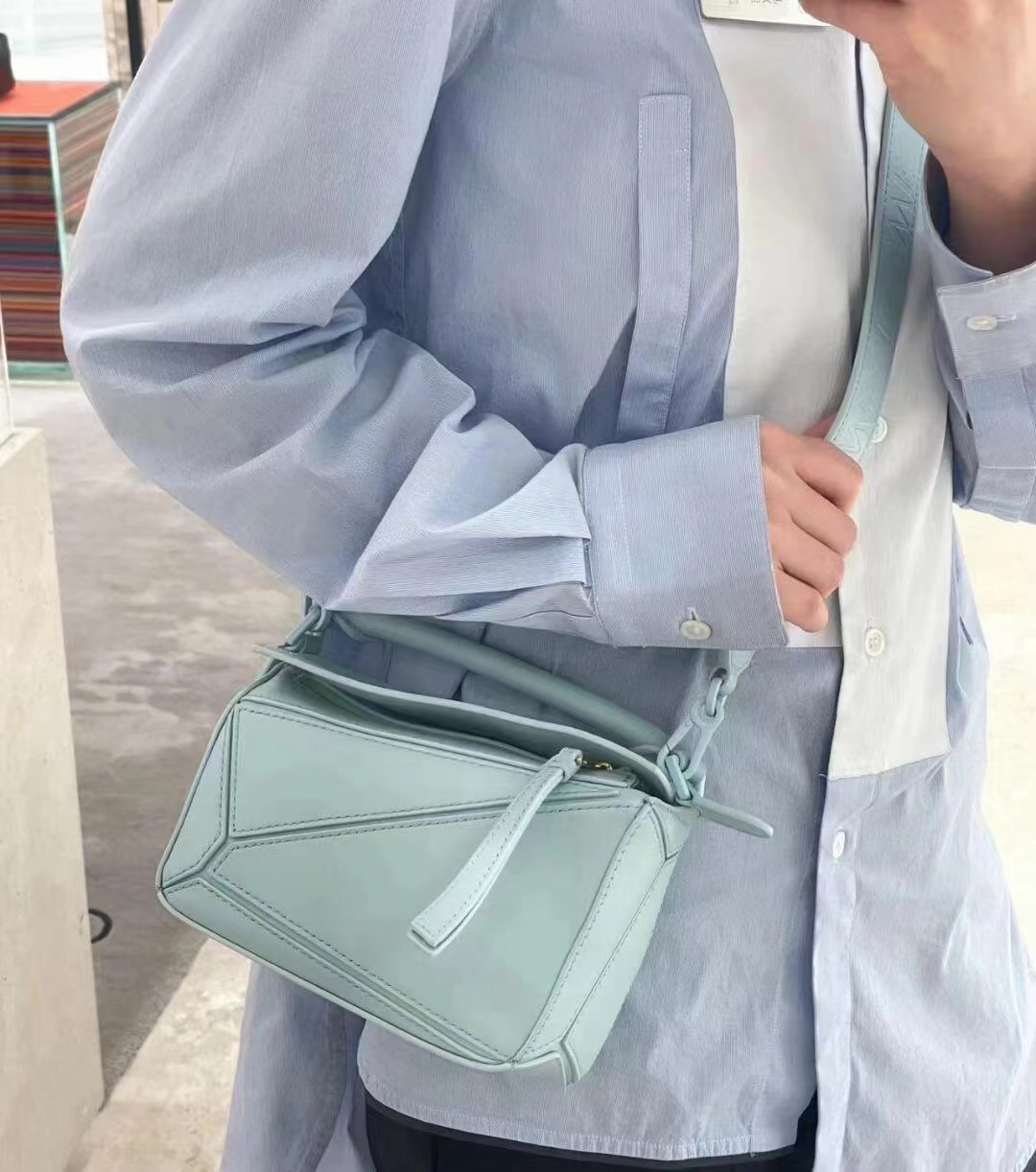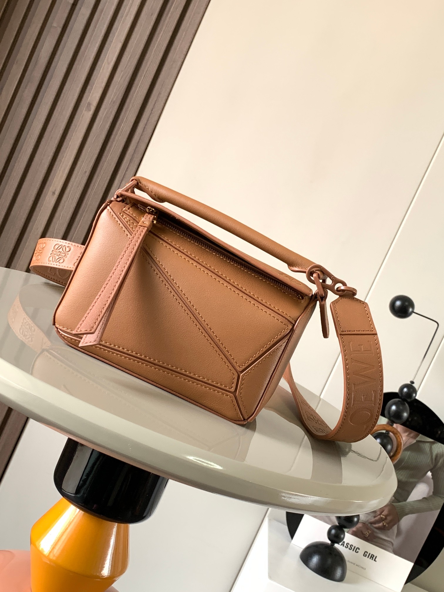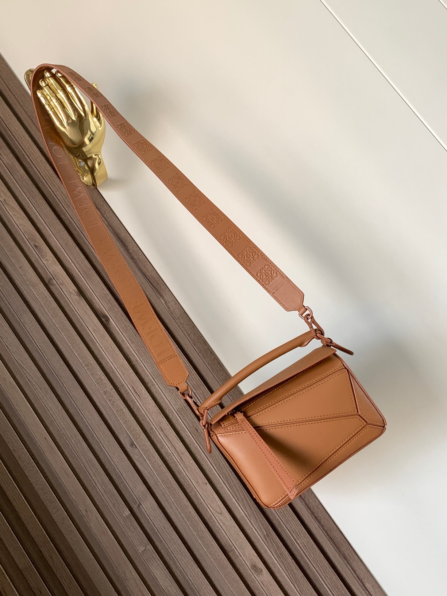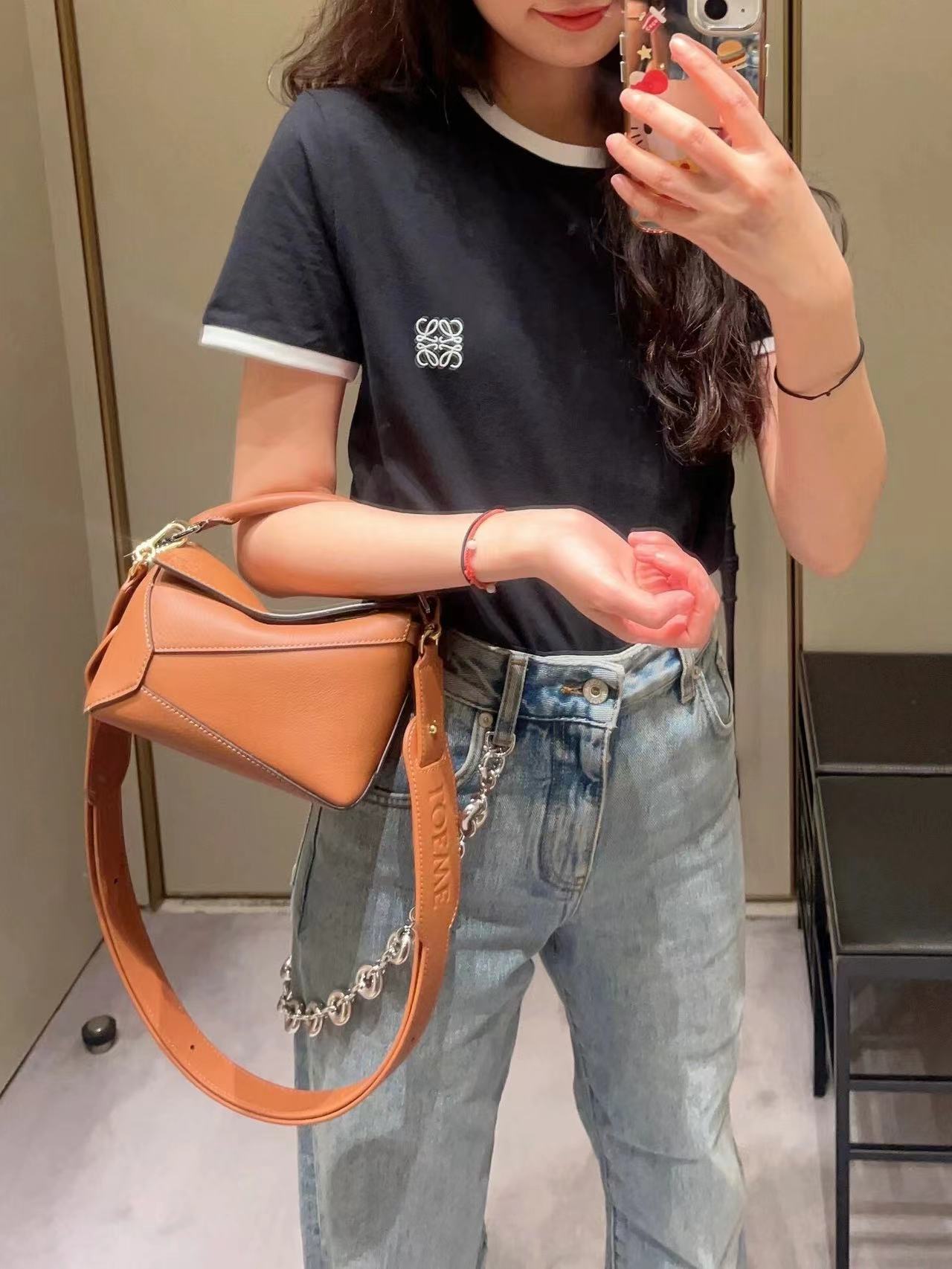 罗家爆款几何包 Puzzle 手袋是创意总监乔纳森·安德森为 L0EWE 推出的首款手提包 长方体形状和精确的切割技术创造了 Puzzle 独特的几何线条这个小尺寸版本采用柔软粒面牛皮革制成 小号可以容纳例如一只大号钱包、所有尺寸的手机和太阳镜 斜挎、肩背、手拿或顶部提手携带*可拆卸肩带 不一样的粗肩带,印有 L0EWE 字样的肩带,金属扣位置采用了与包包同一色系 让包包更加时尚,整体依然保持包包很轻的重量 十分耐用,轻便,能装很多东西,适合上班,旅游