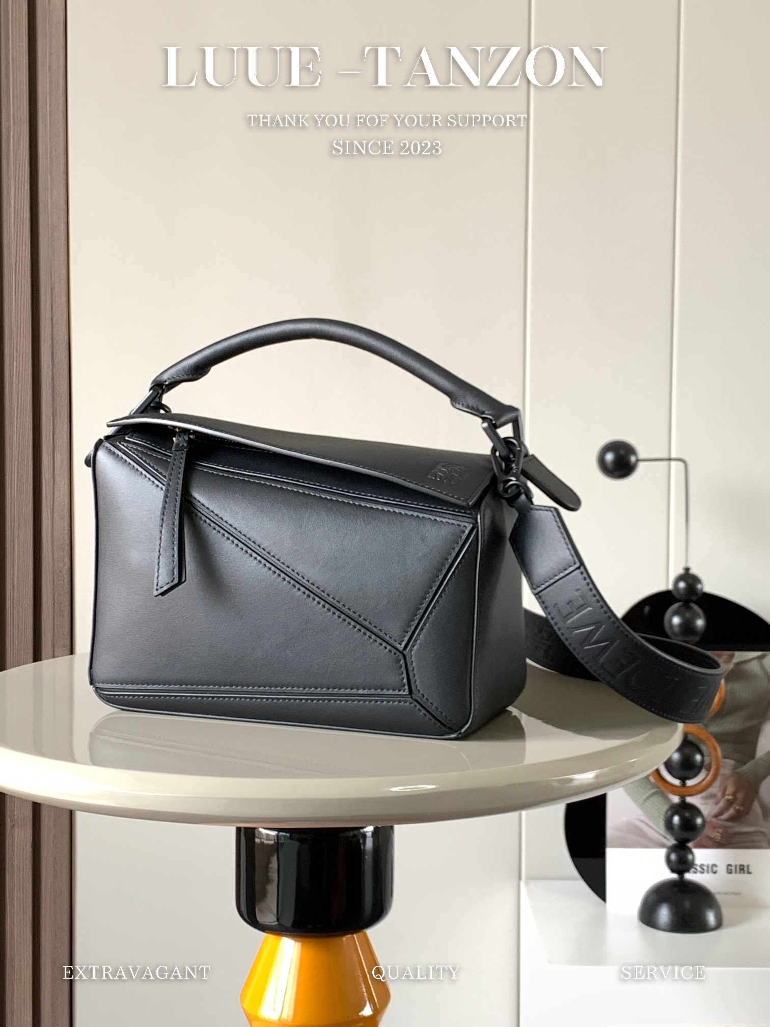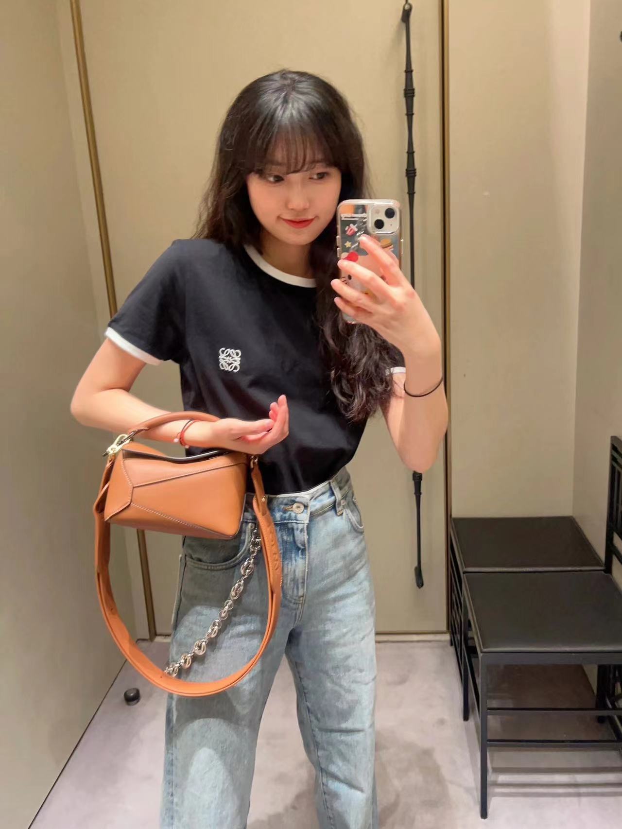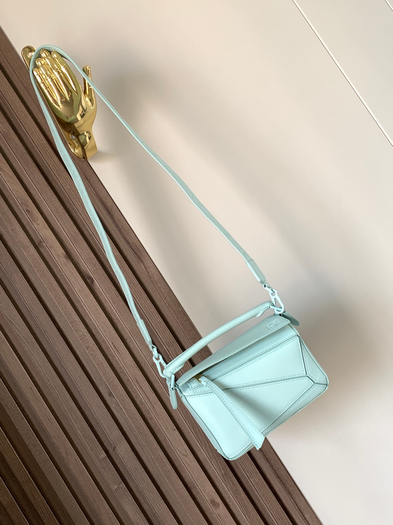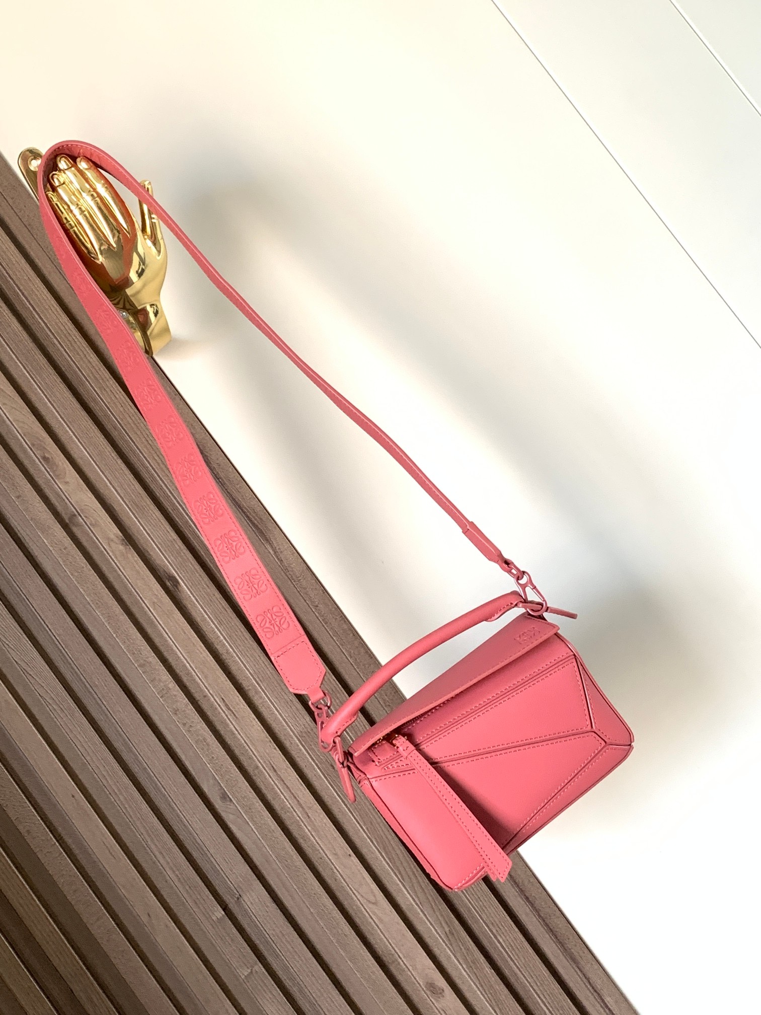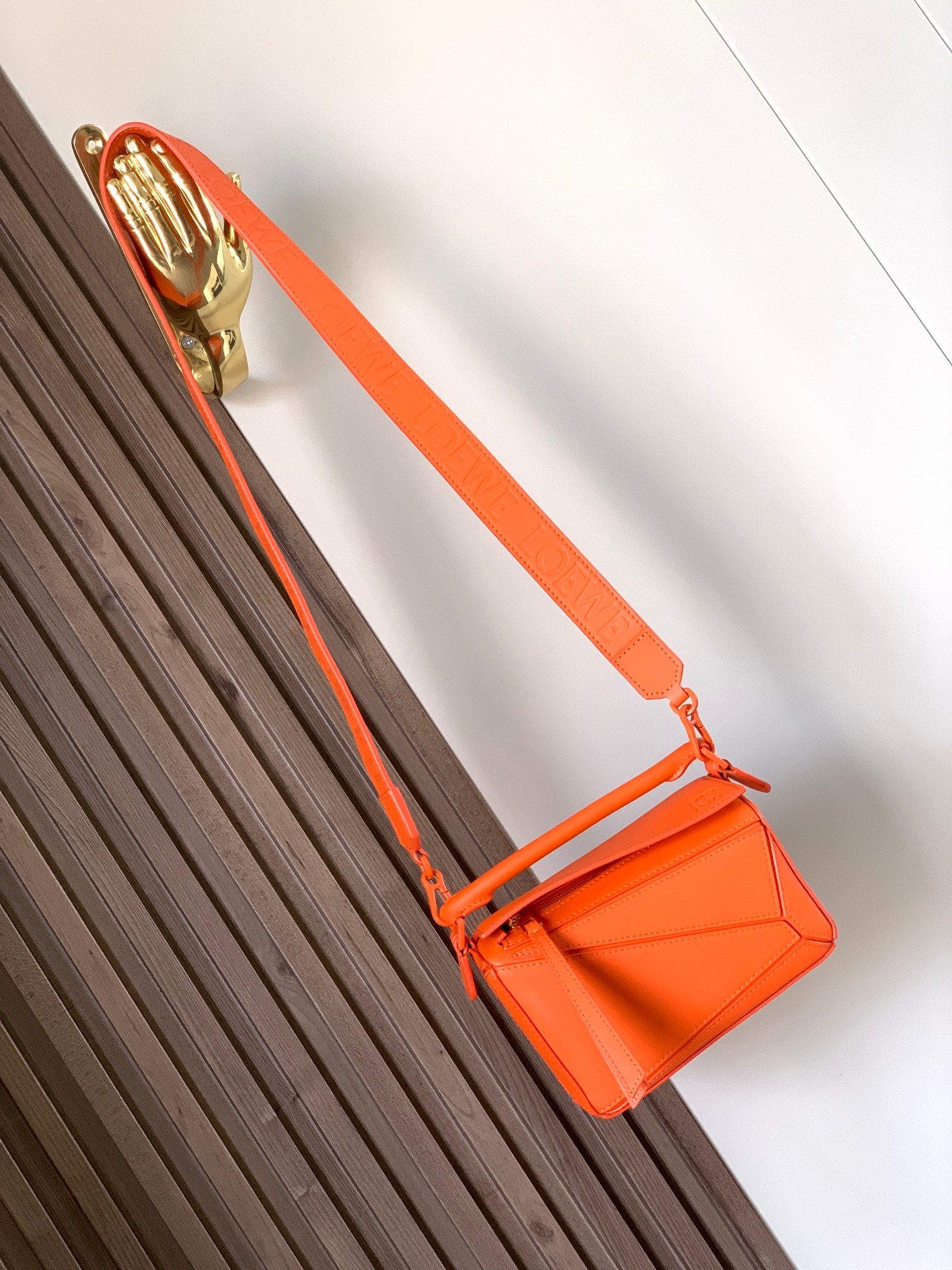 罗家爆款几何包 Puzzle 手袋是创意总监乔纳森·安德森为 L0EWE 推出的首款手提包 长方体形状和精确的切割技术创造了 Puzzle 独特的几何线条这个小尺寸版本采用柔软粒面牛皮革制成 小号可以容纳例如一只大号钱包、所有尺寸的手机和太阳镜 斜挎、肩背、手拿或顶部提手携带*可拆卸肩带 不一样的粗肩带,印有 L0EWE 字样的肩带,金属扣位置采用了与包包同一色系 让包包更加时尚,整体依然保持包包很轻的重量 十分耐用,轻便,能装很多东西,适合上班,旅游