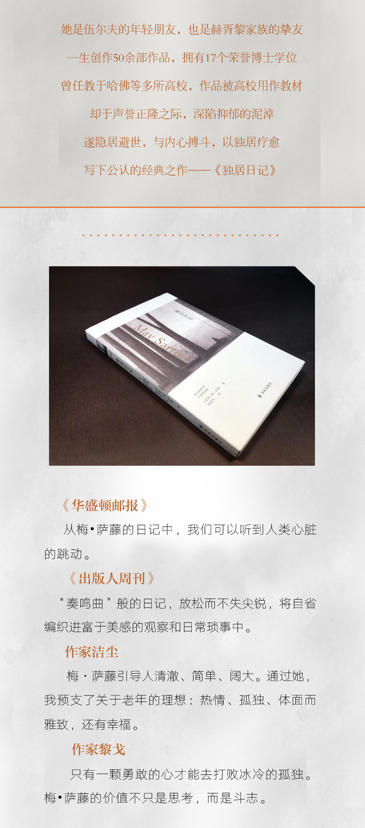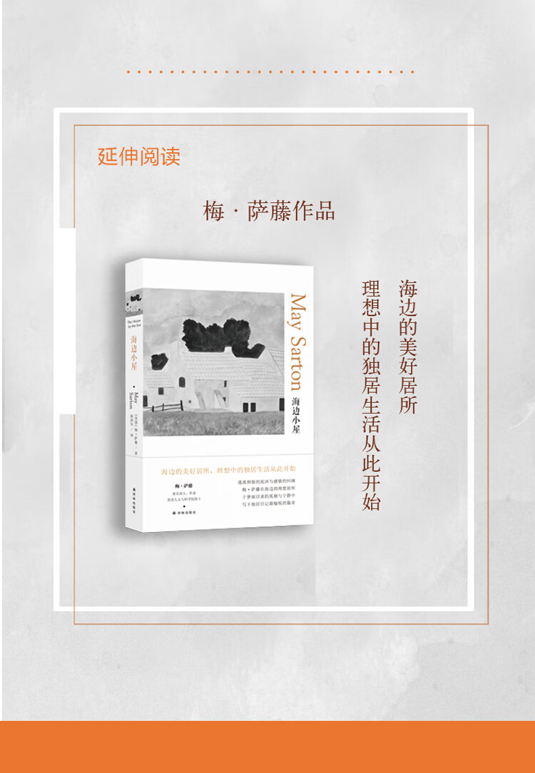 梅•萨藤,美国知名诗人、小说家、日记体作家。出生于比利时,四岁时因一战爆发随父母移民美国。梅•萨藤继承了科学史作家父亲的勤奋严谨,和艺术家母亲的创造力,在近六十年的写作生涯里,创作了五十余部作品。曾在包括哈佛大学在内的多所高校任教,作品被美国各地高校用作教材。1958年当选美国人文与科学院院士。 梅•萨藤写作半生,声誉正隆之际,选择隐居避世,侍弄花草,思考创作,以日记与自己对话。这些日记的出版将梅•萨藤的写作推至一个新的高度,为她赢得国际性声誉。其中以《独居日记》《海边小屋》为代表之作,《独居小屋》更被认为是“现代女性自传的里程碑”。