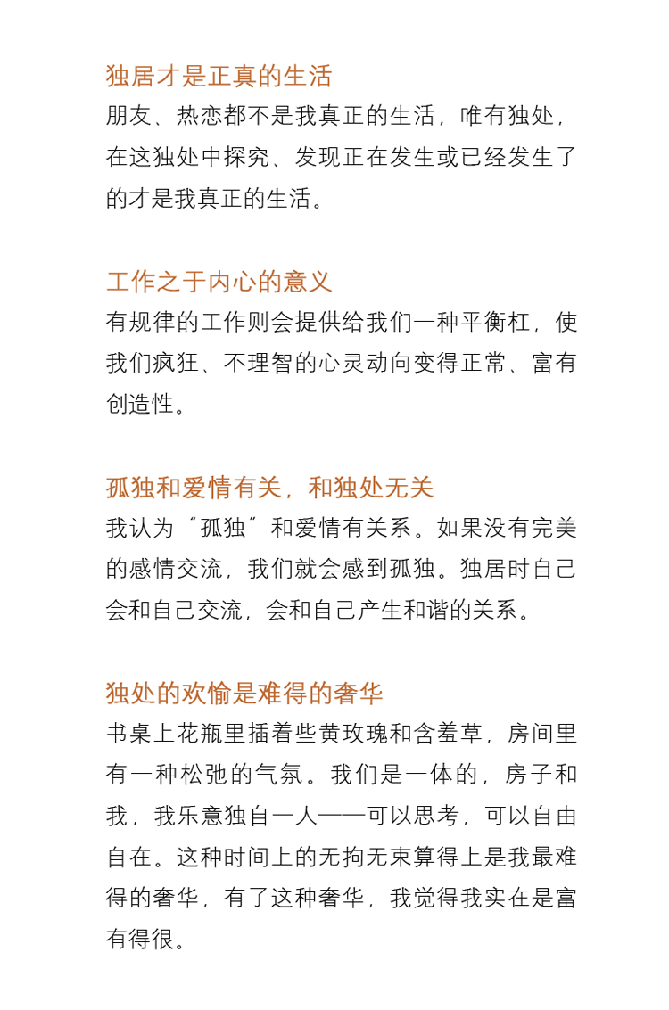 《独居日记》是梅•萨藤五本日记中公认的经典之作。梅•萨藤于声誉正隆之时,隐居避世,与内心搏斗,以独居疗愈。日记中,她时常谈论自己的思考和创作、恋情与友情,不断记下日常生活的琐事,和对变幻无常却又惊喜不断的四季的细致观察,这一切不断抚慰着她敏感、脆弱的内心。
