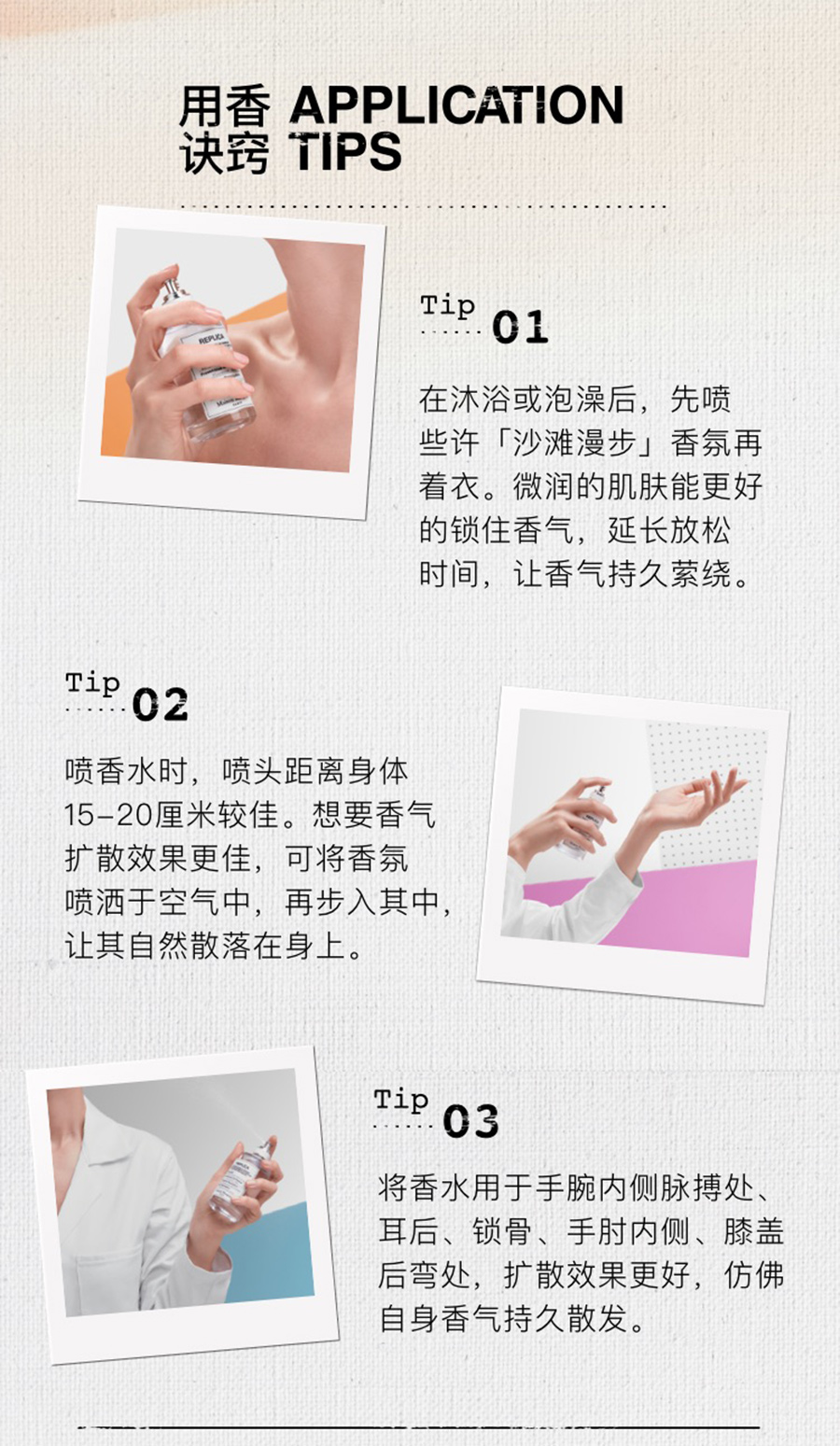 1.流汗处不要使用:避免香水和汗水混合在一起,而产生变化的味道,特别是头发、腋下等汗多的部位。
