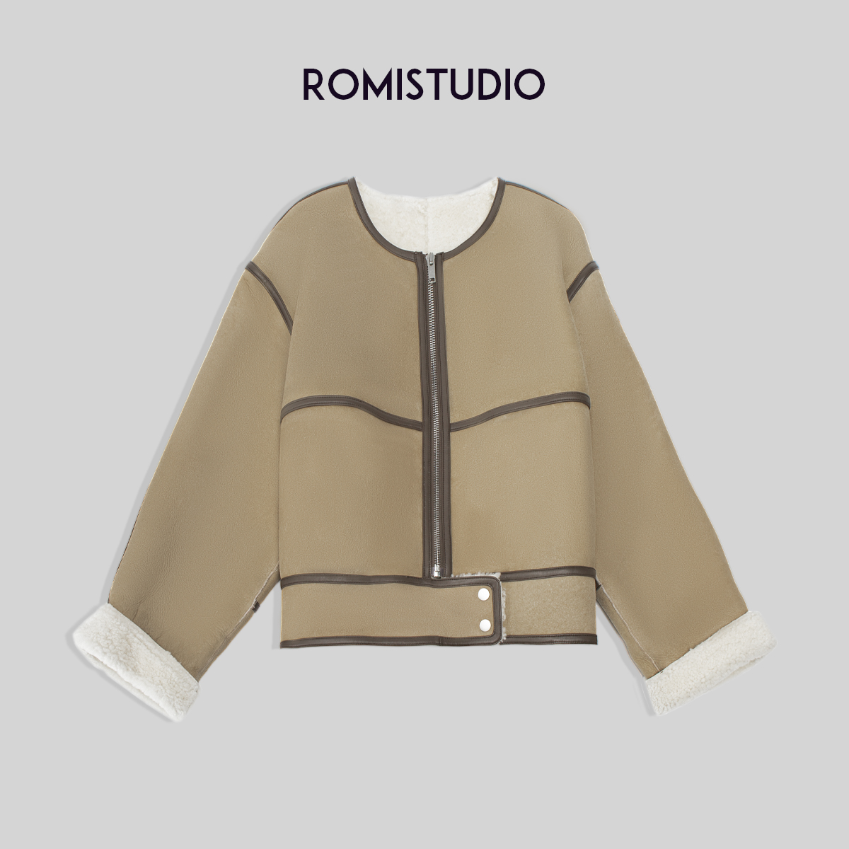 ROMI STUDIO【皮毛一ti】澳洲美丽nu 圆领宽松廓版皮衣外套W2262