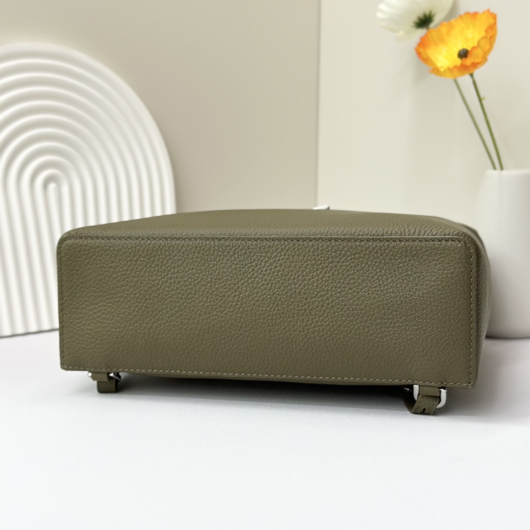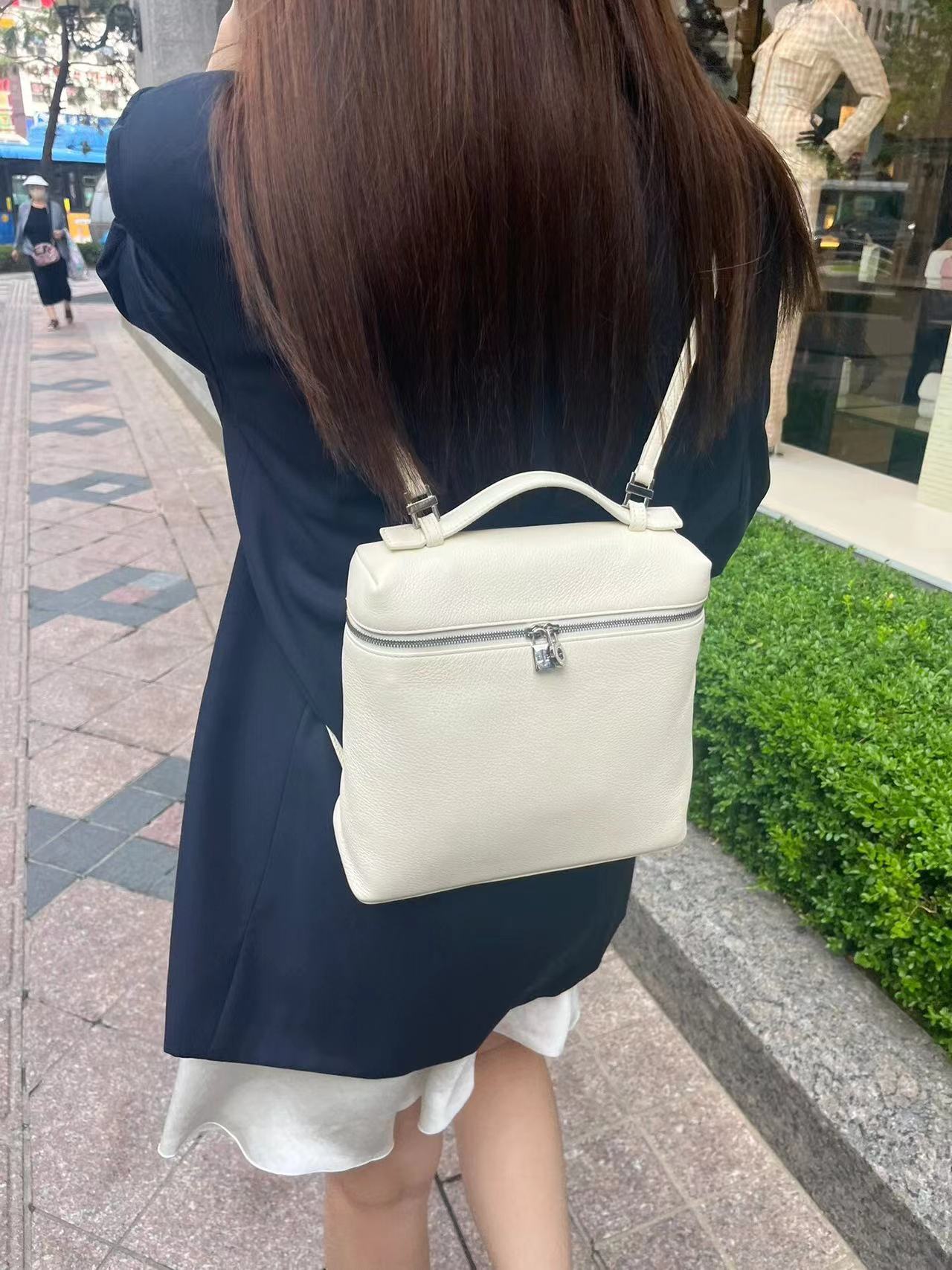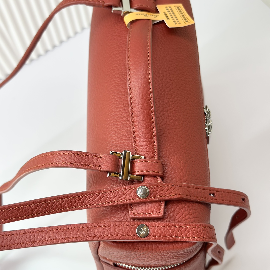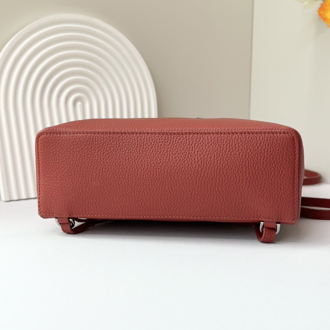 宽开口大容量方型双肩包,包身采用进口原厂小牛皮材质,轻微的锤花呈现优雅的纹理,内里采用进口原厂小羊皮。配有肩带,双向拉链开合和My Charms银色金属挂饰(特级全钢配件五金)