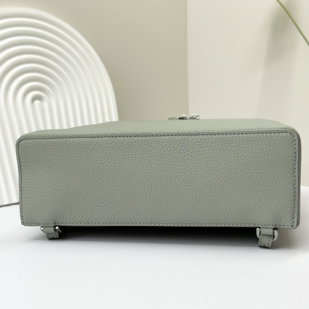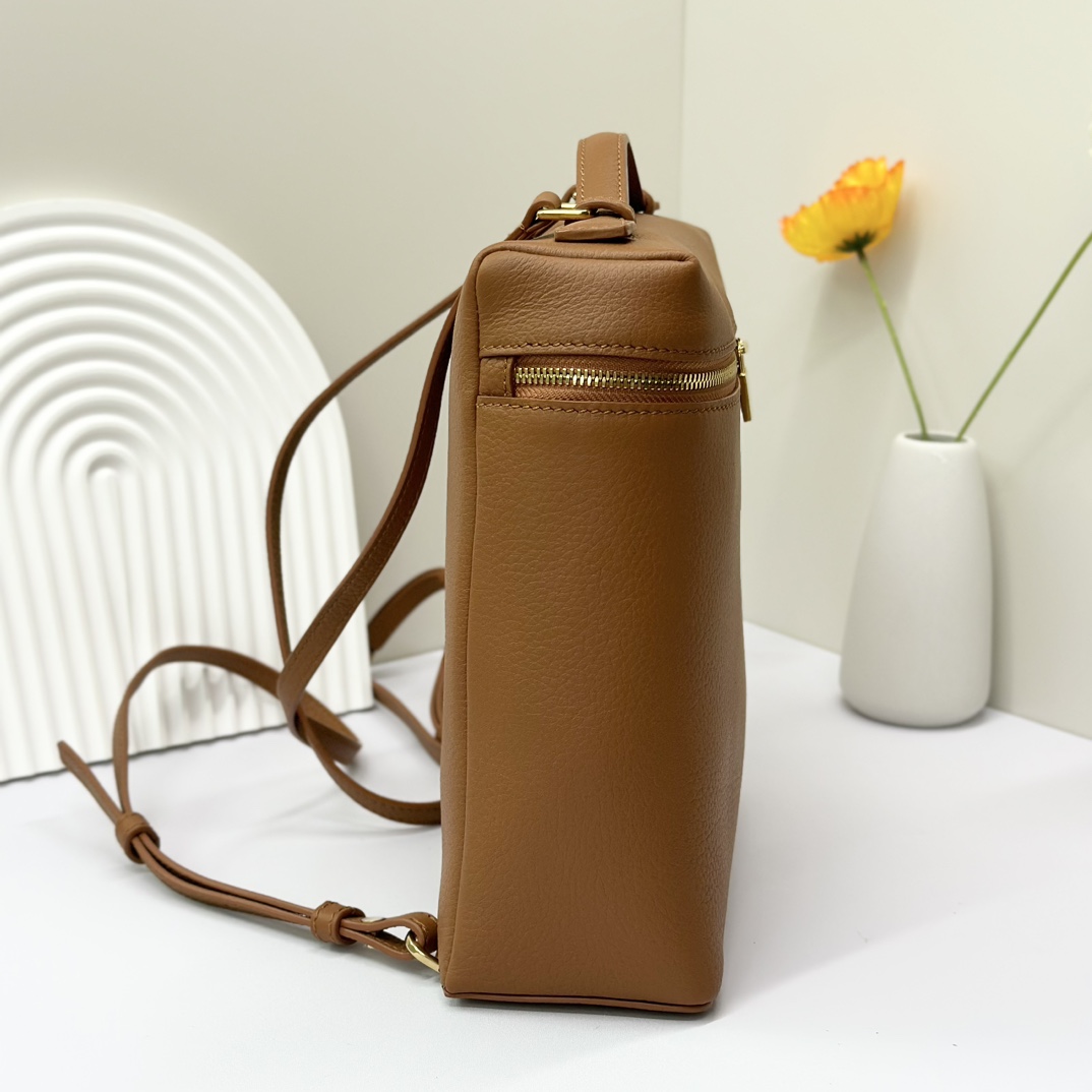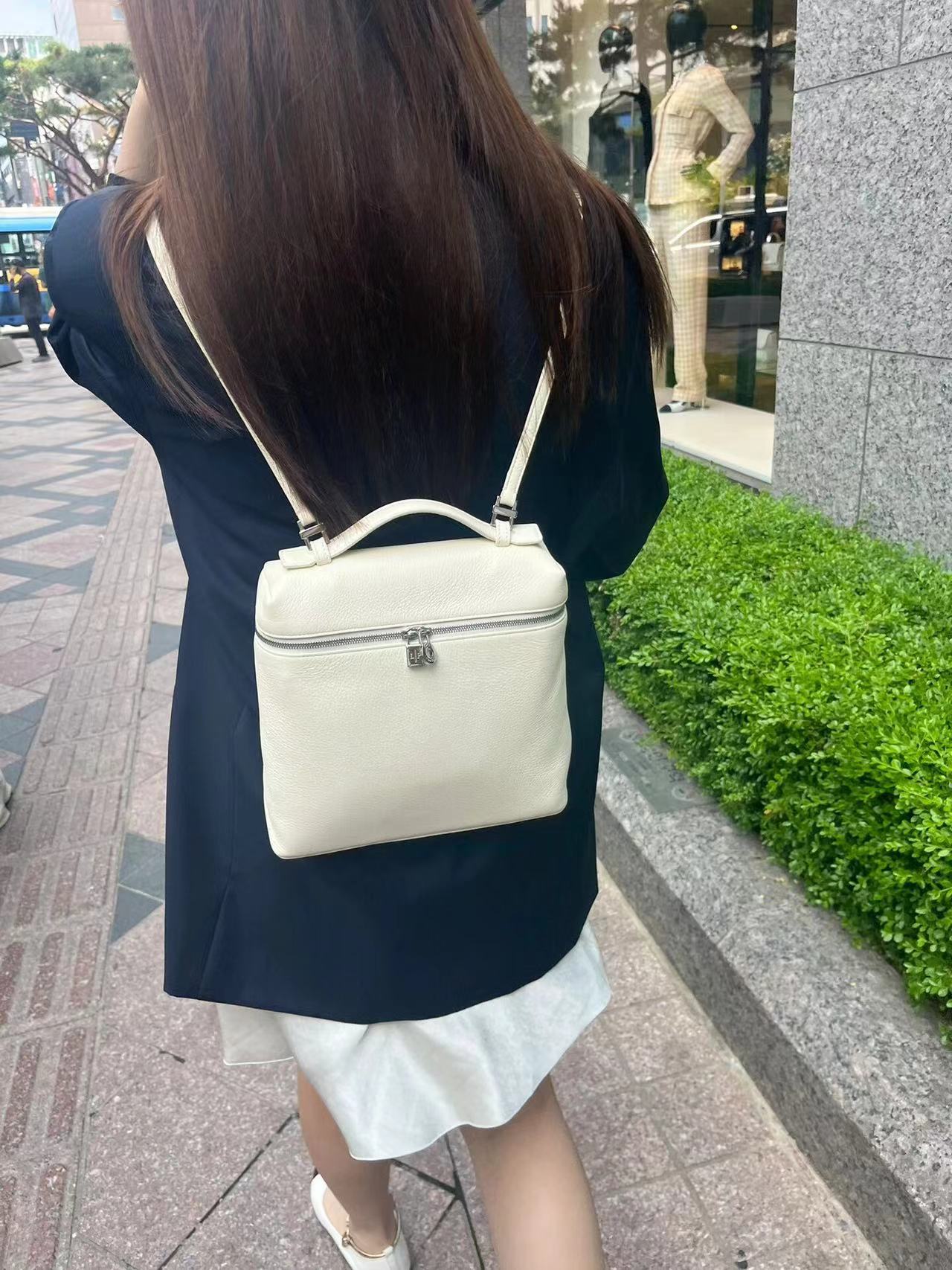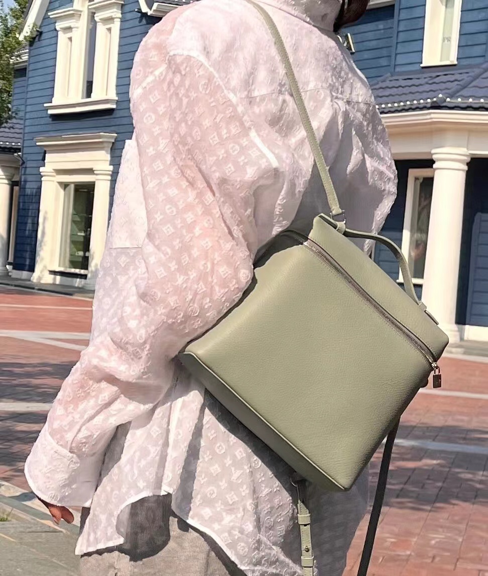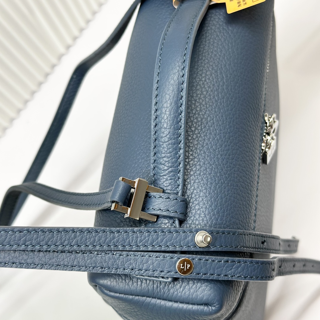 宽开口大容量方型双肩包,包身采用进口原厂小牛皮材质,轻微的锤花呈现优雅的纹理,内里采用进口原厂小羊皮。配有肩带,双向拉链开合和My Charms银色金属挂饰(特级全钢配件五金)