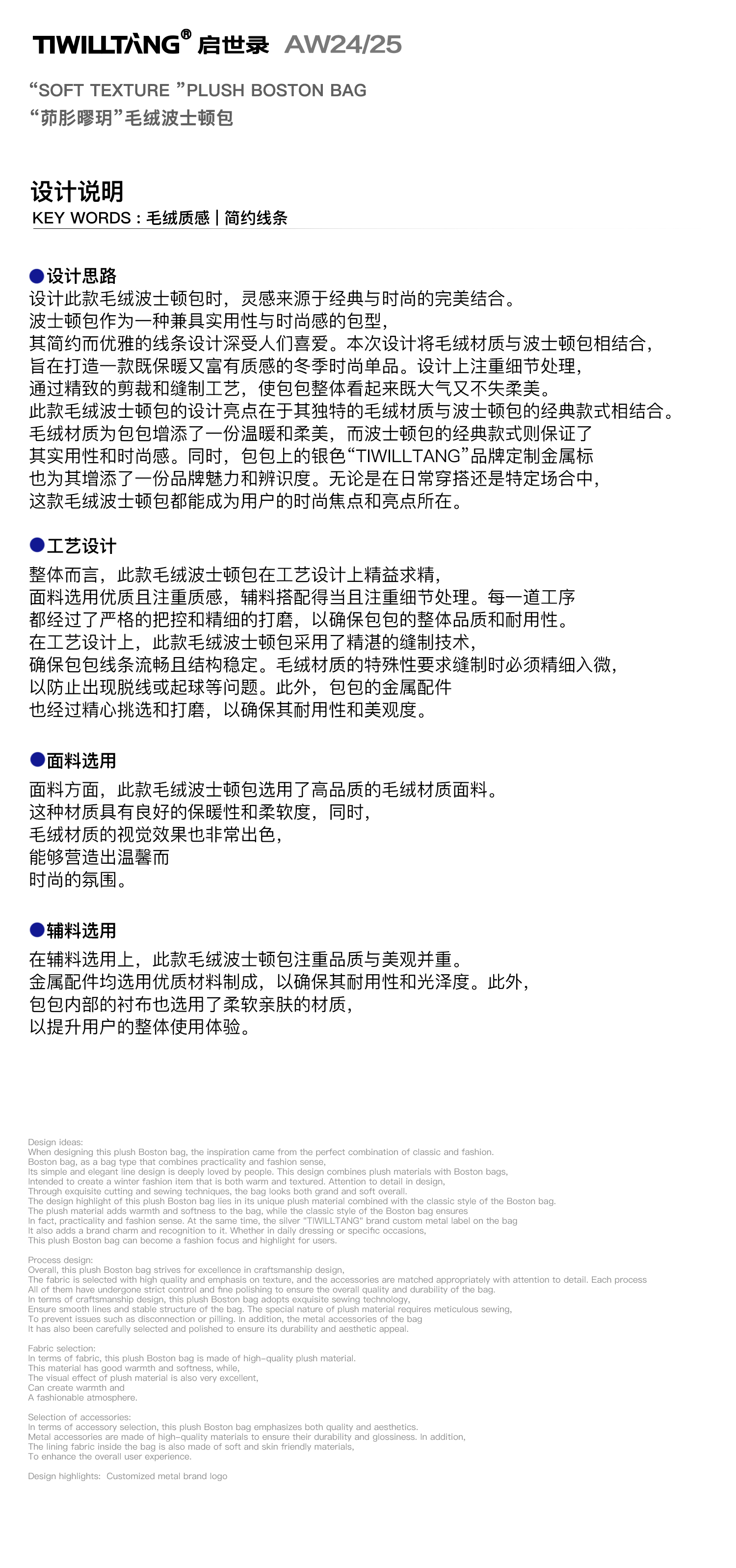 启世录TIWILLTANG"茆肜㬔玥”毛绒波士顿包
