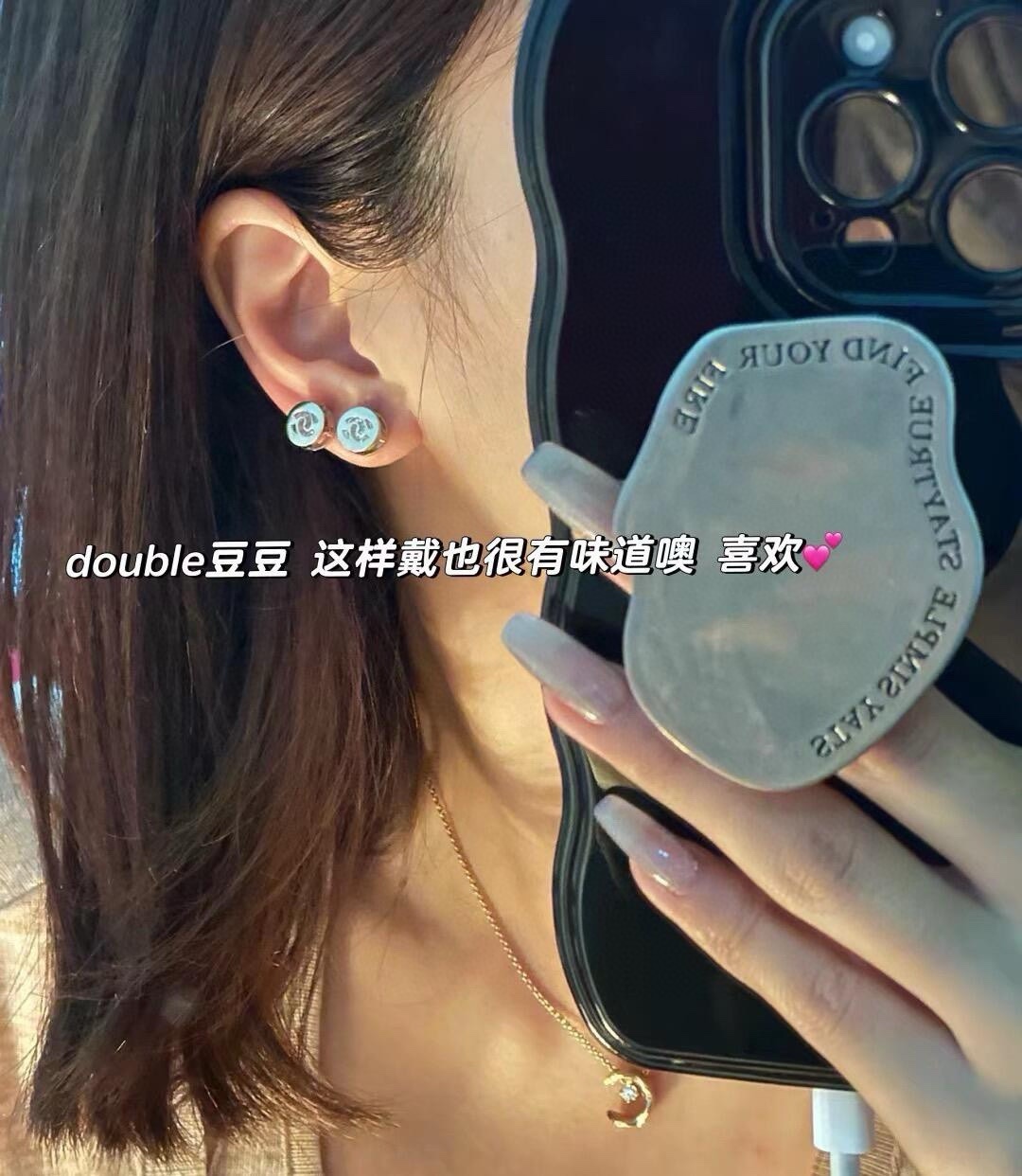 复古水钻的设计!采用了经典的香奈儿双C标志和心形设计,中间镶嵌着闪耀的水钻,增添了一丝奢华感。
