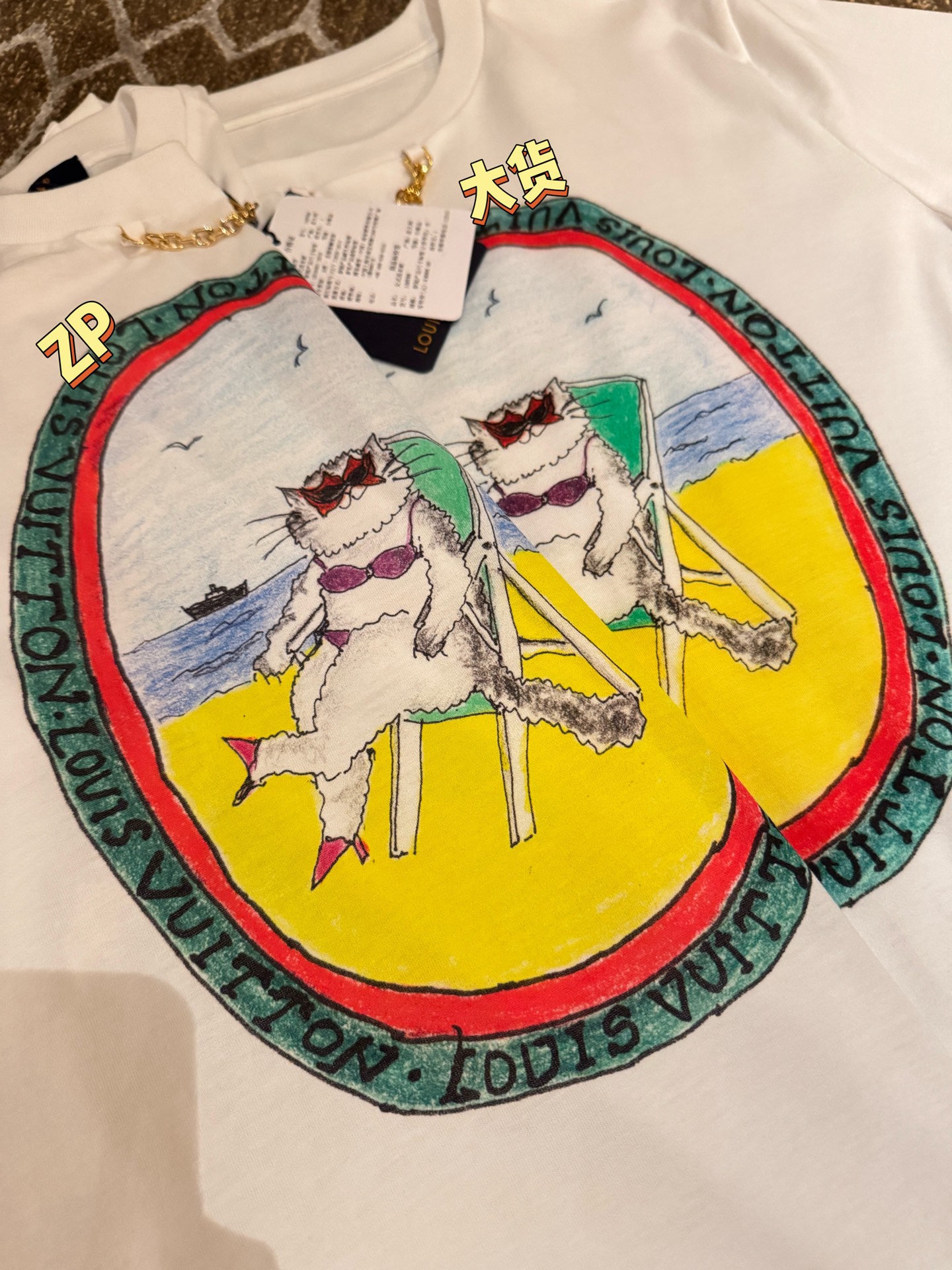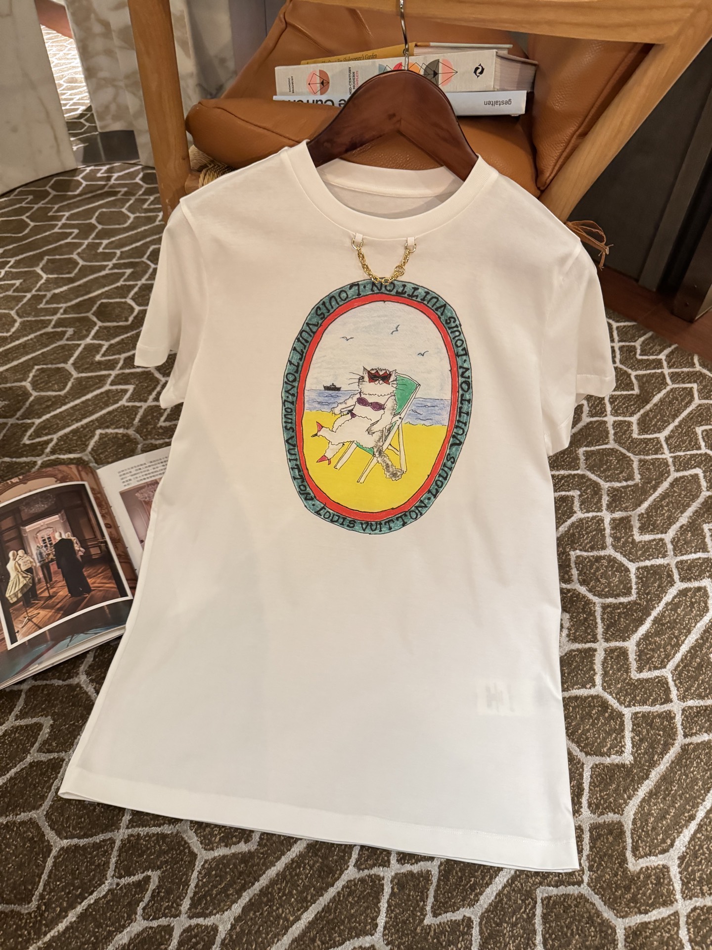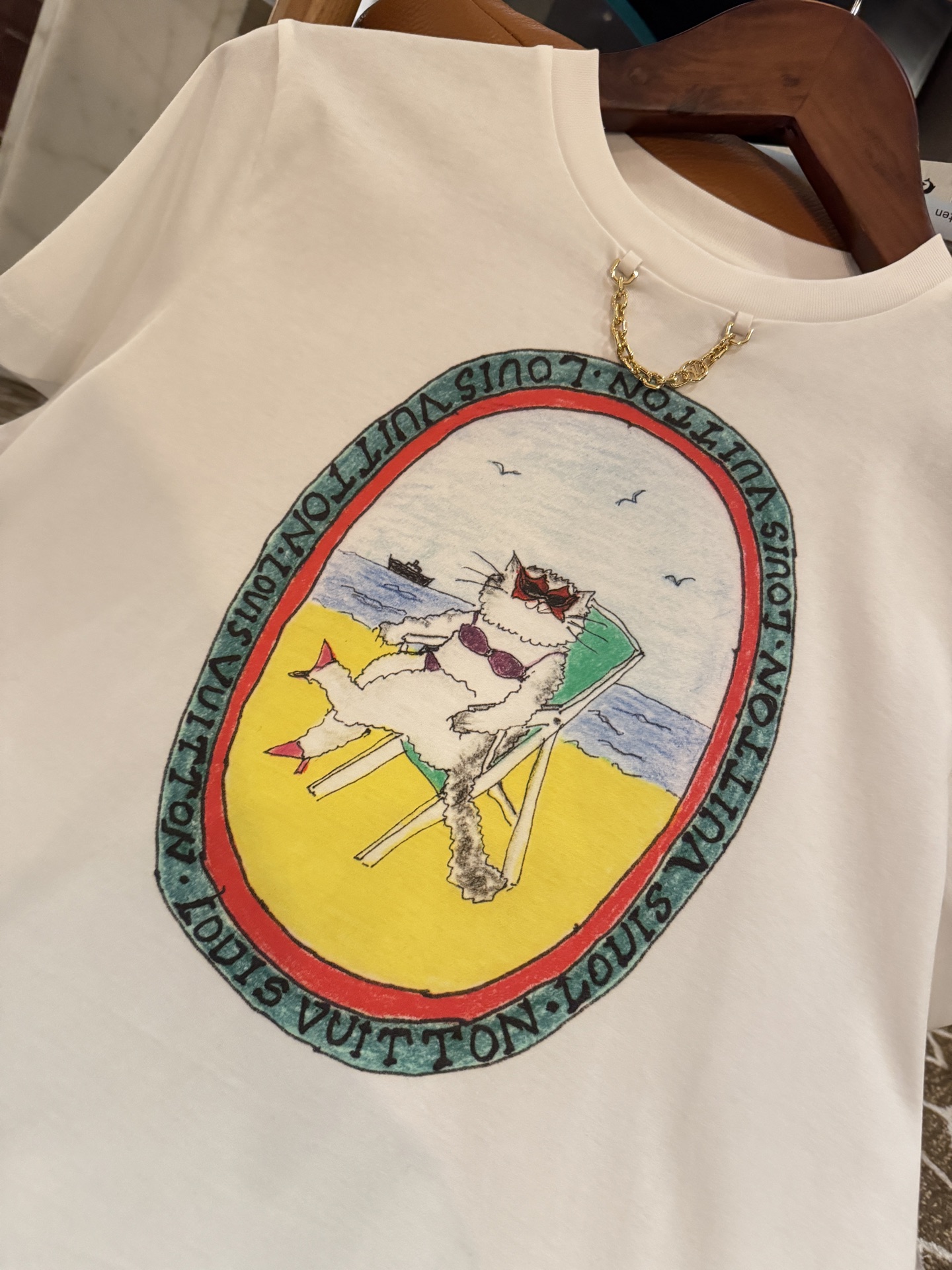 驴家 25年新品✖️Grace·Coddington联名的猫猫系列 白色猫猫度假风中长款印花T恤(KX*MM)