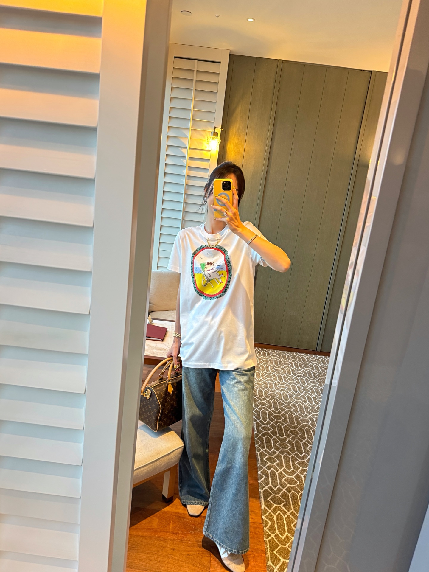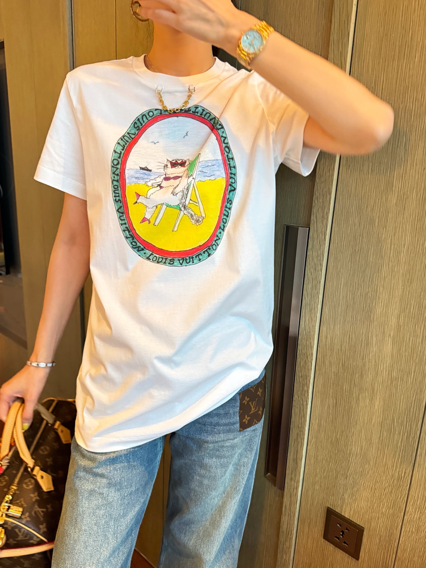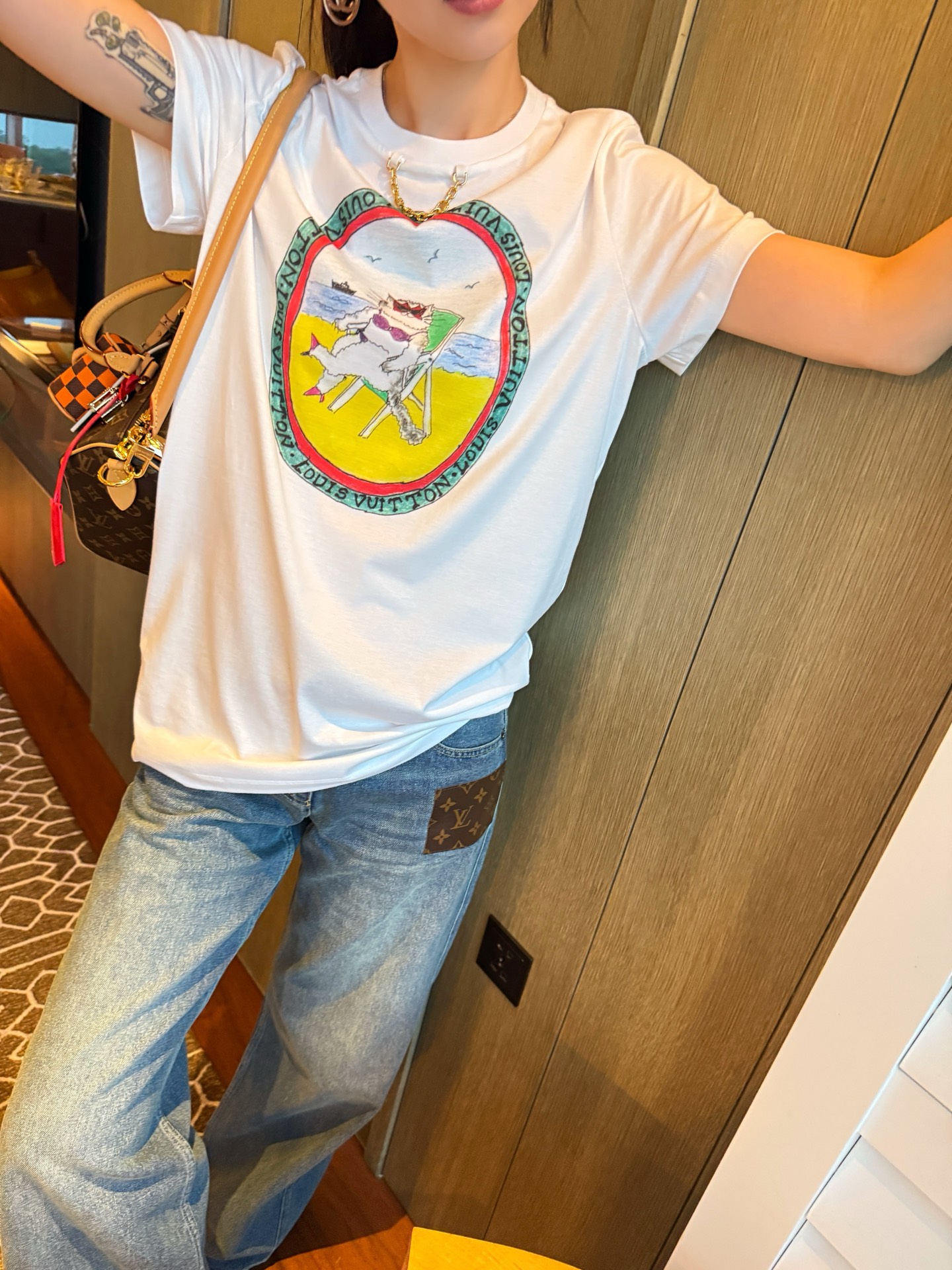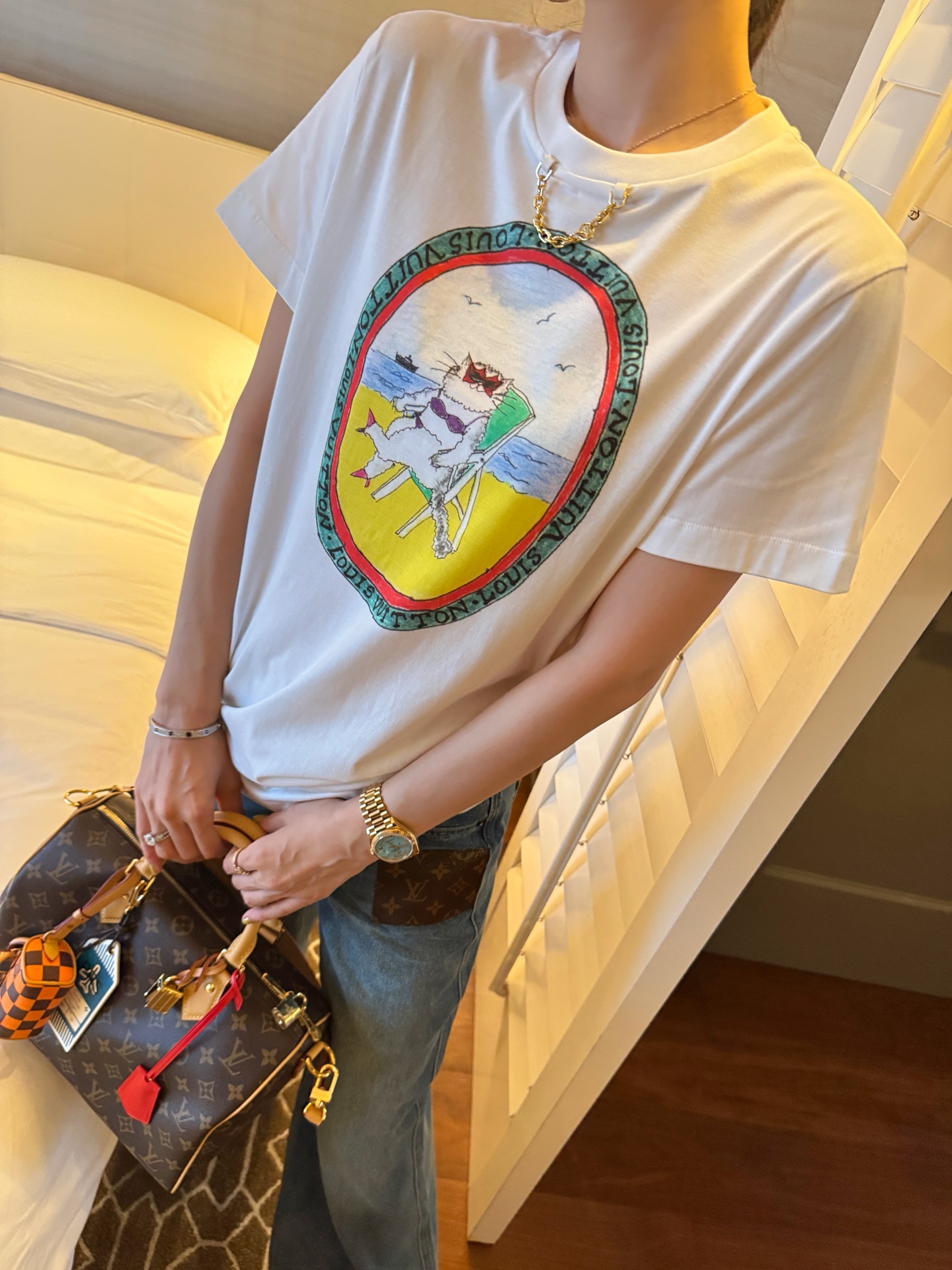 25年新品🆕✖️Grace·Coddington联名的猫猫系列☑️白色猫猫度假风中长款印花T恤,非常规版型、盖PP的版型非常显瘦!!胸前饰有多巴胺配色猫猫图案🐱 品质非常高级〰️完美不挑身材🤩 人手必备款 ⚠️搭配很简单✨舒适休闲 没什么束缚感👍上身不挑人😜可轻松驾驭🤩码数SML
