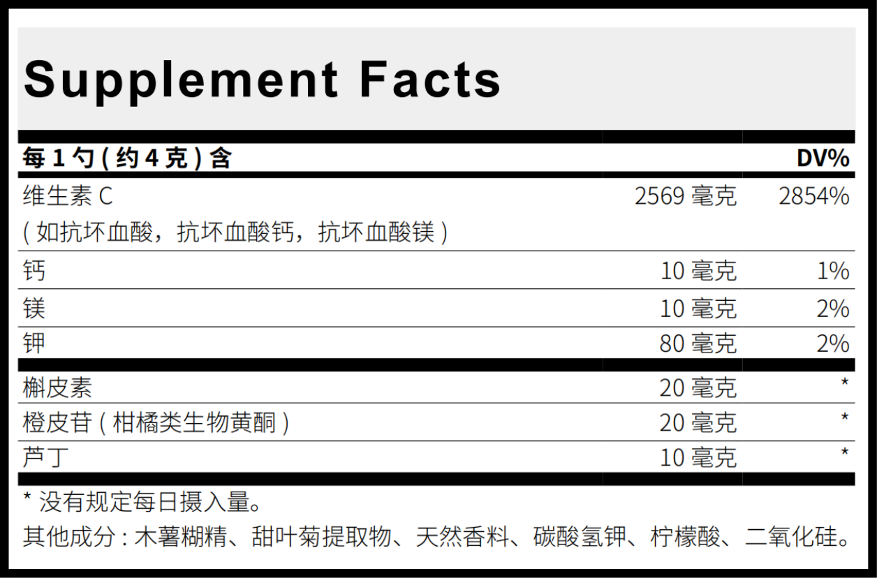 Vitamin C with Bioflavonoids Powder是一款美味的缓冲维生素C粉剂。每勺橙味粉末提供超过2500毫克的维生素C。配方额外添加了几种有益的生物类黄酮,包括槲皮素、橙皮苷和芦丁。类似气泡水的口感让维生素C的补充变得更加轻松。