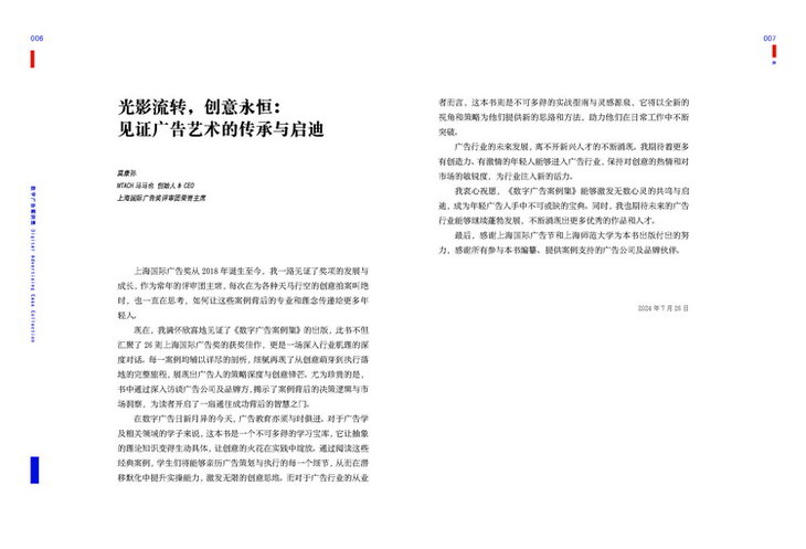 本案例集源自2023-2024年度上海国际广告节所汇聚的600余则优秀案例,深入剖析并提炼出2023-2024年度中国广告市场及品牌视角下的六大核心议题:故事叙述、跨界营销、市场前瞻、环境社会及治理标准(ESG)、文化自信与品牌共鸣以及实效营销。针对每一议题,精心挑选了具有典范意义的实战案例,并通过与广告公司及品牌方的深度对话,详尽再现了各案例的策划初衷、执行细节及最终成效。本书不仅细致描绘了创意的灵光一闪,更深入挖掘了策略构思与市场洞察的精髓。这不仅是对2023-2024年度广告行业实践的全面梳理,更是一本为广告学及相关领域学子、广告业者、市场营销专员,以及对广告产业保持热切关注的读者量身打造的实用指南。