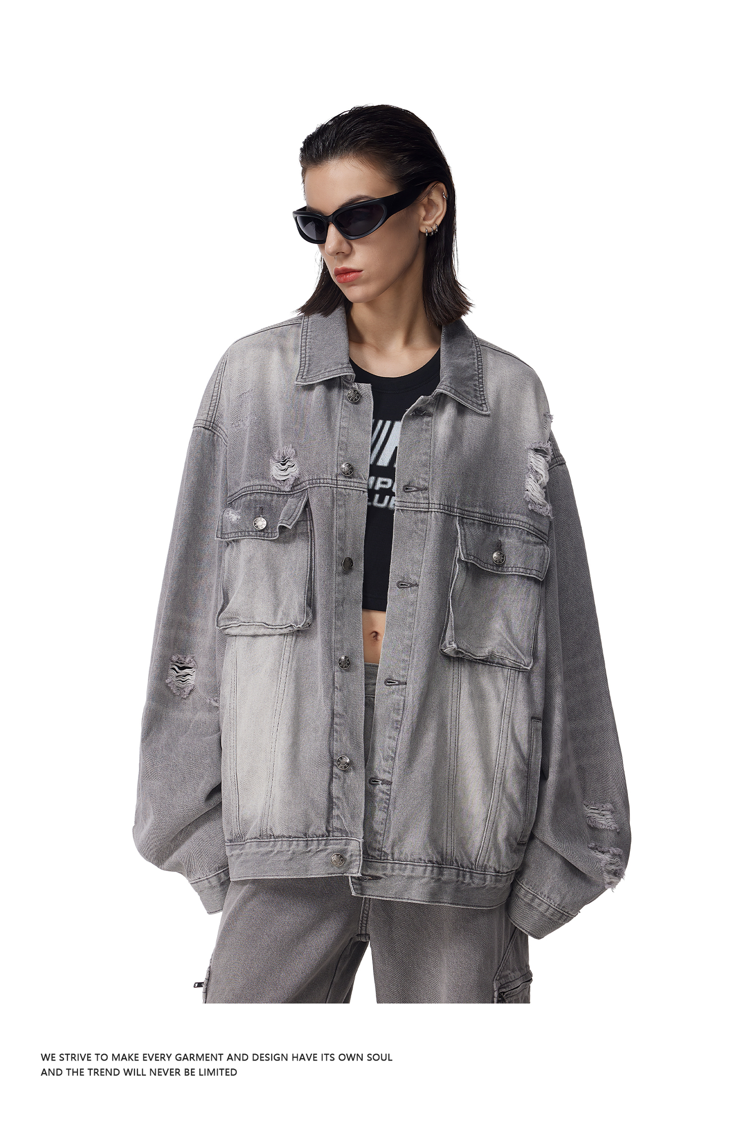 FDR官方店 立体工装袋破洞牛仔外套男女秋季翻领宽松情侣装上衣