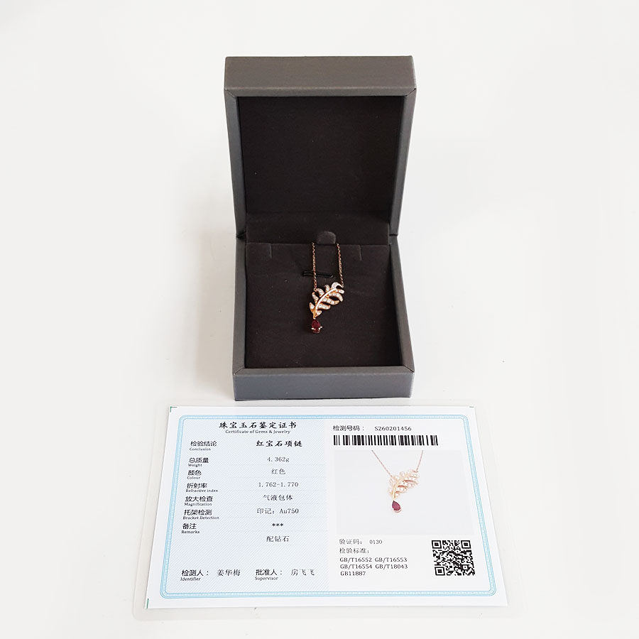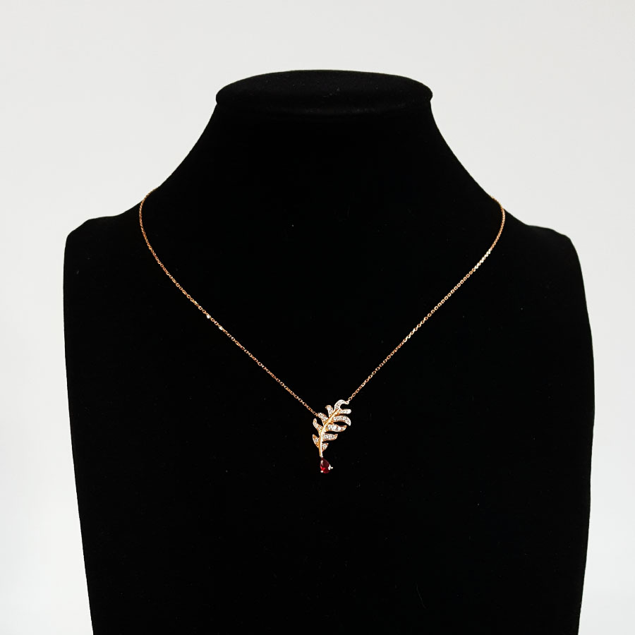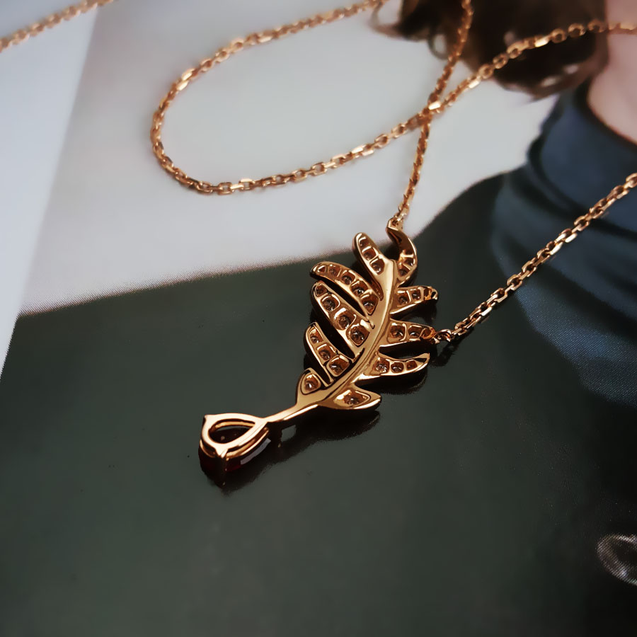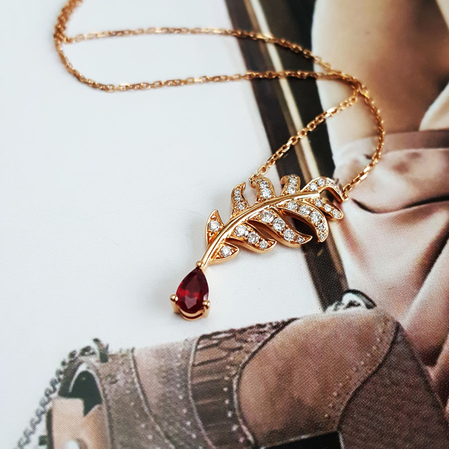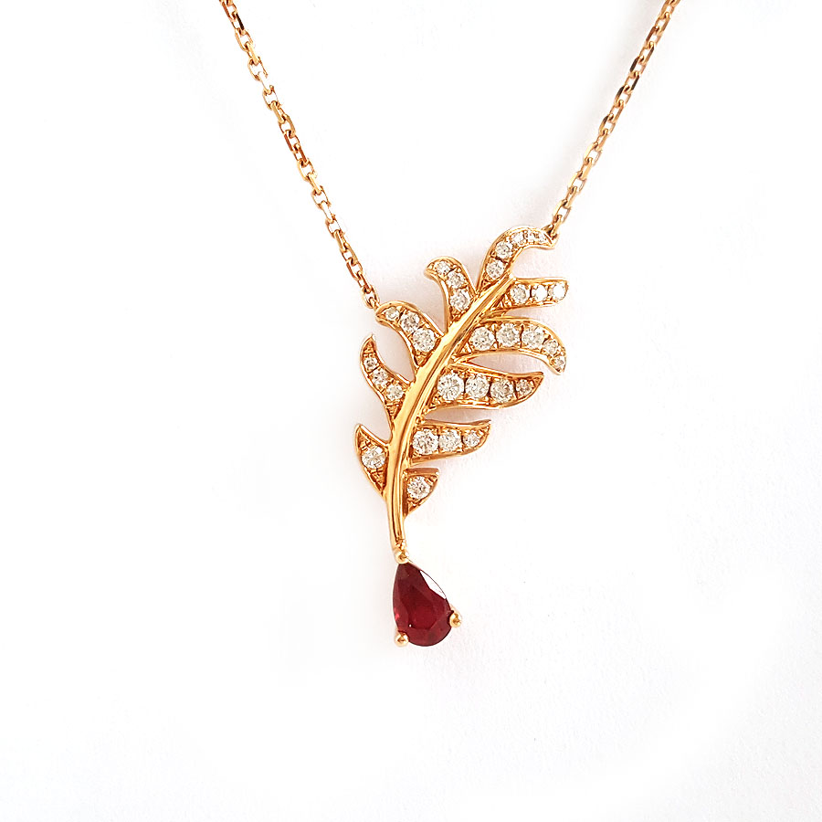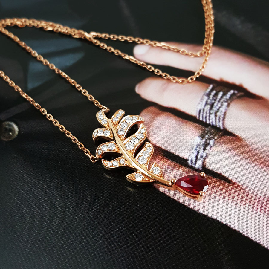 名称 | AU750玫瑰金镶钻镶天然羽毛造型鸽血红0.50克拉红宝石吊坠项链 |