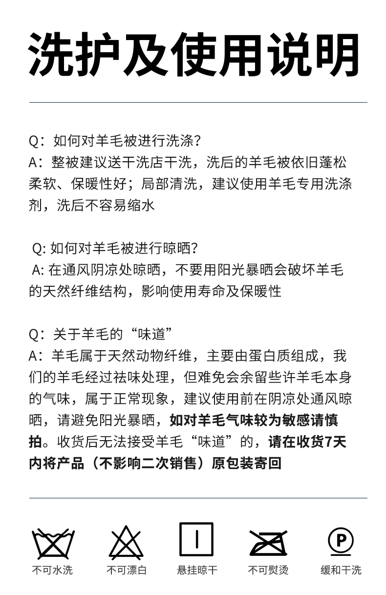 品名:一默羊毛被 规格: 200*230CM:总重约2.7KG,填充重量约1.8KG 220*240CM: 总重约3.1KG,填充重量约2.1KG 产地及发货地:浙江 发货时间:下单一般48小时内发货(周末、节假日除外) 发货快递:韵达/中通(以实际发货为准,暂不支持指定快递) 运费政策:该商品全国部分地区包邮(新疆、西藏、内蒙古、青海、宁夏、甘肃、海南需补差运费50元/件,港澳台不发货,请知悉) 售后政策:本品包装配件完整、未拆封、不影响二次销售支持7天无理由退换货(无运费险),不支持拦截与拒收,请知悉 温馨提醒:因显示器像素差异与拍摄灯光原因,图片与实物颜色可能存在些许色差,具体请以收到实物为准。 |