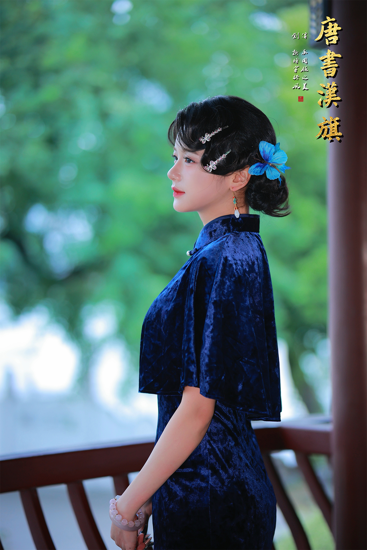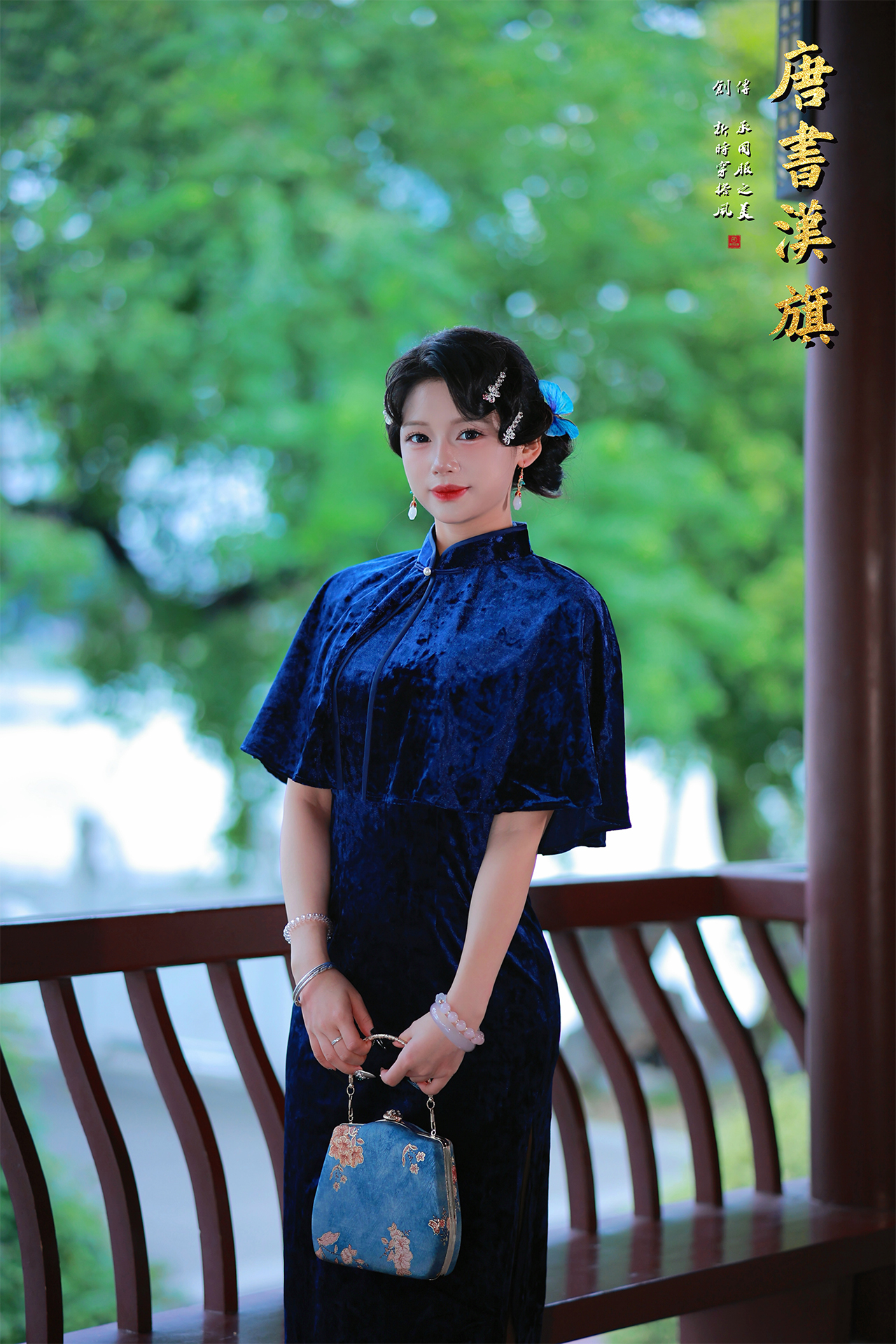 【蓝金点翠】复古丝绒面料,质感高级奢华,经典立领设计搭配别致斗篷式袖型,勾勒优雅曲线,尽显民国名媛风情。精致配饰加持,从日常出街到宴会社交,轻松驾驭多种场合,让你在时光里邂逅东方韵致,演绎国风之美。