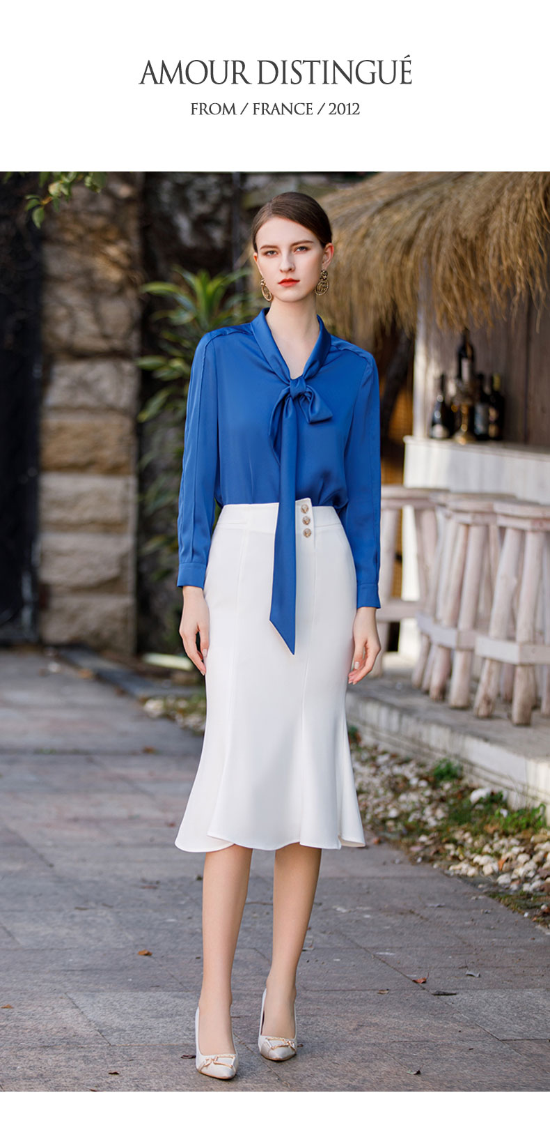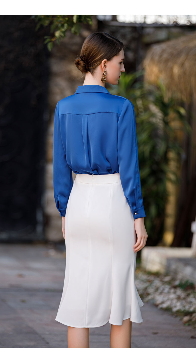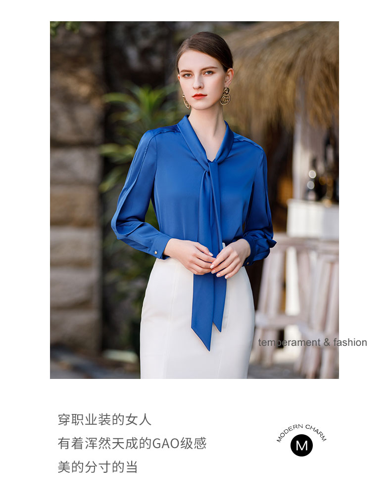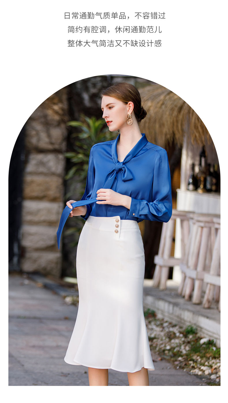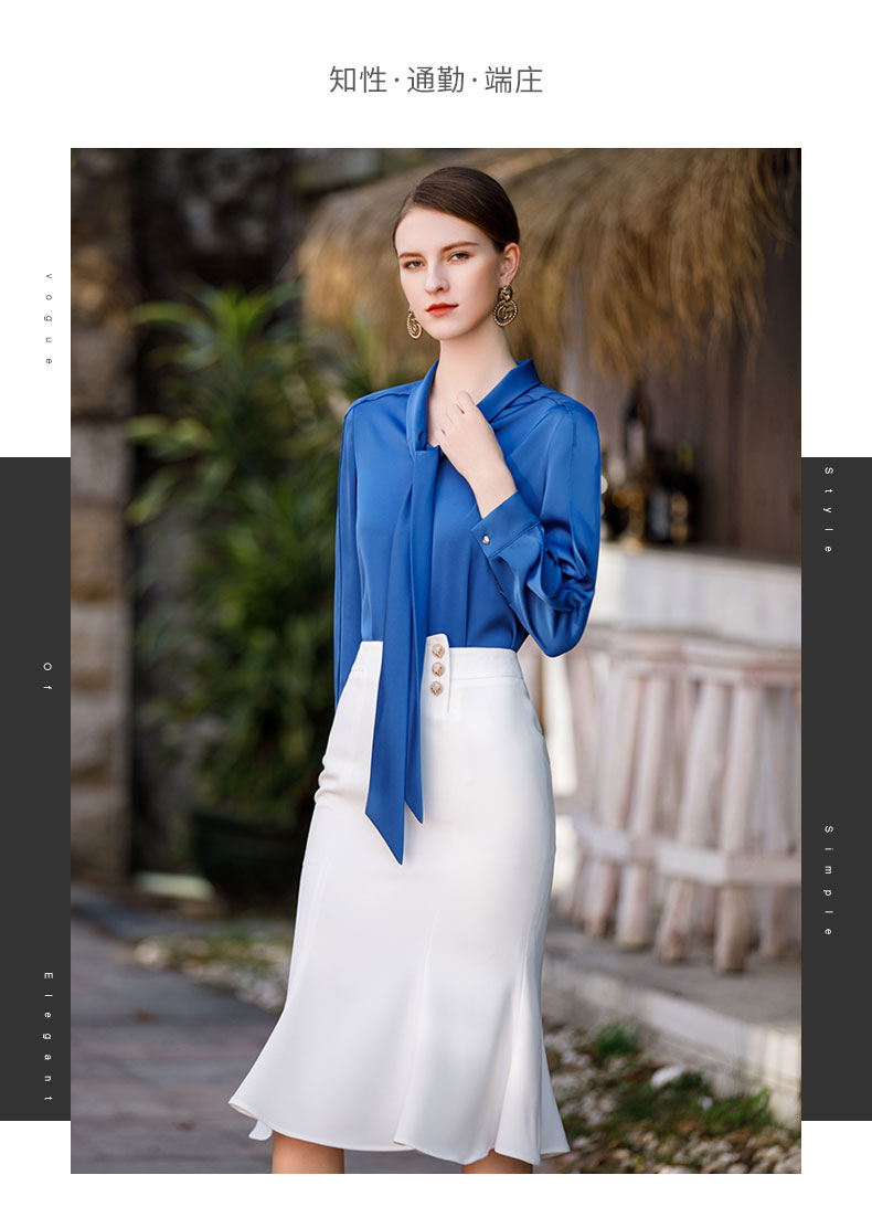 AD气质宝蓝色衬衫女高级设计感系带圆领长袖上衣ol通勤衬衣职业装