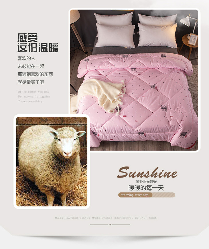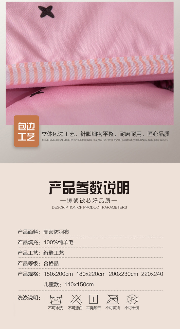 选用亲肤防钻毛面料,结合先进的防钻毛技术,不钻毛,而且手感柔软;普通的面料,容易钻毛,光泽暗沉,密度也比较稀疏,容易钻毛,澳洲超细羊毛平均直径19.6-20.5微米,更细腻保暖透气